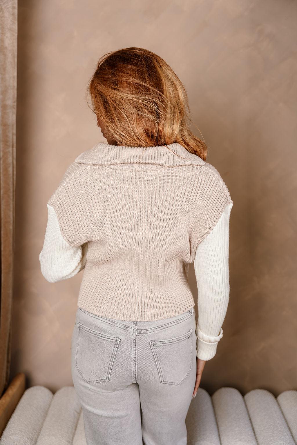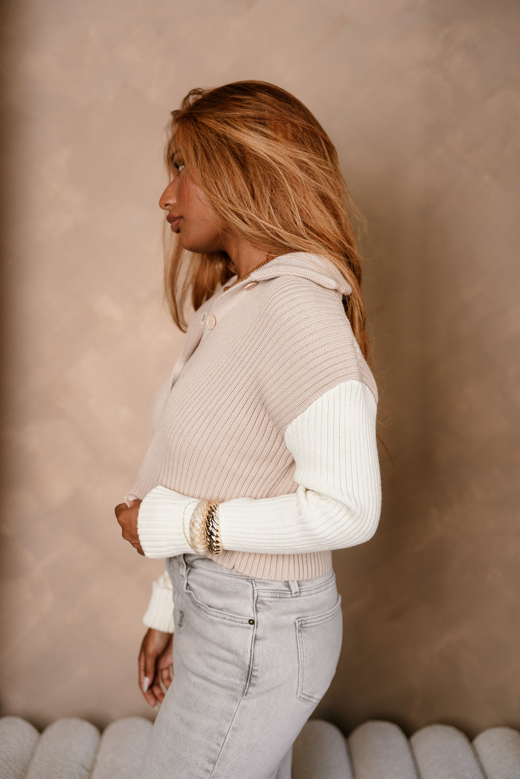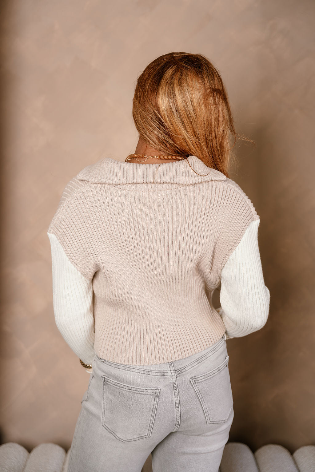 Cozy with a modern twist, the Liana Taupe & Cream Cable Knit Cardigan features soft taupe and cream cable knit fabric with chic colorblock detailing. Designed with a collar neckline and front button-up closure, it’s finished with folded cuffs and long sleeves for a relaxed, polished look. Perfect for adding warmth and texture to your everyday style.