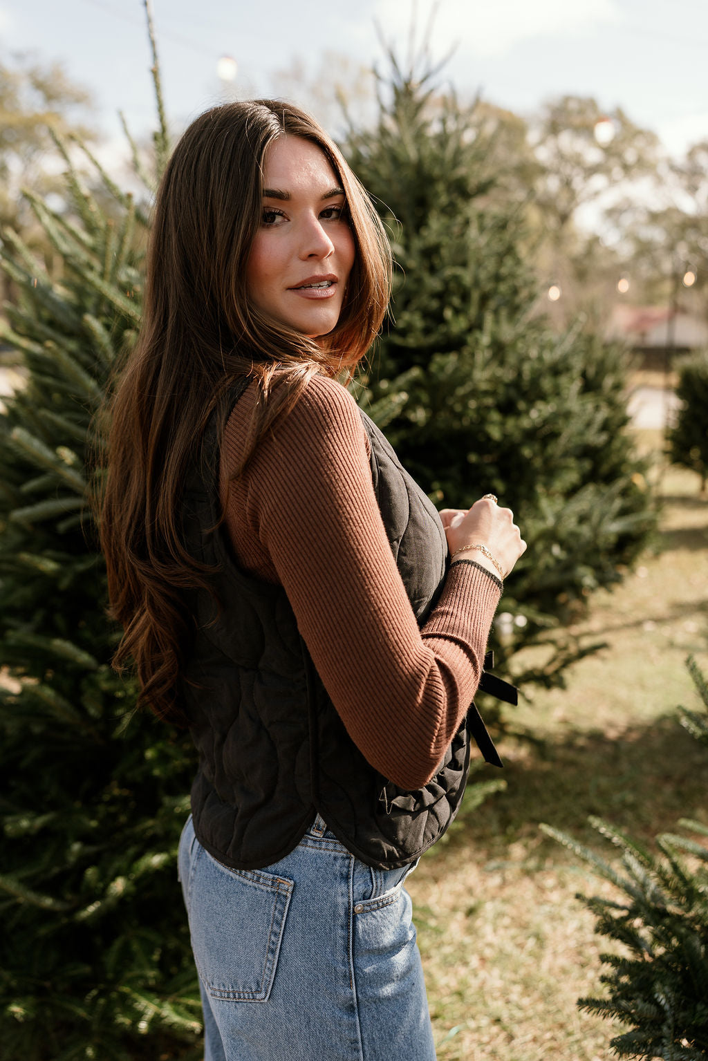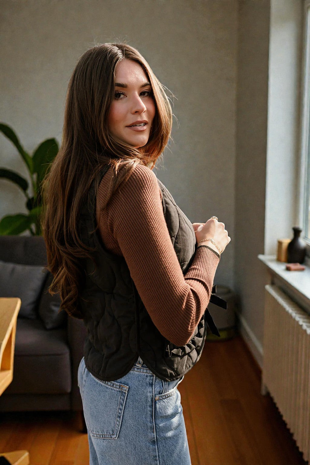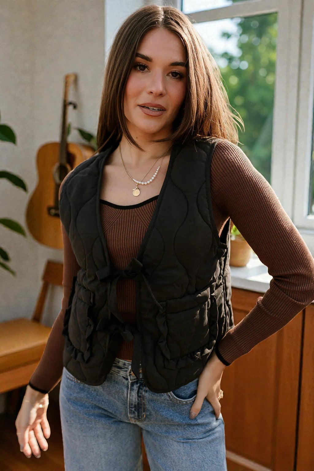 The standout details include front ruffle pockets that combine function with feminine flair, and front ties that create a customizable, flattering fit while adding a playful touch. Lightweight yet cozy, the vest provides warmth and style without compromising mobility.