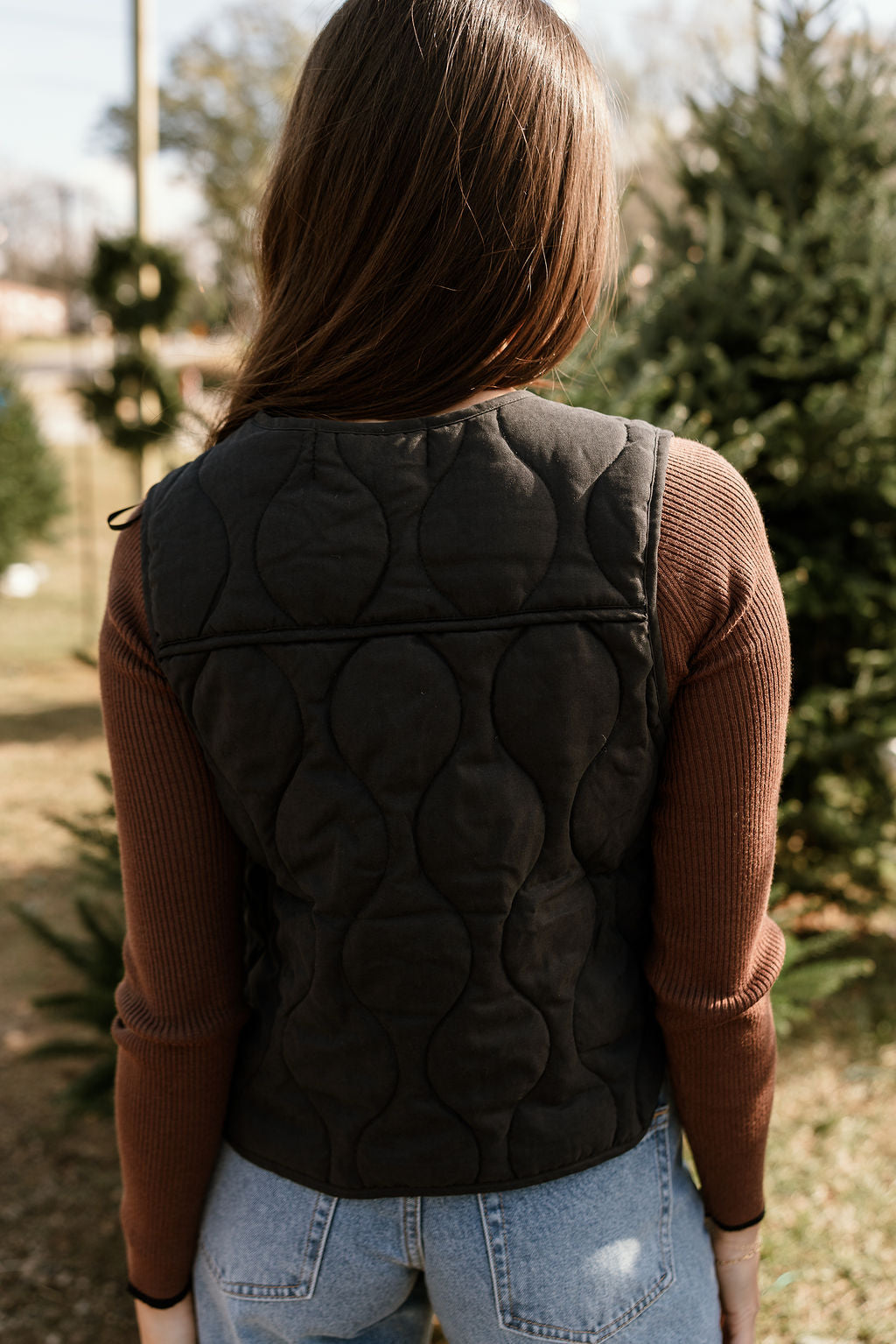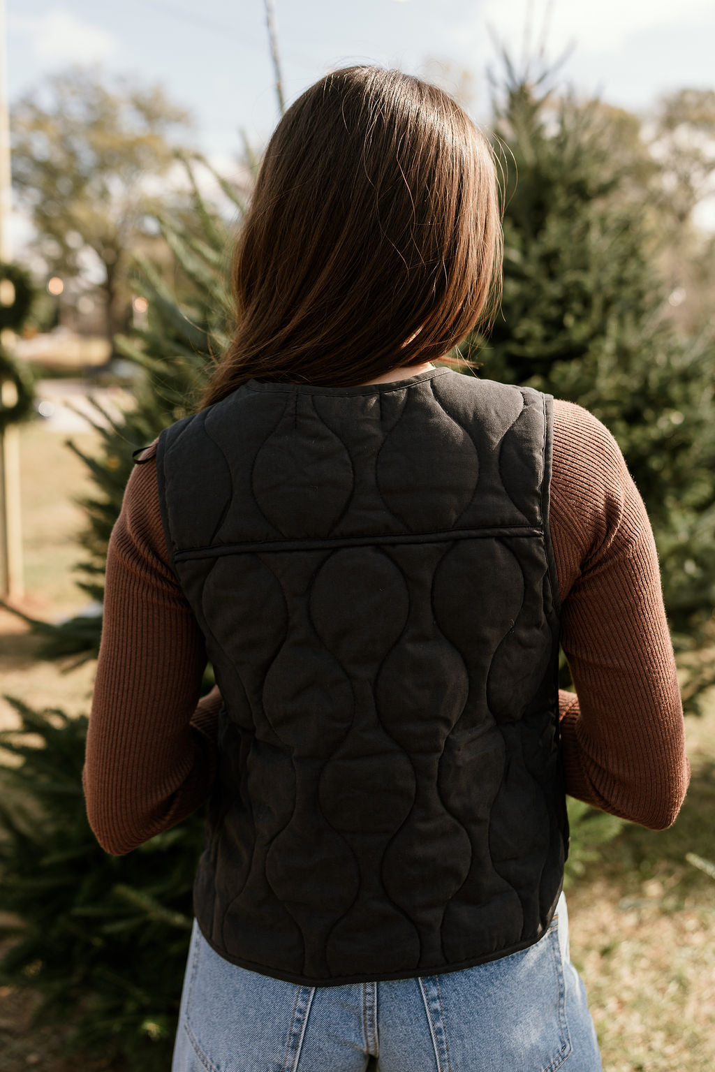 Chic, lightweight, and effortlessly stylish, the Lila Black Front Ties Vest is the perfect layering piece for transitional seasons. Crafted from black puffer fabric, this vest features a subtle monochrome wavy print that adds texture and visual interest to your outfit. Its sleeveless design allows for easy layering over sweaters, long sleeves, or tops without adding bulk.