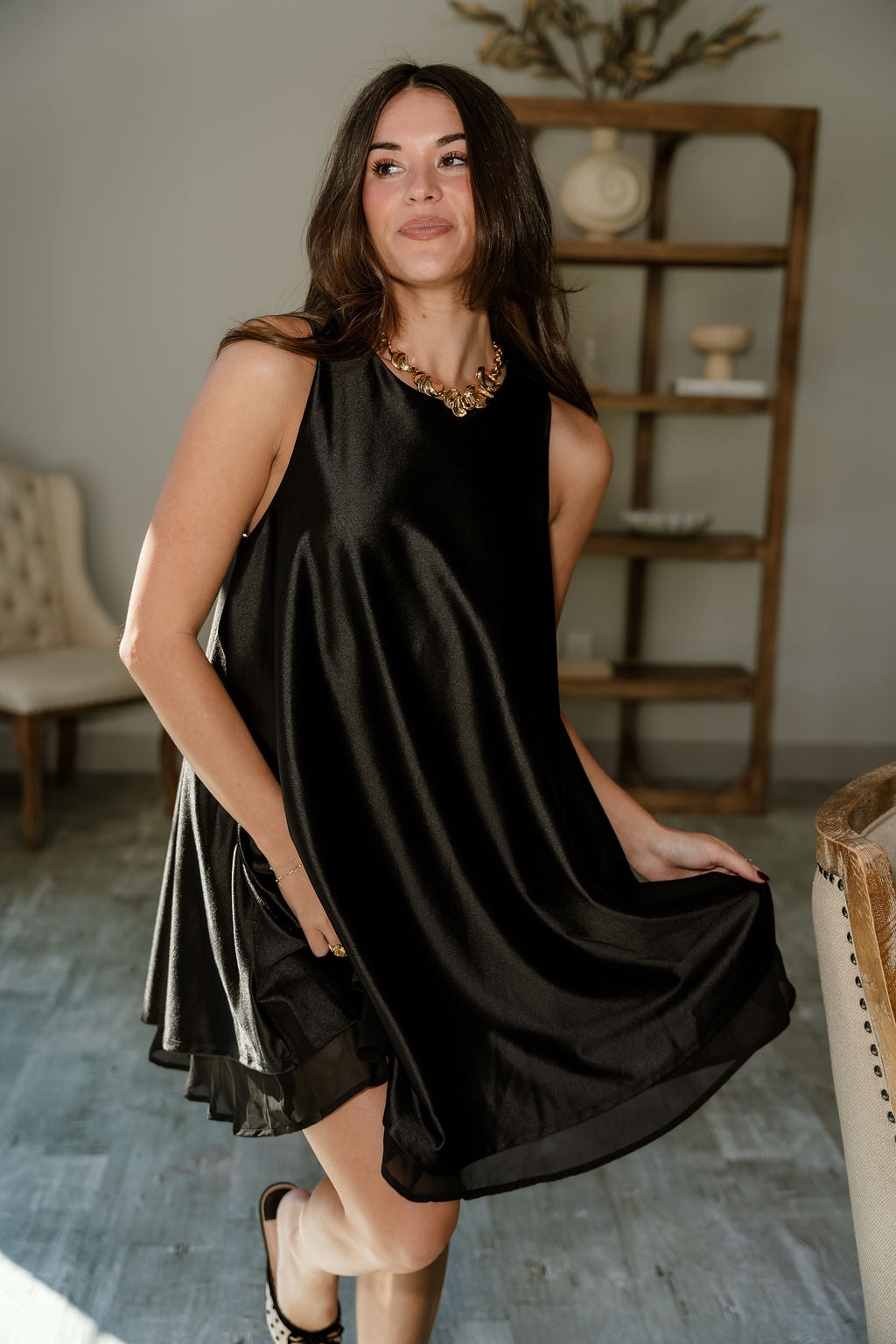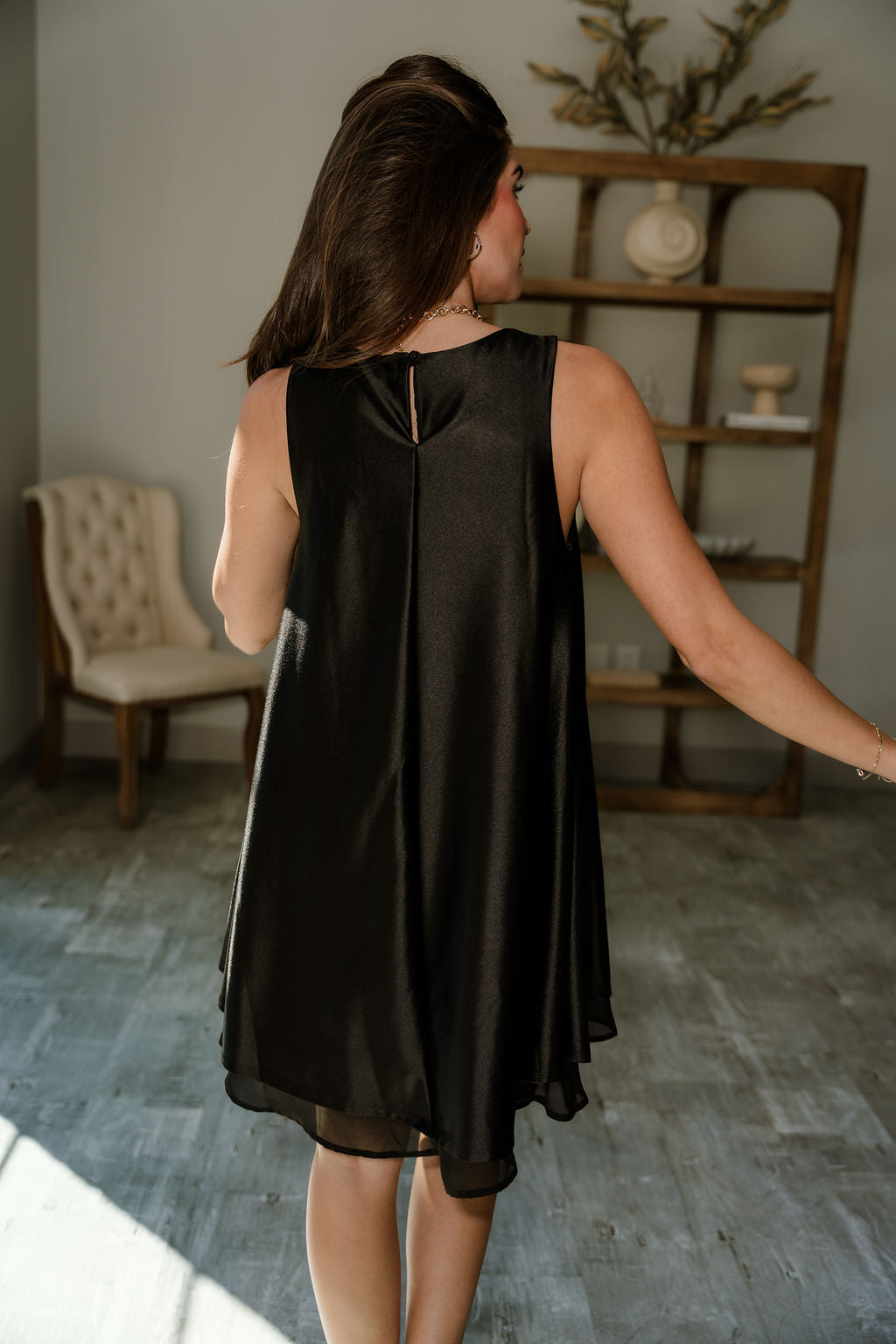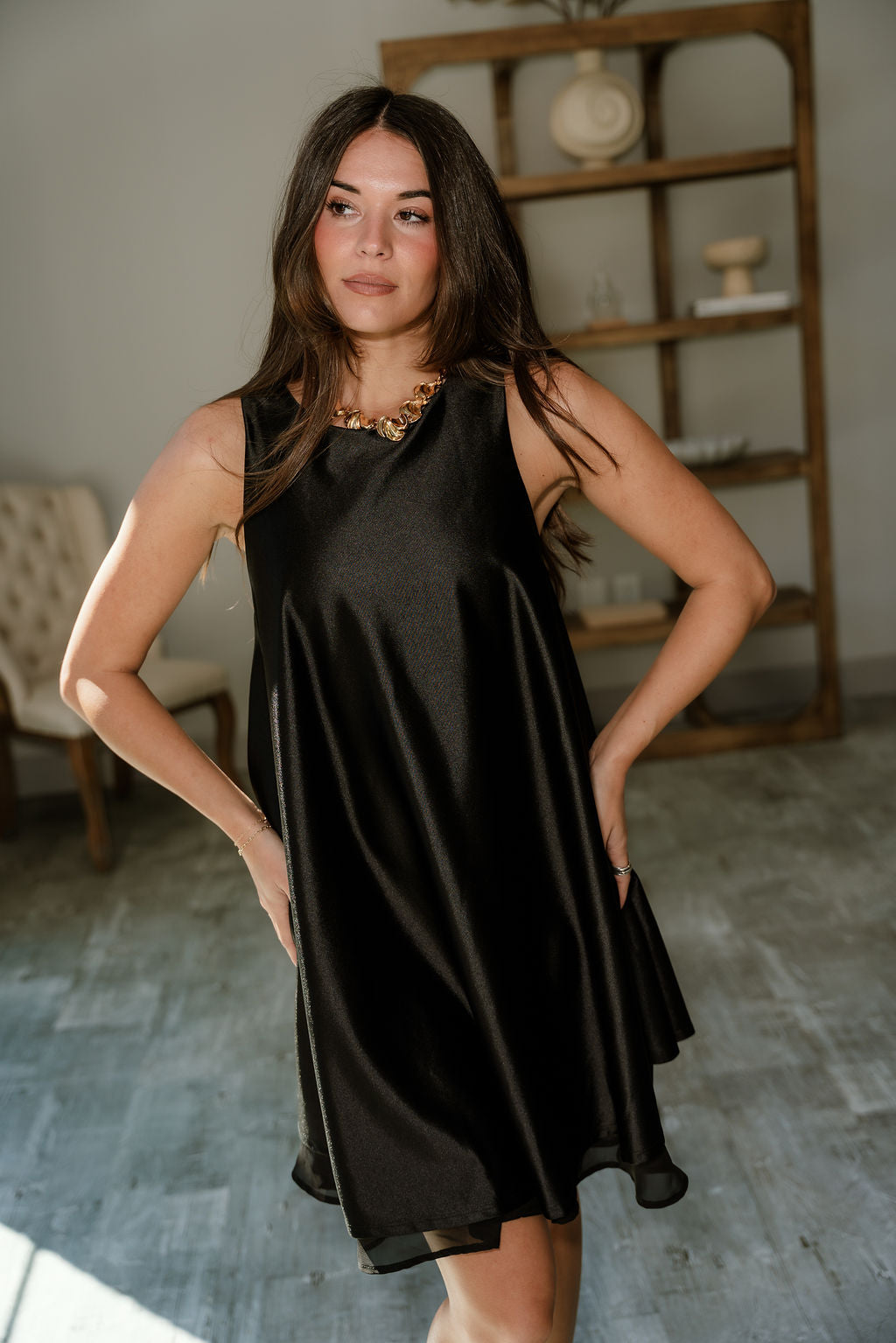 Sleek, sophisticated, and effortlessly chic, the Lilah Black Satin Mini Dress is a wardrobe essential for any occasion. Crafted from lustrous black satin with a smooth black lining, this sleeveless mini dress offers a flattering, streamlined silhouette. The classic round neckline keeps the design timeless, while the back button closure adds a polished finishing touch. Perfect for date nights, cocktail parties, or evening events, the Lilah dress combines elegance and modern style in one striking piece.