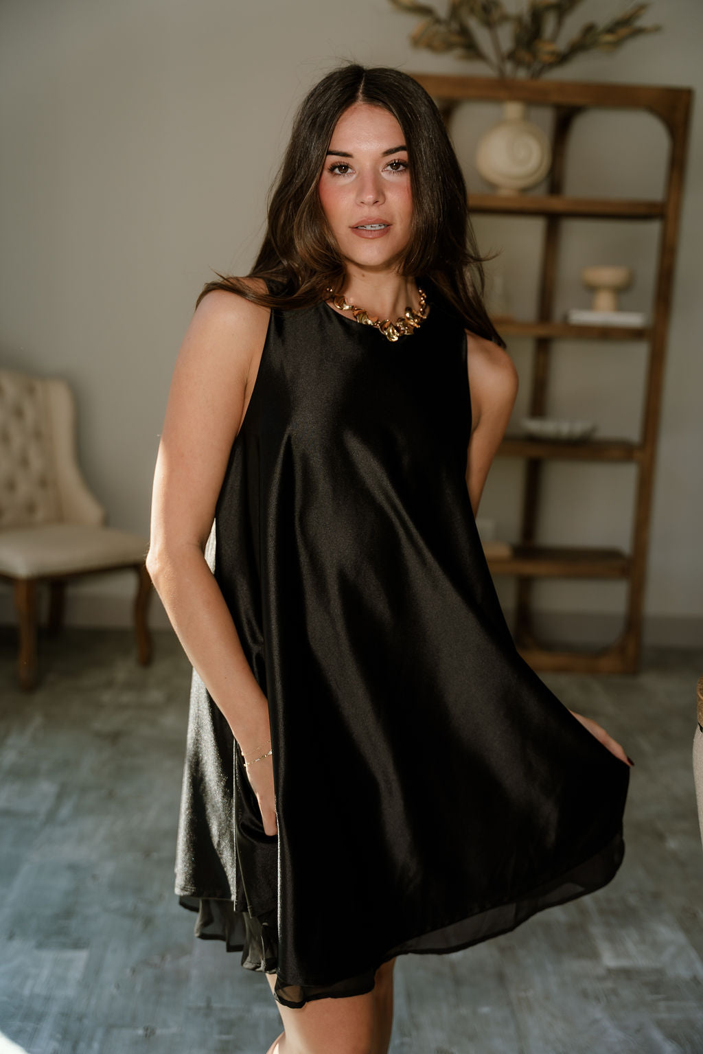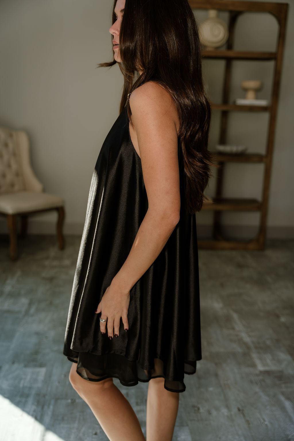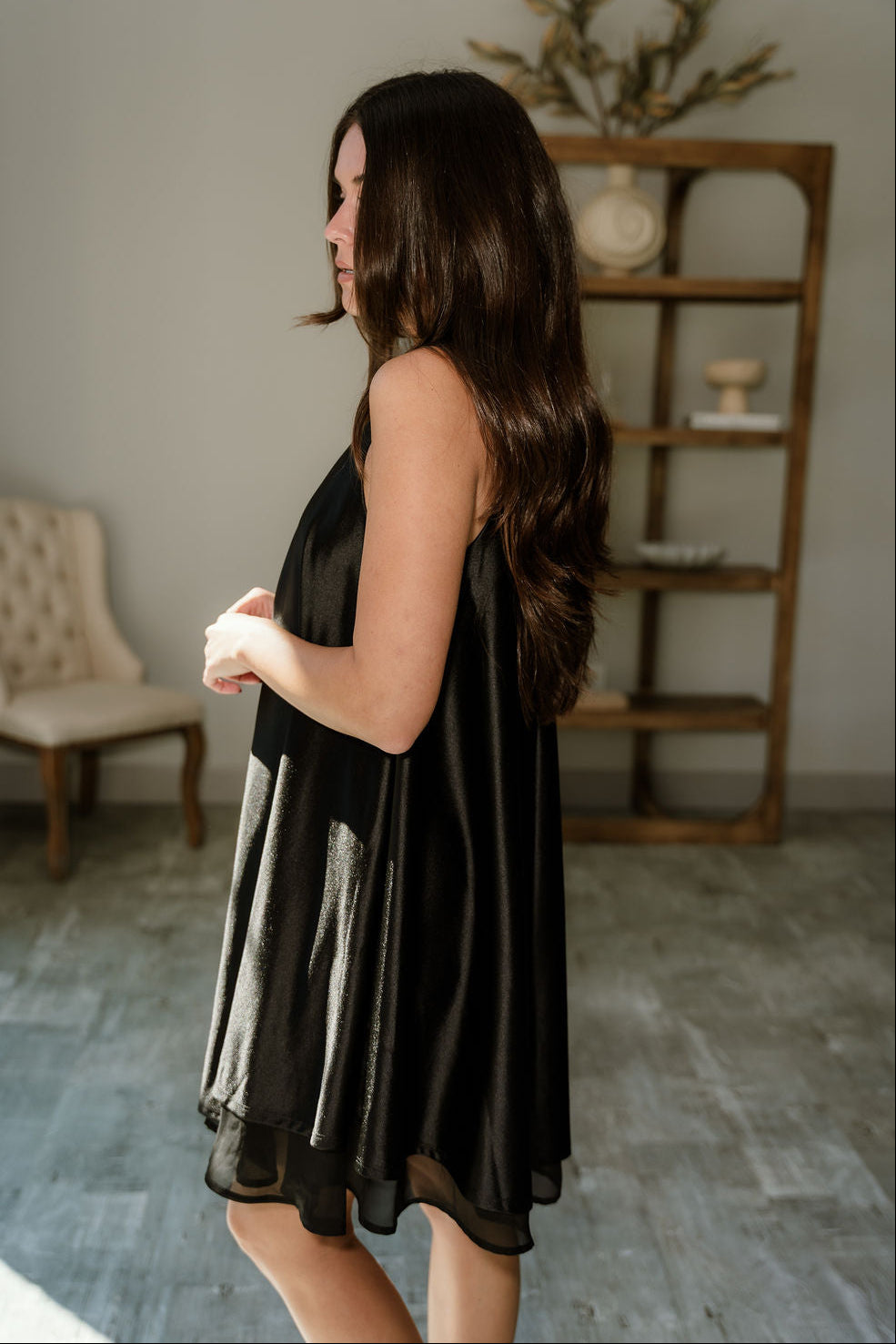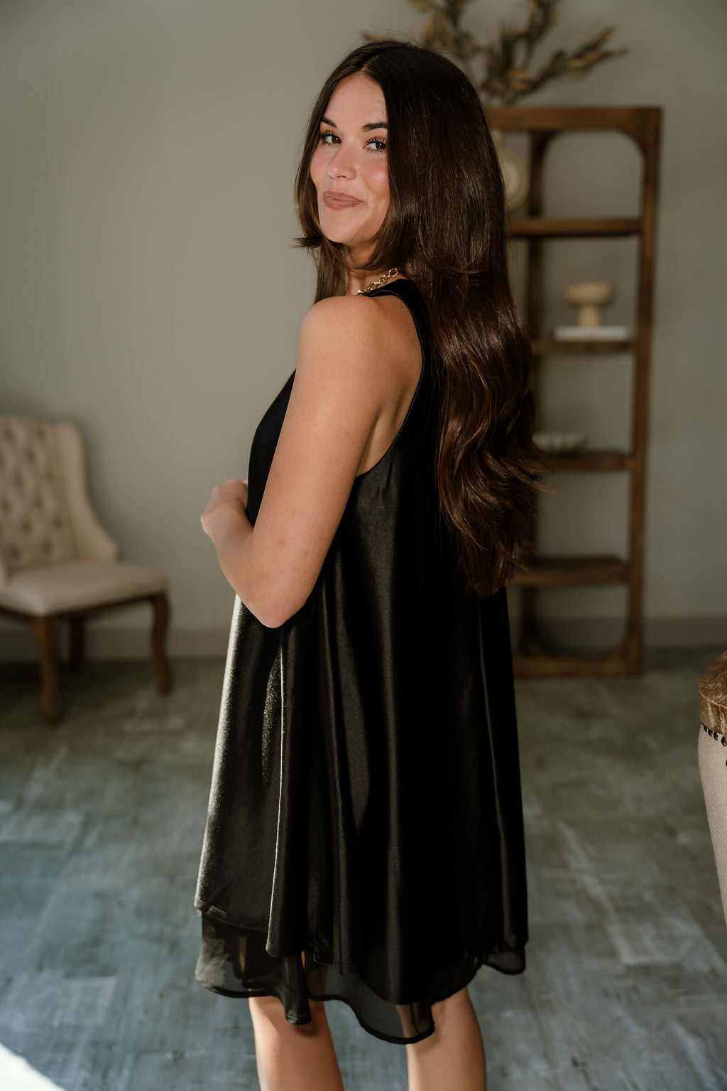 Sleek, sophisticated, and effortlessly chic, the Lilah Black Satin Mini Dress is a wardrobe essential for any occasion. Crafted from lustrous black satin with a smooth black lining, this sleeveless mini dress offers a flattering, streamlined silhouette. The classic round neckline keeps the design timeless, while the back button closure adds a polished finishing touch. Perfect for date nights, cocktail parties, or evening events, the Lilah dress combines elegance and modern style in one striking piece.