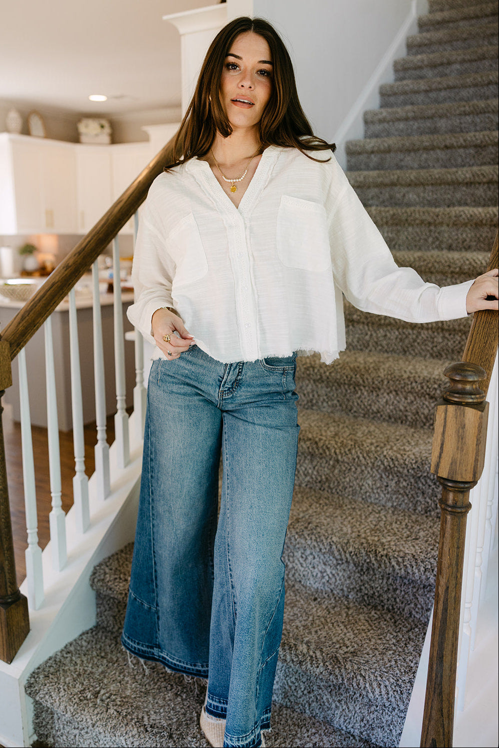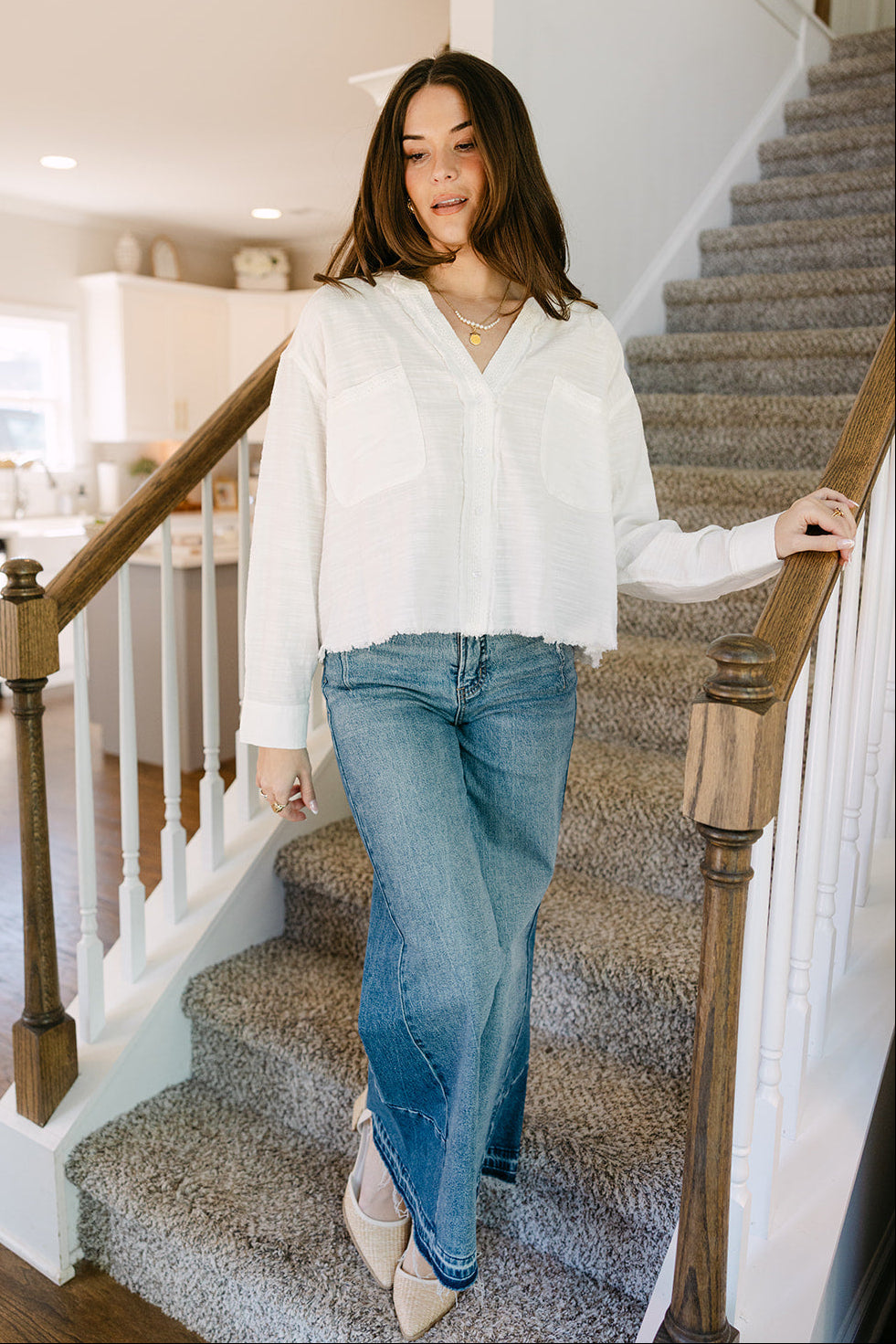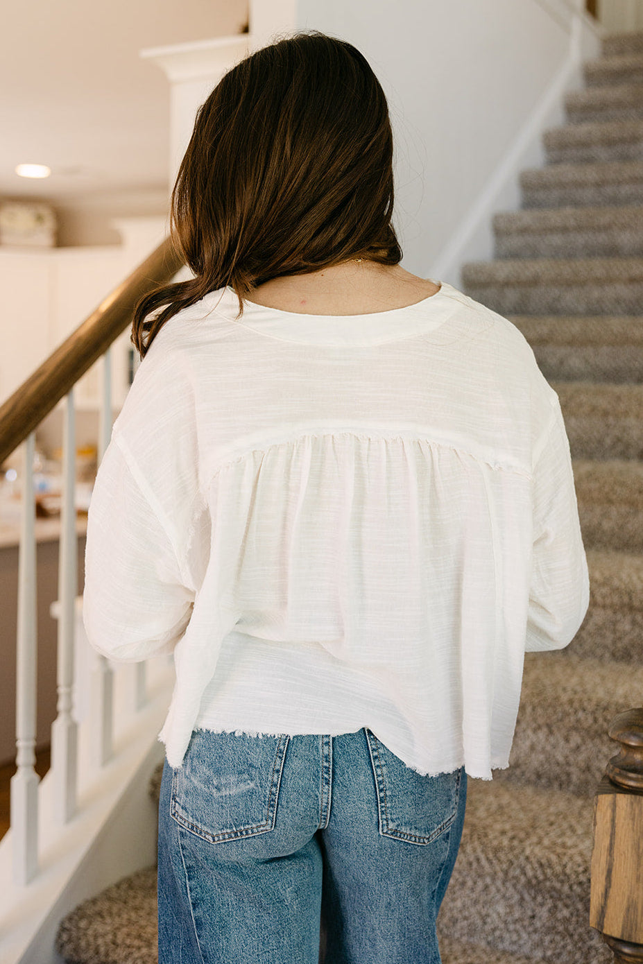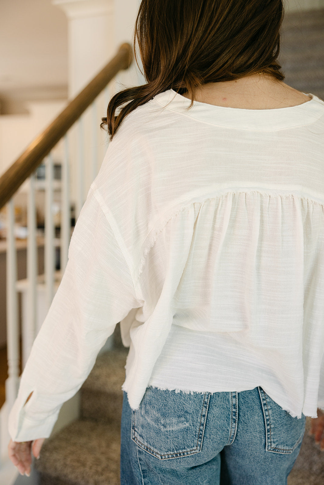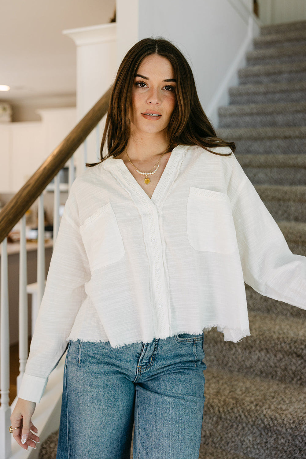 Long sleeves with buttoned cuffs complete the look, providing structure and versatility for rolling or layering. Perfect for pairing with high-waisted jeans, skirts, or shorts, the Lillian White Frayed Long Sleeve Top brings casual charm, modern edge, and everyday comfort to any wardrobe.