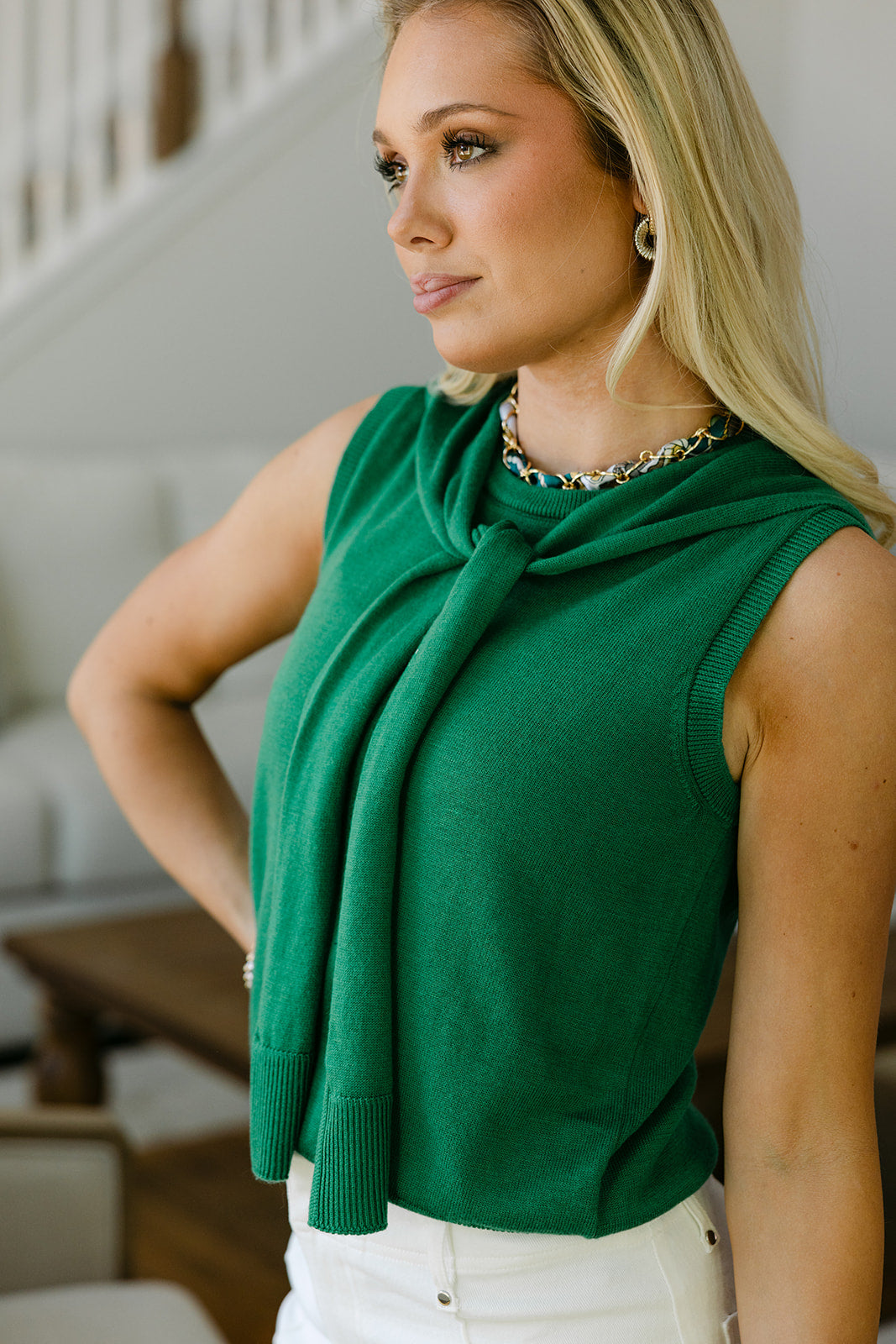 Designed sleeveless for easy layering or solo wear, the Livie Tank pairs effortlessly with jeans, shorts, skirts, or wide-leg pants. Its vibrant green hue and chic shoulder detail make it perfect for casual outings, weekend brunches, or relaxed summer days.