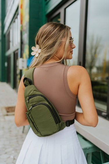 The Long Trip Ahead Sling Bag features olive fabric, crossbody shoulder style, two front pockets with zipper closure, black hardware and adjustable strap.