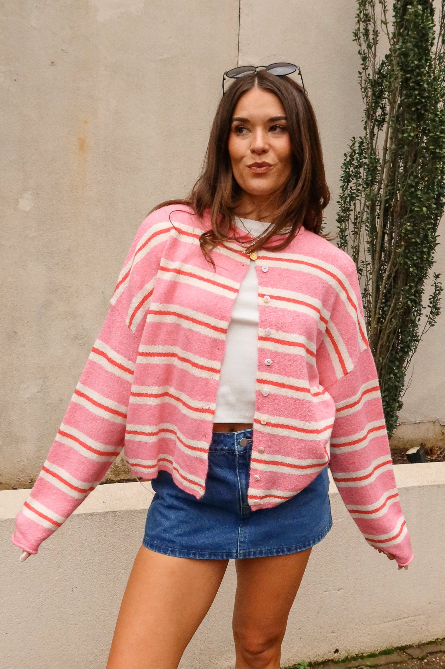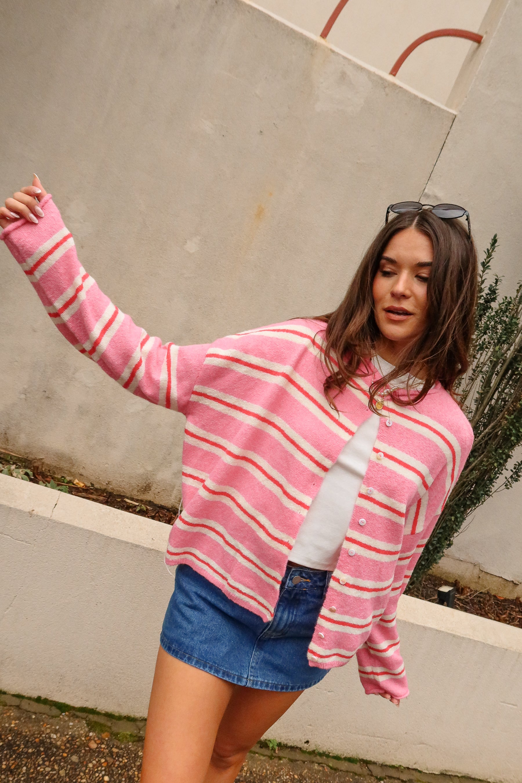 Lucia Pink & Red Stripe Button-Up Cardigan