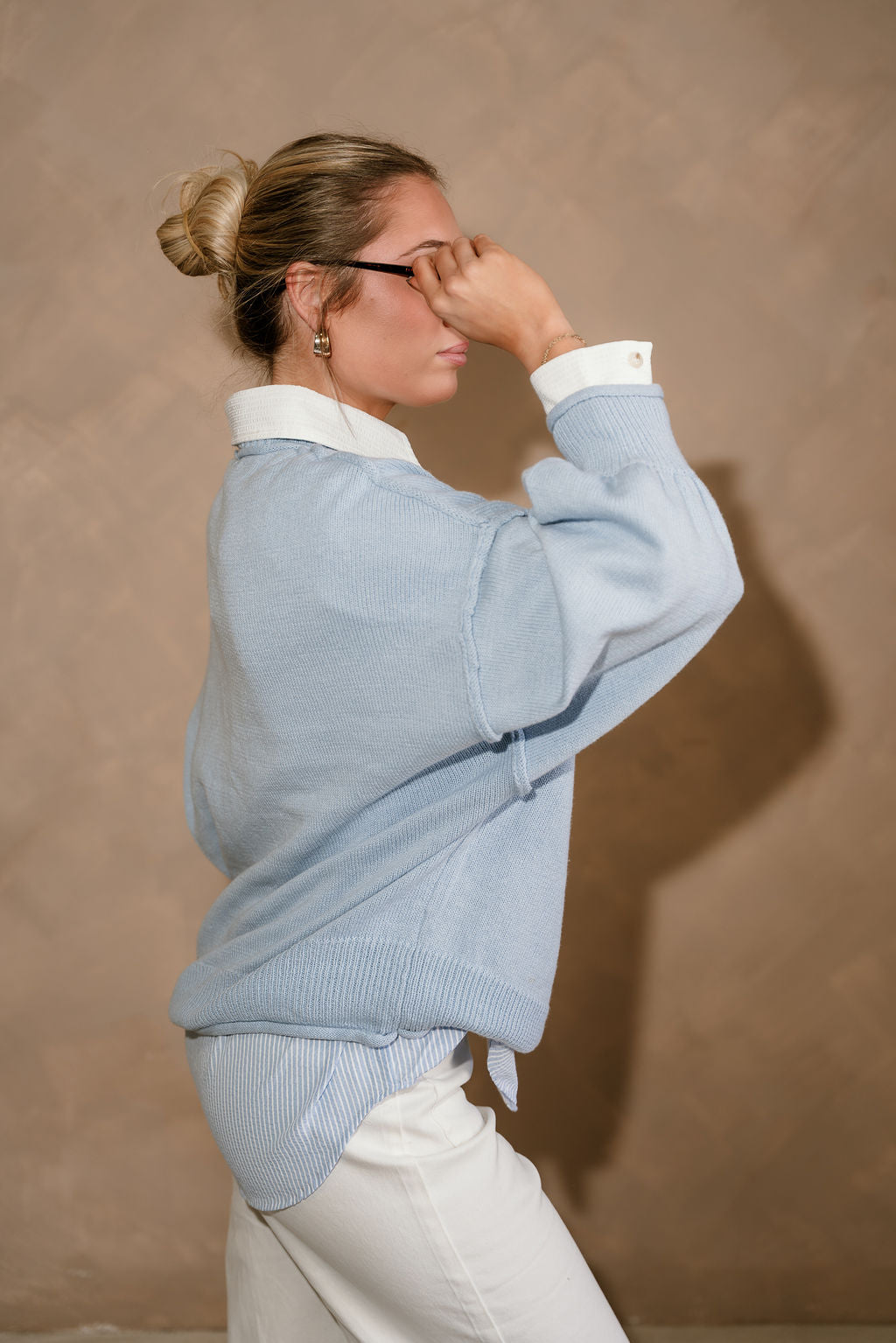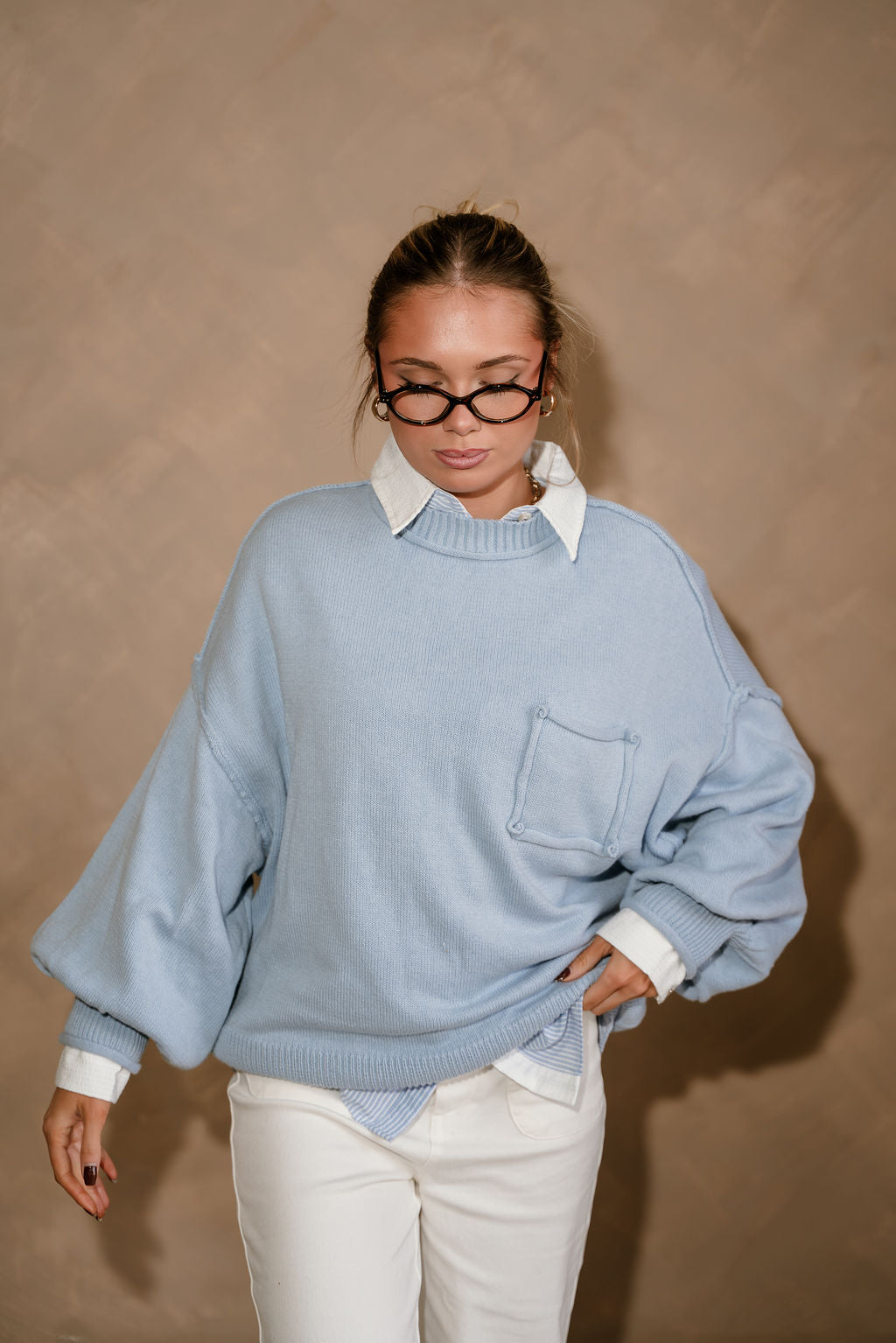 The Luna Light Blue Knit Sweater is a cozy essential with charming details. Designed in a soft light blue knit fabric, this sweater features a classic round neckline and a front chest pocket for a touch of casual style. Long balloon sleeves add volume and a modern silhouette, while the ribbed hem provides a polished finish. Easy to style and endlessly comfortable, the Luna sweater is perfect for pairing with your favorite denim or layering over everyday looks.