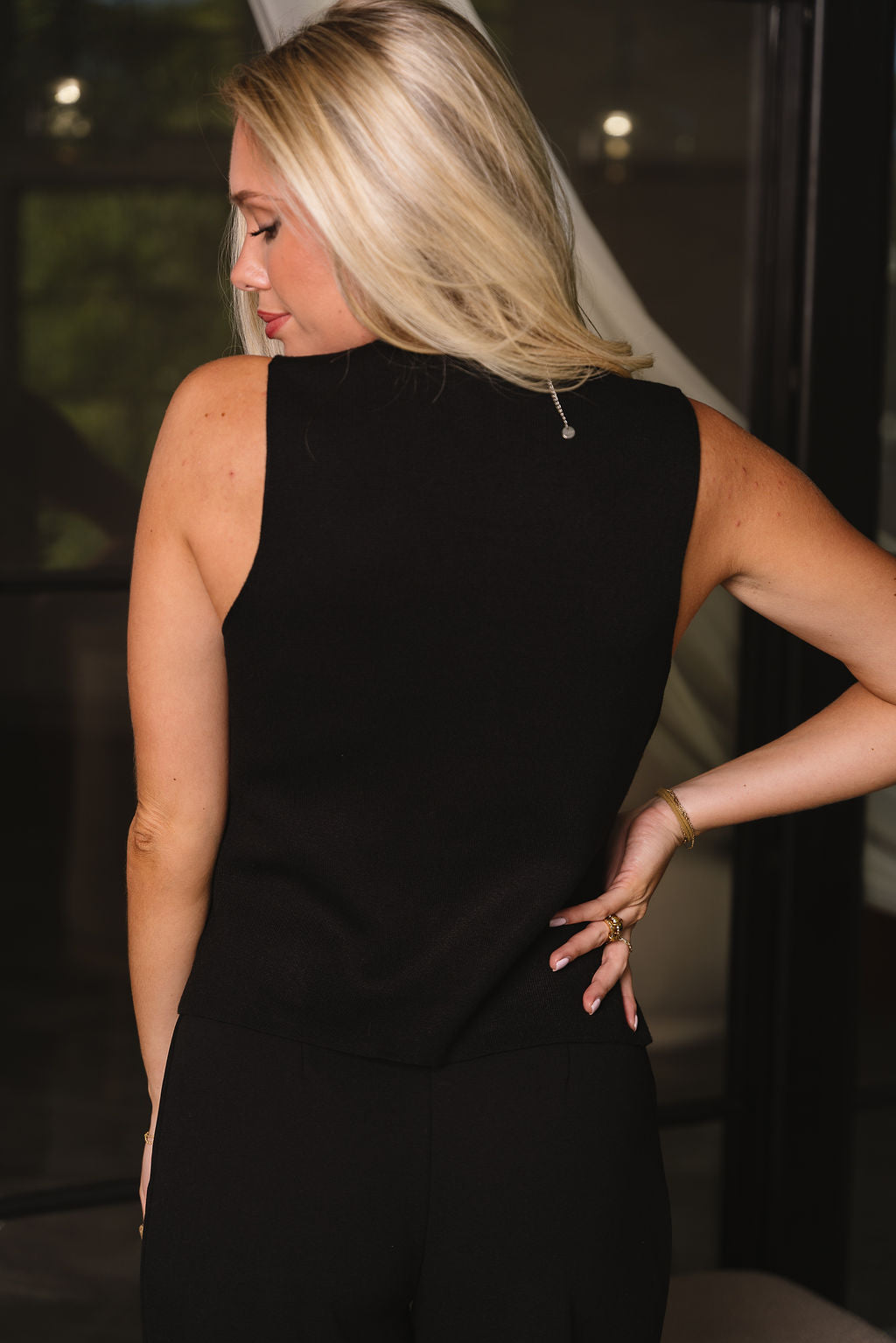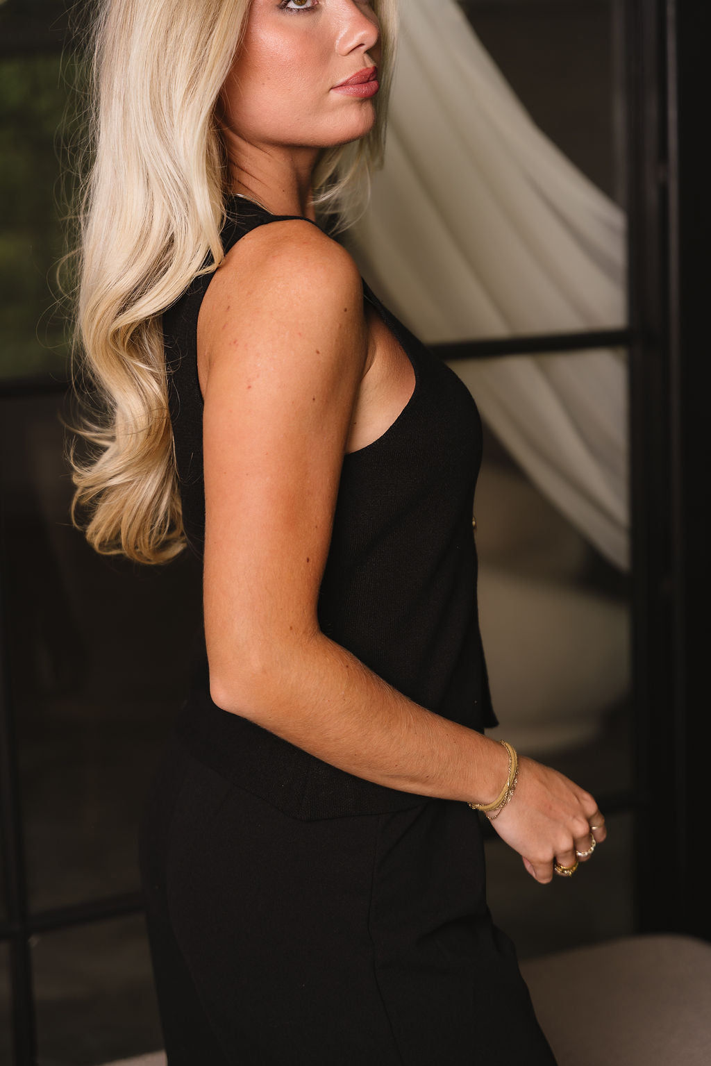 Sophisticated and modern, the Lydia Black Gold Button-Up Tank is a versatile wardrobe essential. Crafted from soft black knit fabric, it features a flattering v-neckline, sleeveless design, and a split v hem for added movement. Hammered gold button-up details elevate the look with a touch of luxe, making it perfect for pairing with tailored pants or skirts for a polished, chic outfit.