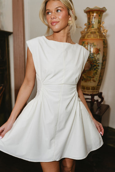 The Lyra White Boat Neck Mini Dress is the perfect mix of elegance and ease. Made from lightweight white fabric, it feels breathable and comfortable for all-day wear. The mini length keeps the look fresh and modern, while the round boat neckline adds a refined touch. Sleeveless and effortlessly chic, this dress is ideal for warm weather. Plus, the cinched side details create a flattering silhouette that enhances your natural shape.