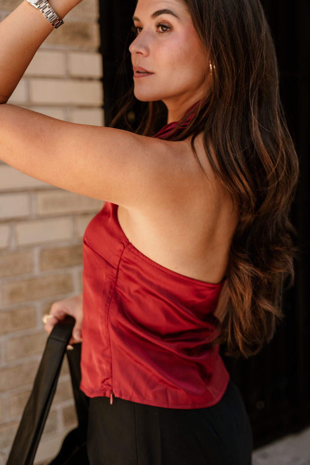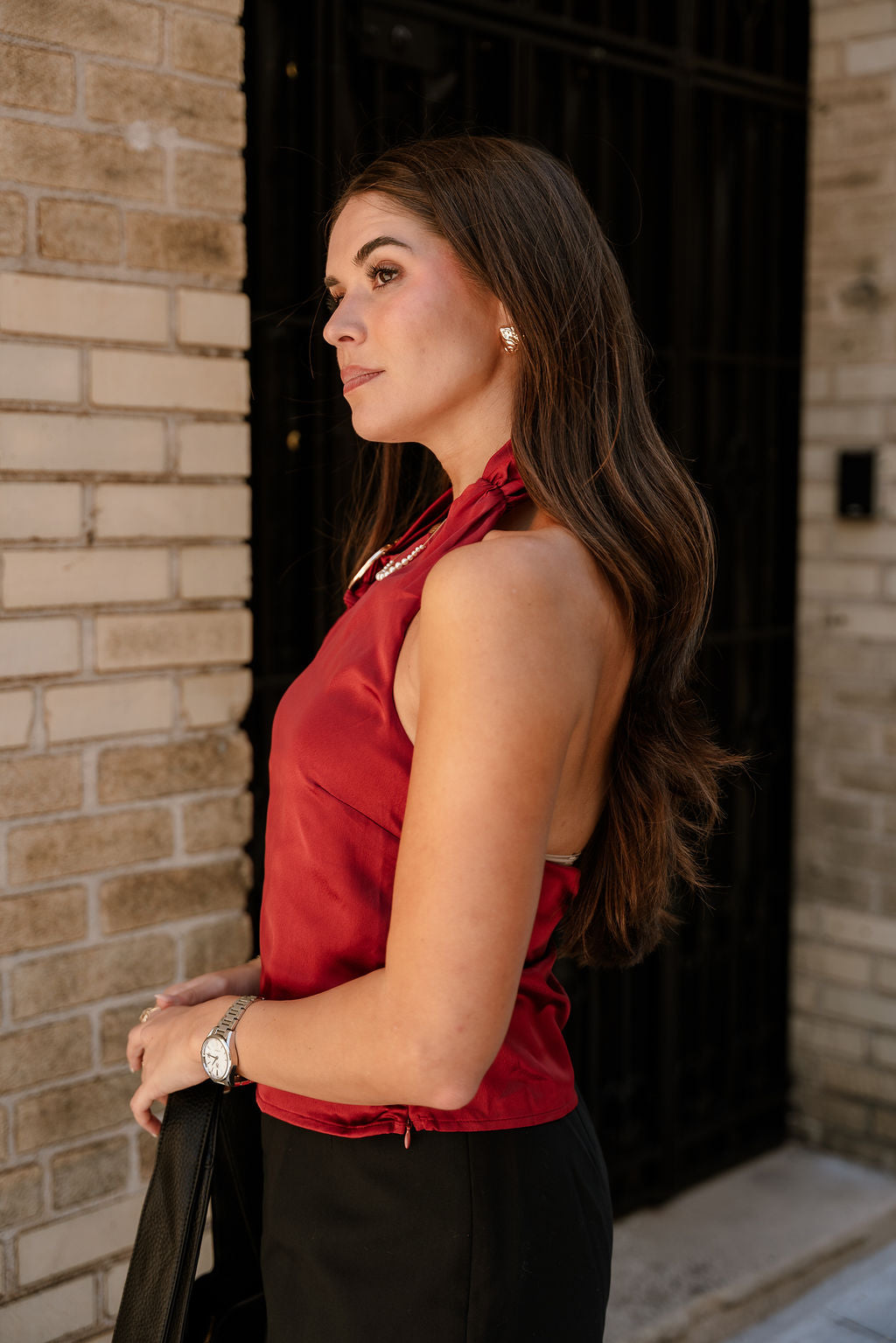 The Madelyn Burgundy Satin & Gold Halter Tank is a statement-making piece that combines timeless elegance with contemporary glamour—perfect for when you want to stand out with confidence and style.