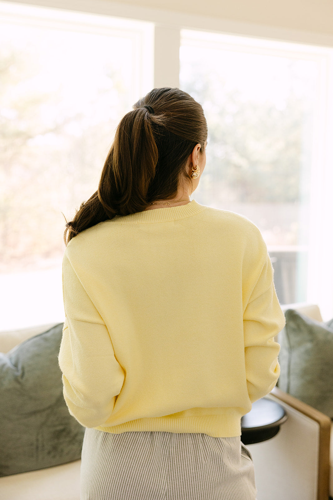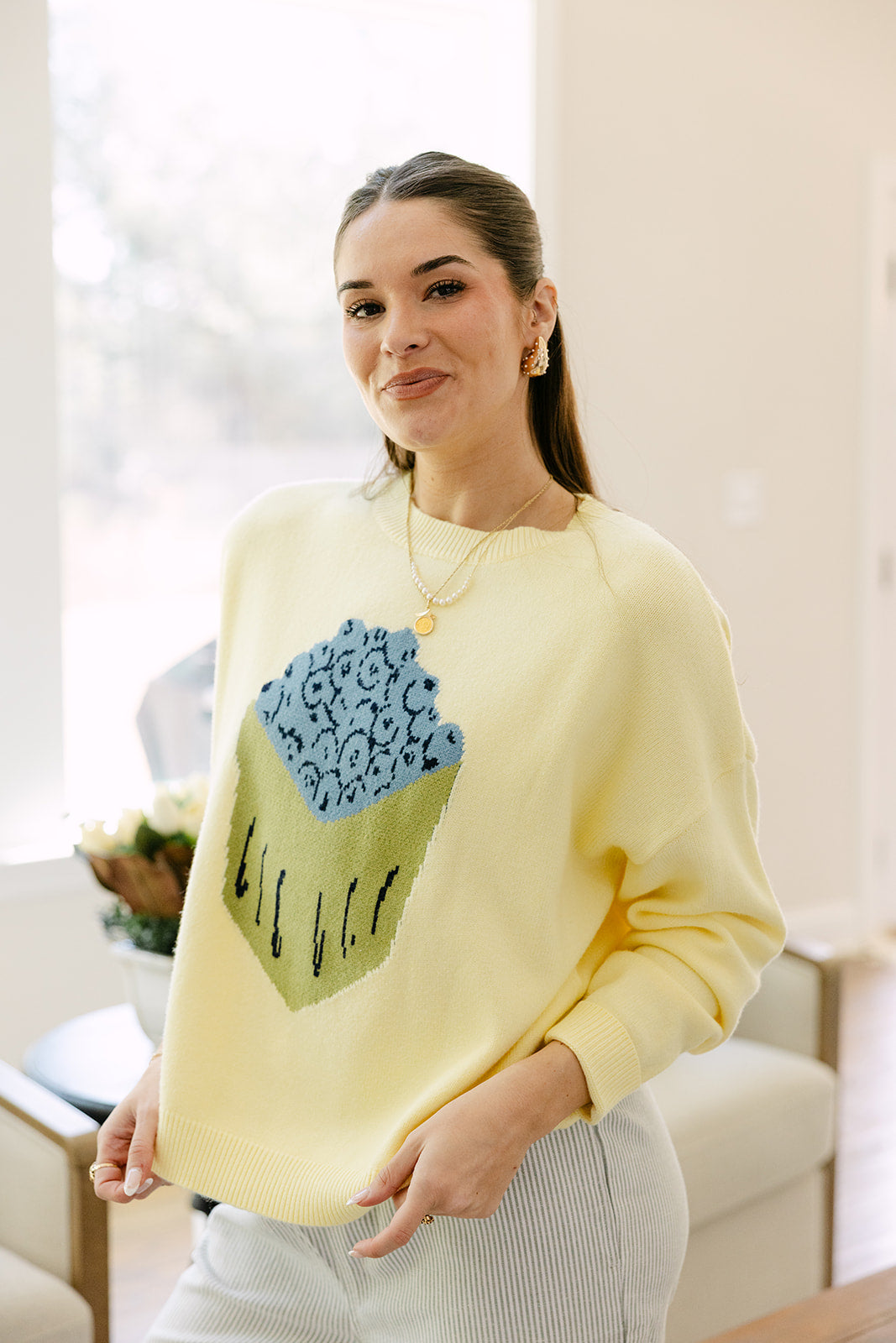 The Maisy Yellow Blueberry Graphic Sweater is a playful and cozy addition to any wardrobe. Made from pale yellow knit fabric, this sweater features a charming blueberries-in-a-basket stitch graphic that adds a fun, whimsical touch to your look. The ribbed hem provides a comfortable, structured fit, keeping the sweater relaxed yet polished.