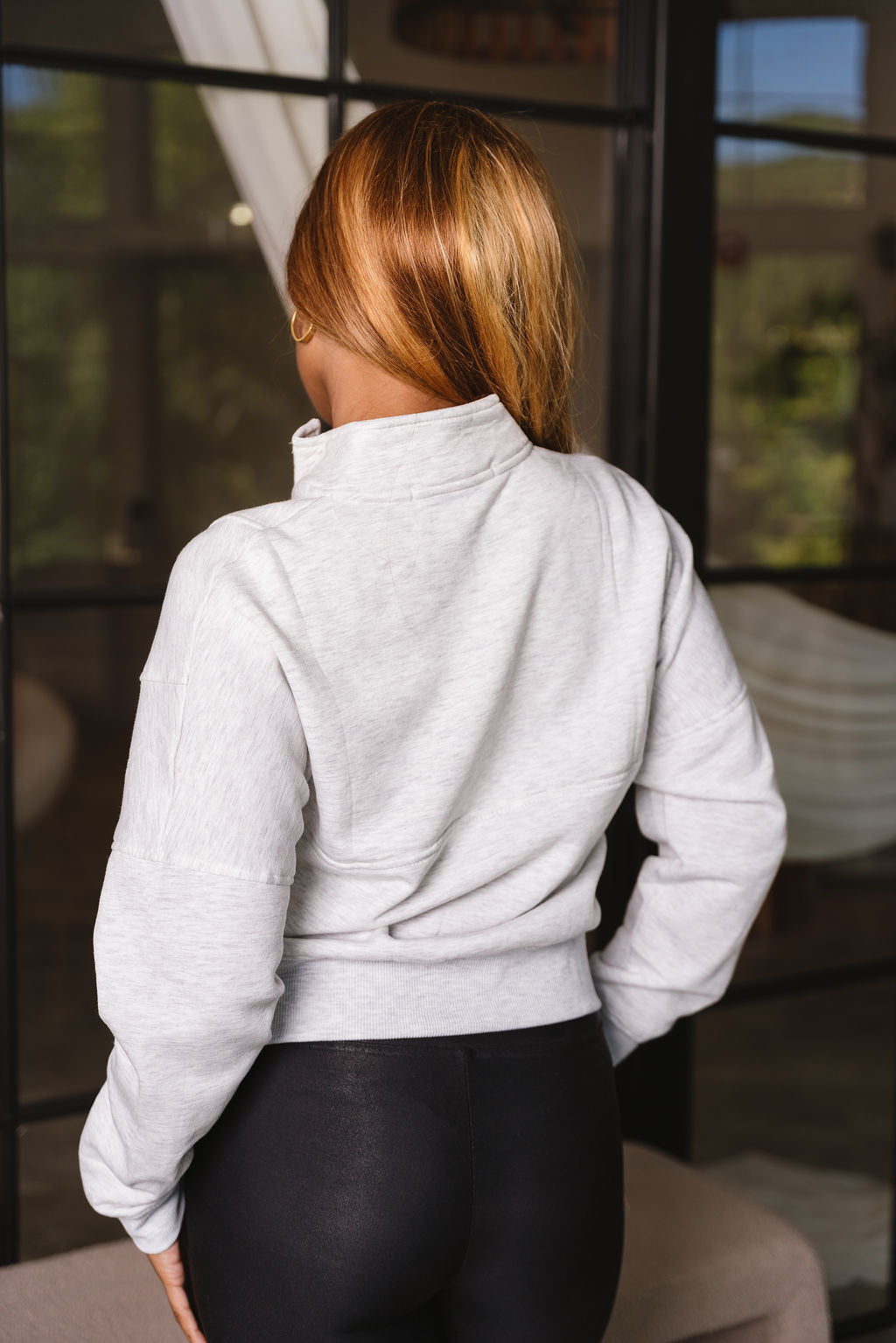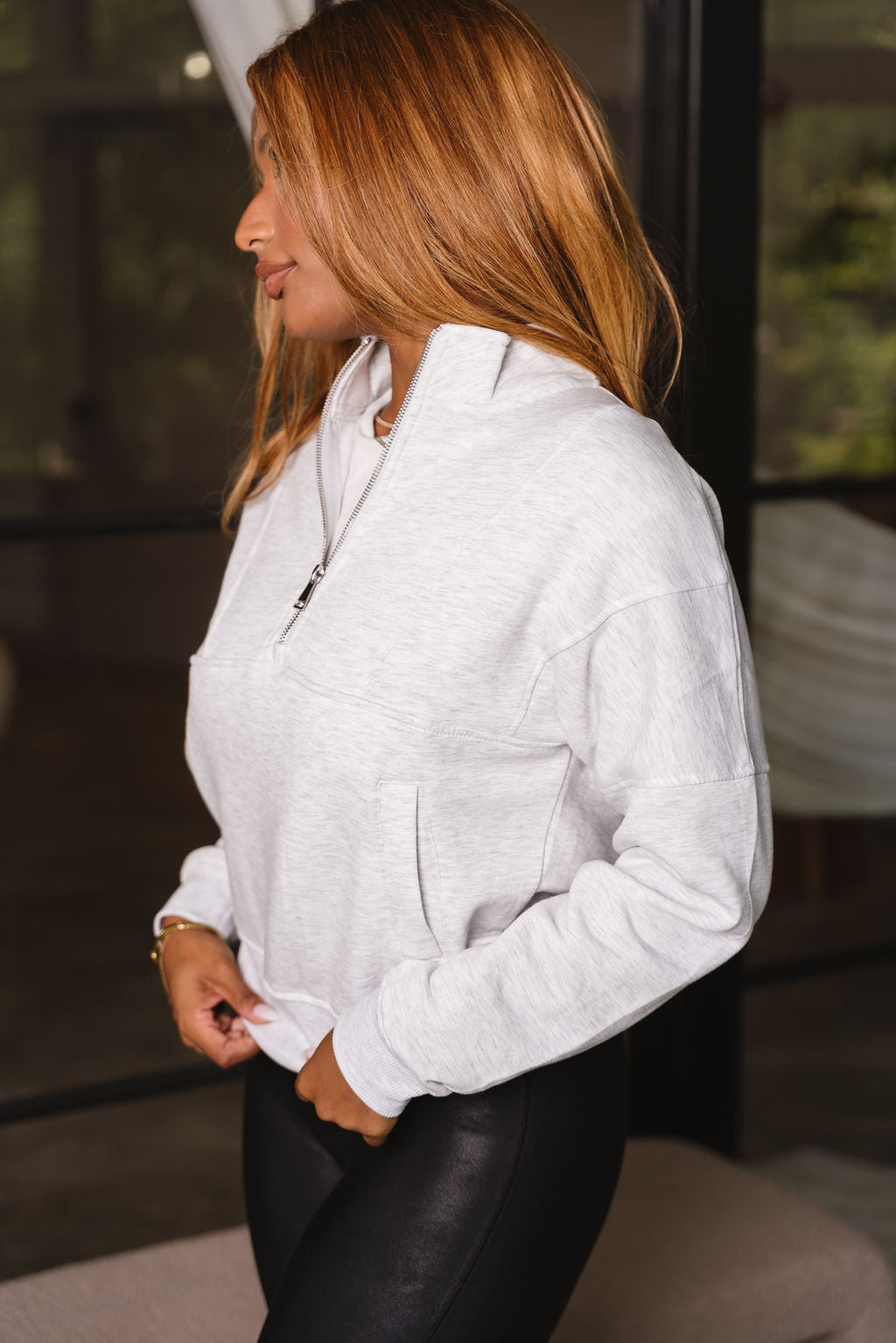 The Mandie Heather Grey Quarter-Zip Pullover is your go-to layer for cozy comfort and everyday style. Crafted from soft heather grey knit fabric, it offers a relaxed fit that feels as good as it looks. The quarter-zip neckline gives you flexibility - zip it up for a snug, warm look or leave it open for a laid-back vibe. A kangaroo front pocket adds both function and charm, perfect for keeping your hands warm or carrying your small essentials.