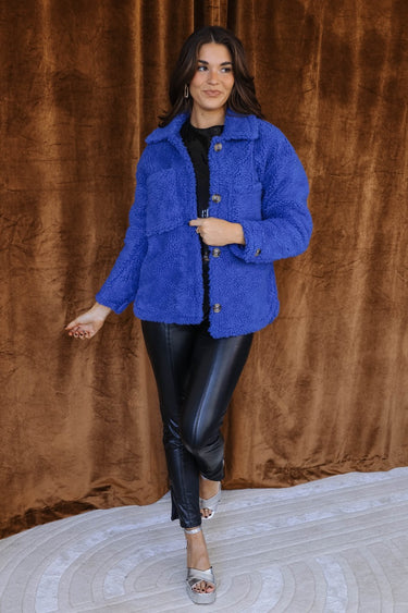 Tortoise buttons run down the front for a stylish touch, while two front chest pockets offer both function and flair. The long sleeves feature buttoned cuffs that also enhance the tailored feel of this royal blue teddy coat. Whether you're layering over casual looks or dressing up your cold-weather wardrobe, the Blue Sherpa Collared Jacket is the vibrant outerwear piece your closet has been waiting for.