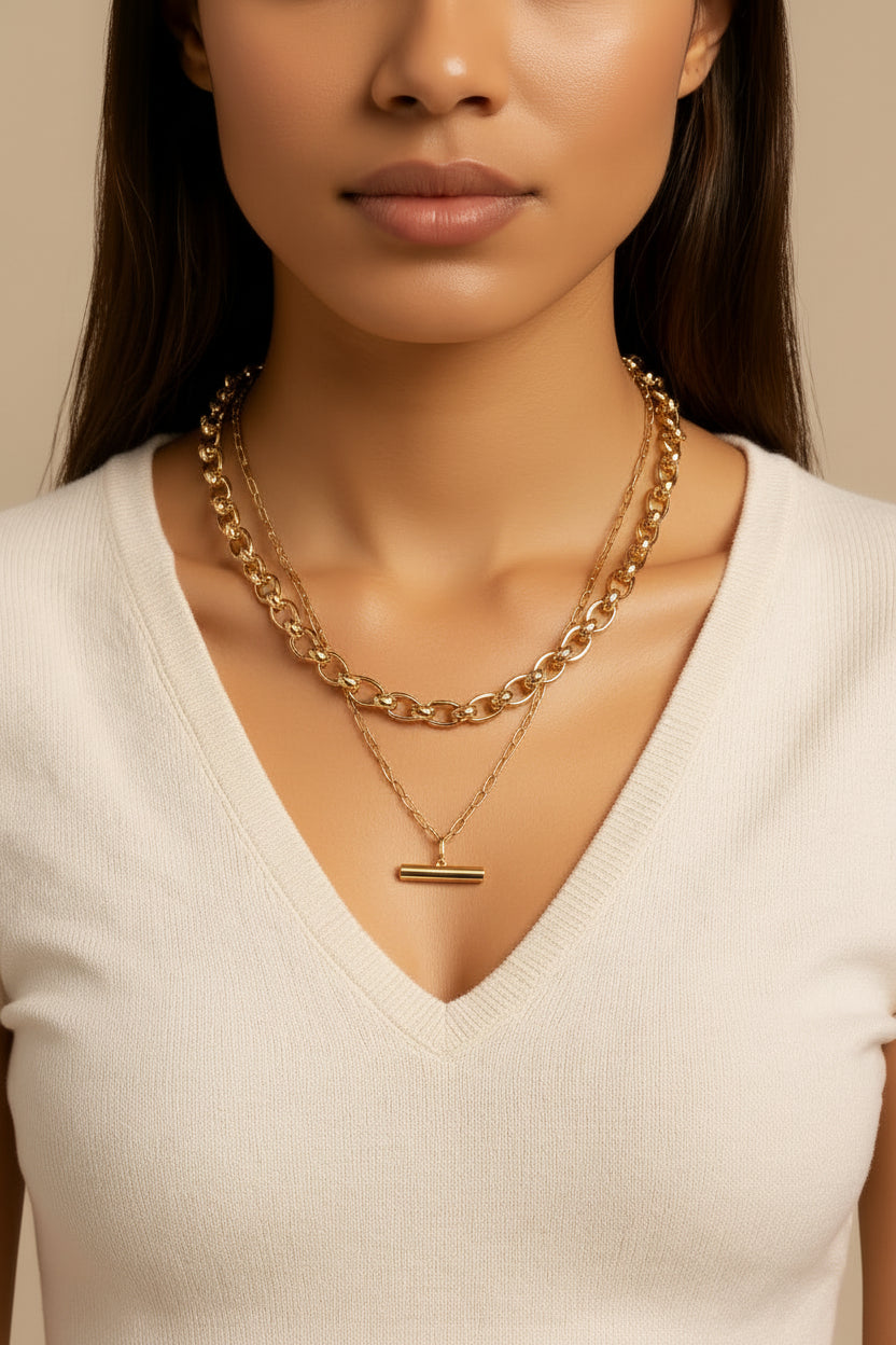 The Margaret Gold Dipped Double Chain Necklace is a chic, layered accessory that adds instant sophistication to any outfit. Featuring two attached gold-dipped chain links, one of which is adorned with a sleek bar medallion, this necklace creates a modern, versatile look that’s perfect for everyday wear or special occasions.