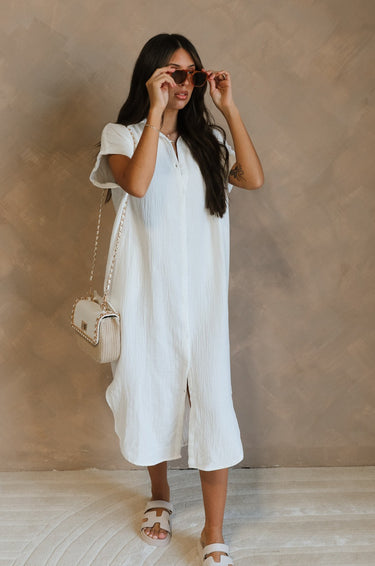 The Maris White Button-Up Midi Dress is made from airy white gauze fabric, perfect for warm-weather occasions. The button-up front adorned with delicate white buttons adds a touch of understated elegance, while the collared neckline and short sleeves lend a classic yet contemporary feel. Designed with practicality in mind, this dress features convenient side pockets, combining style with functionality seamlessly. Falling to a flattering midi length, it strikes the perfect balance between casual comfort and polished refinement, making it an ideal choice for everything from weekend brunches to beachside relaxation.