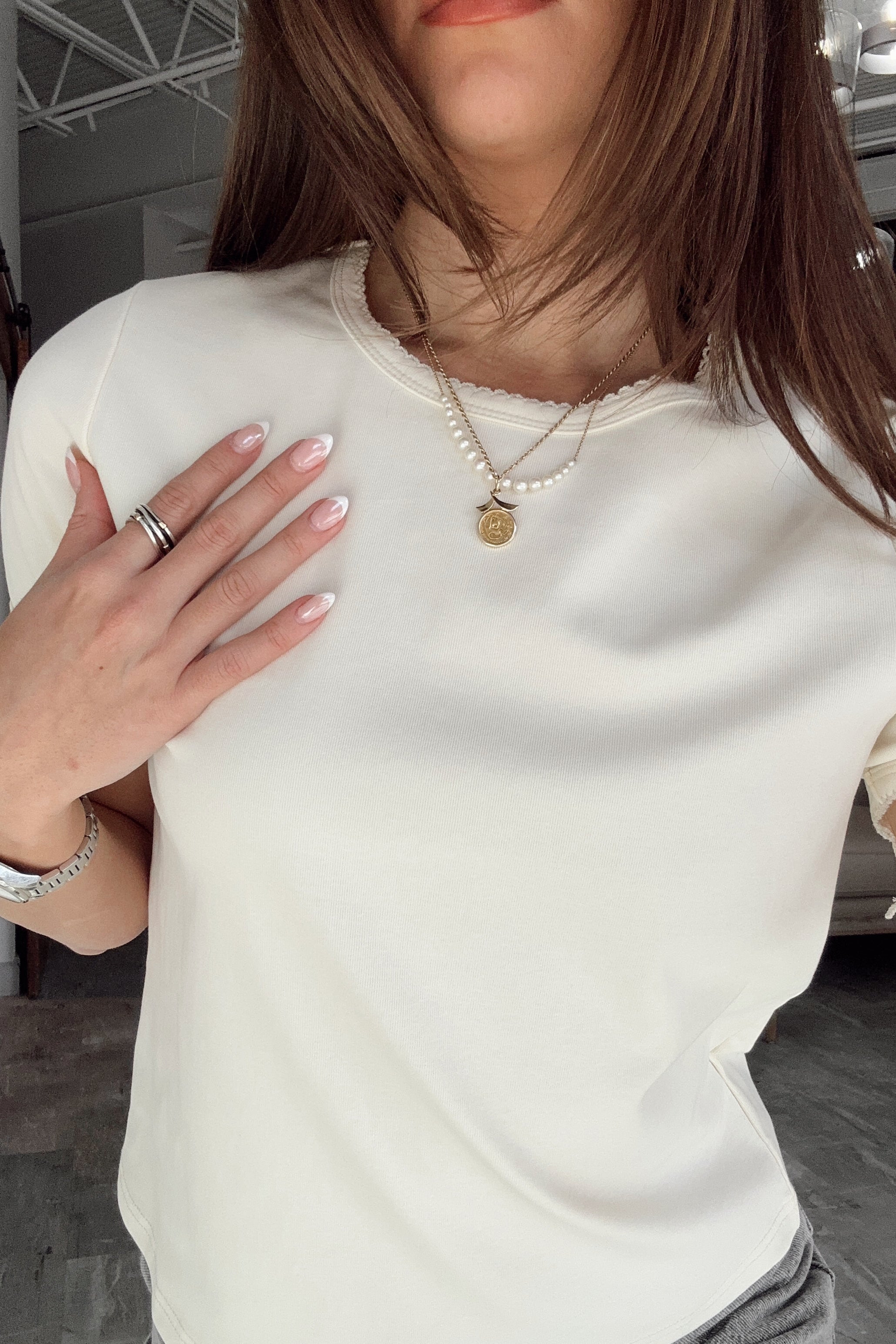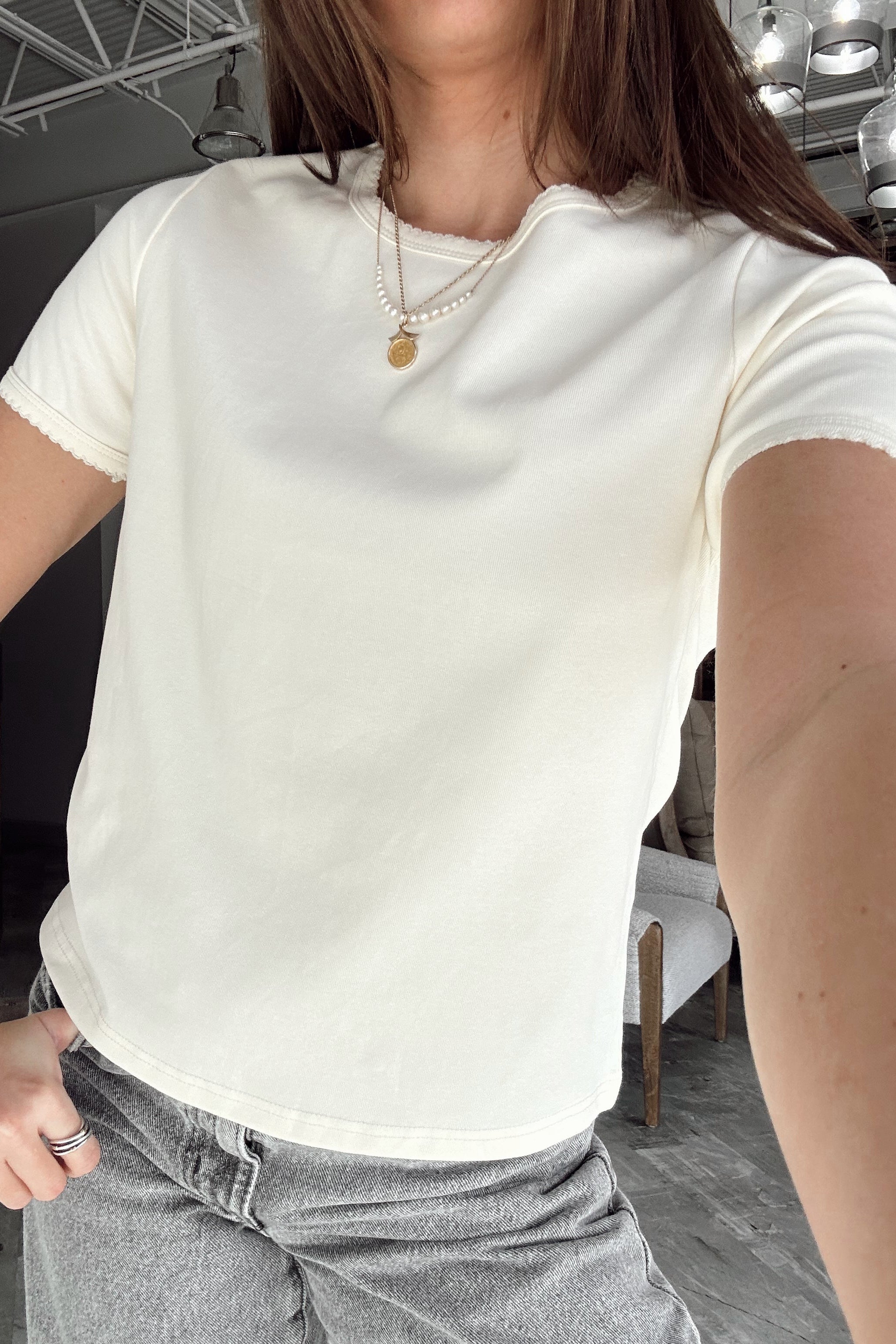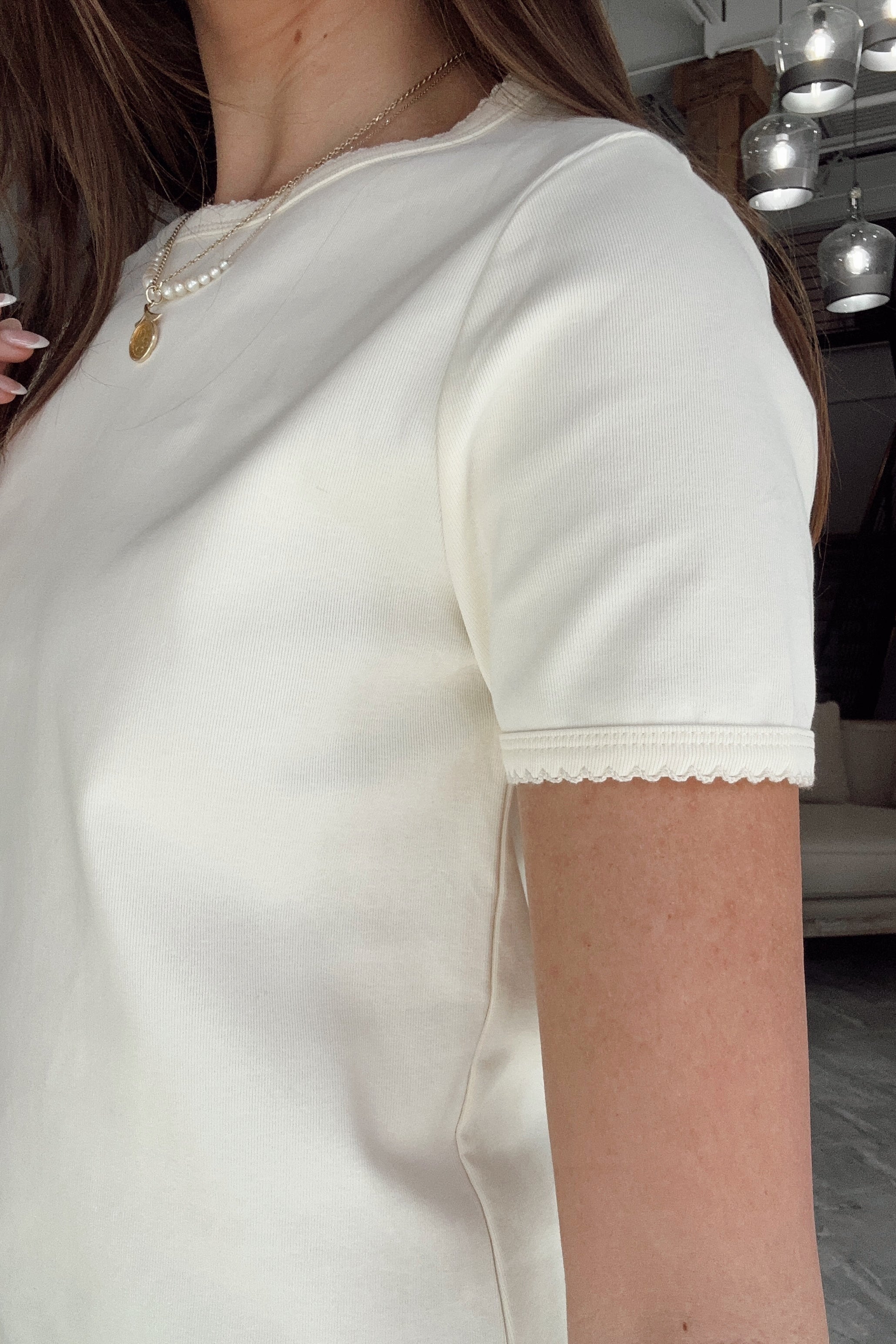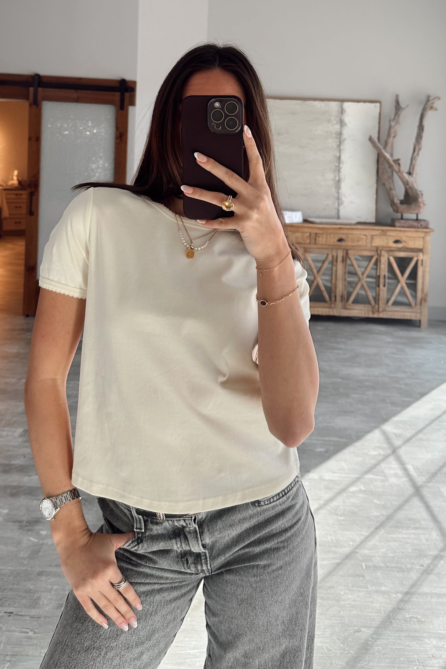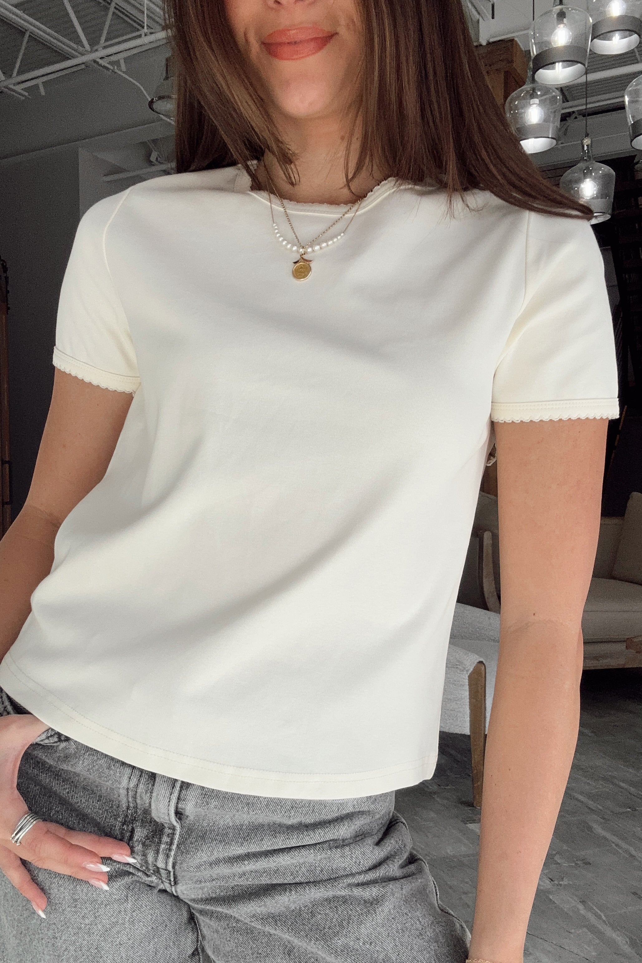Easy, versatile, and endlessly wearable, the Maya Cream Scallop Short Sleeve Top brings understated elegance and effortless style to your everyday wardrobe.