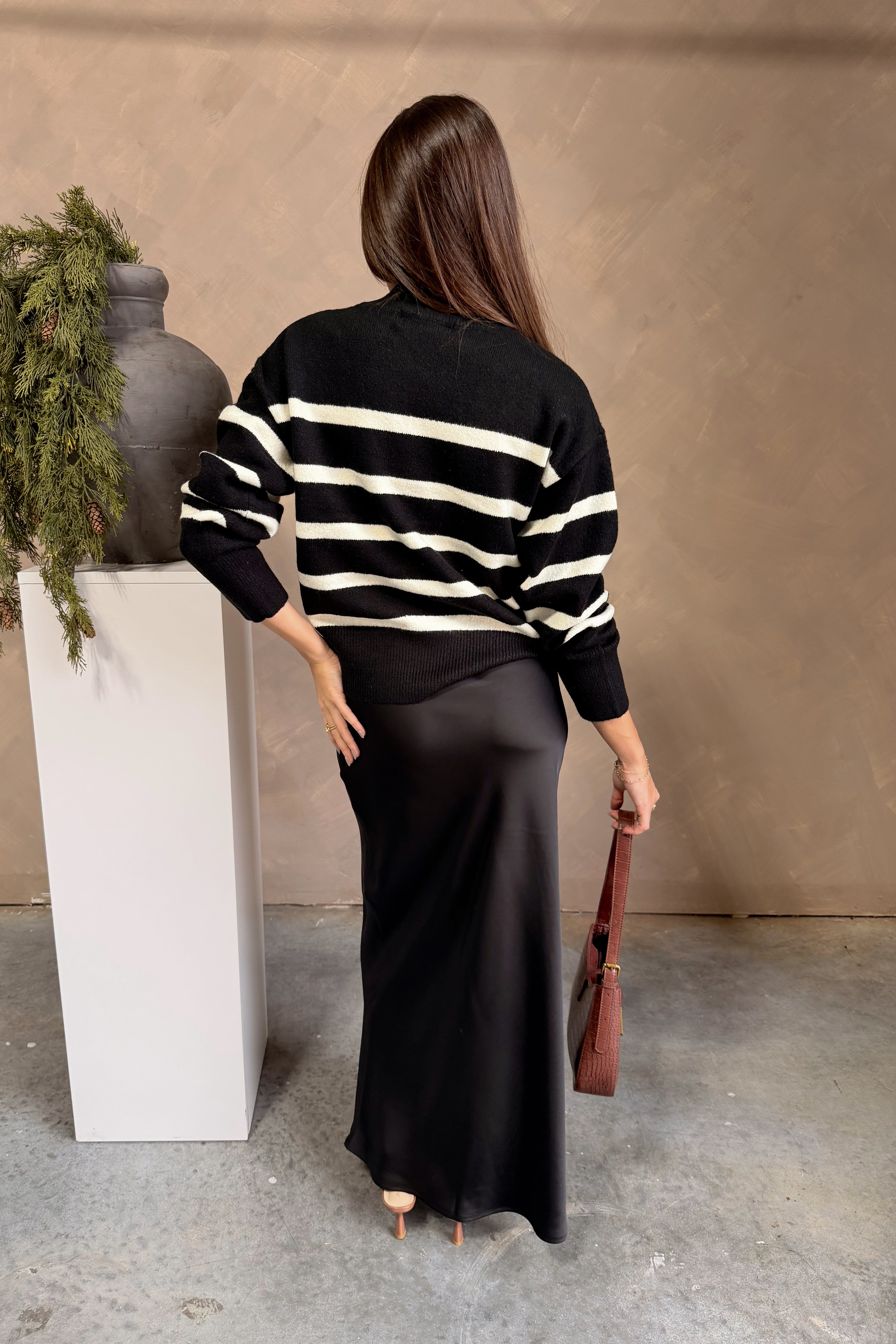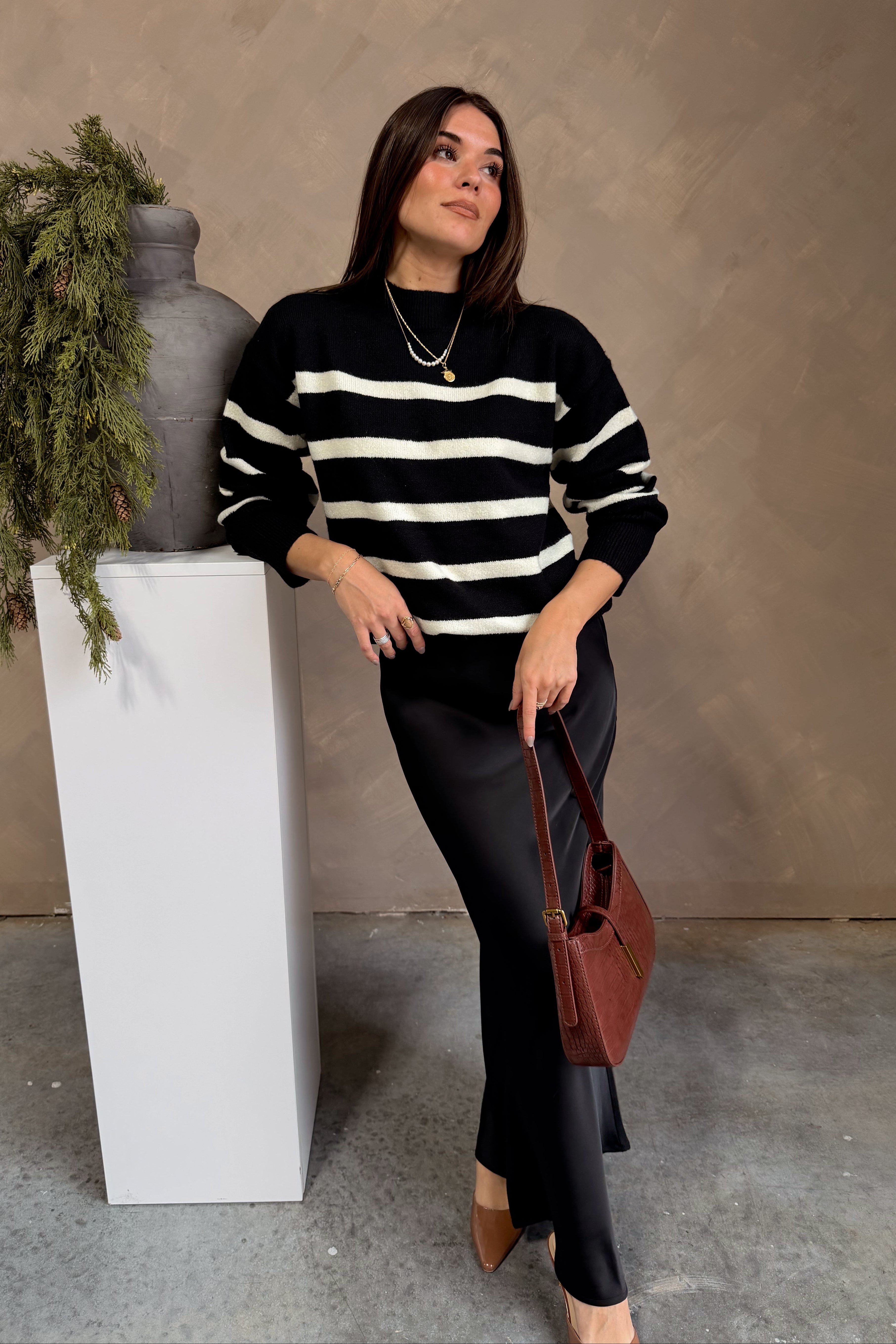 The Melanie Black & Cream Striped Sweater is a timeless staple with a modern edge. Made with soft black and cream knit fabric, this cozy piece features a classic stripe print that adds easy sophistication to any outfit. The high neckline delivers a chic, polished touch while keeping you warm on cooler days, making it perfect for work, weekends, or everyday layering.