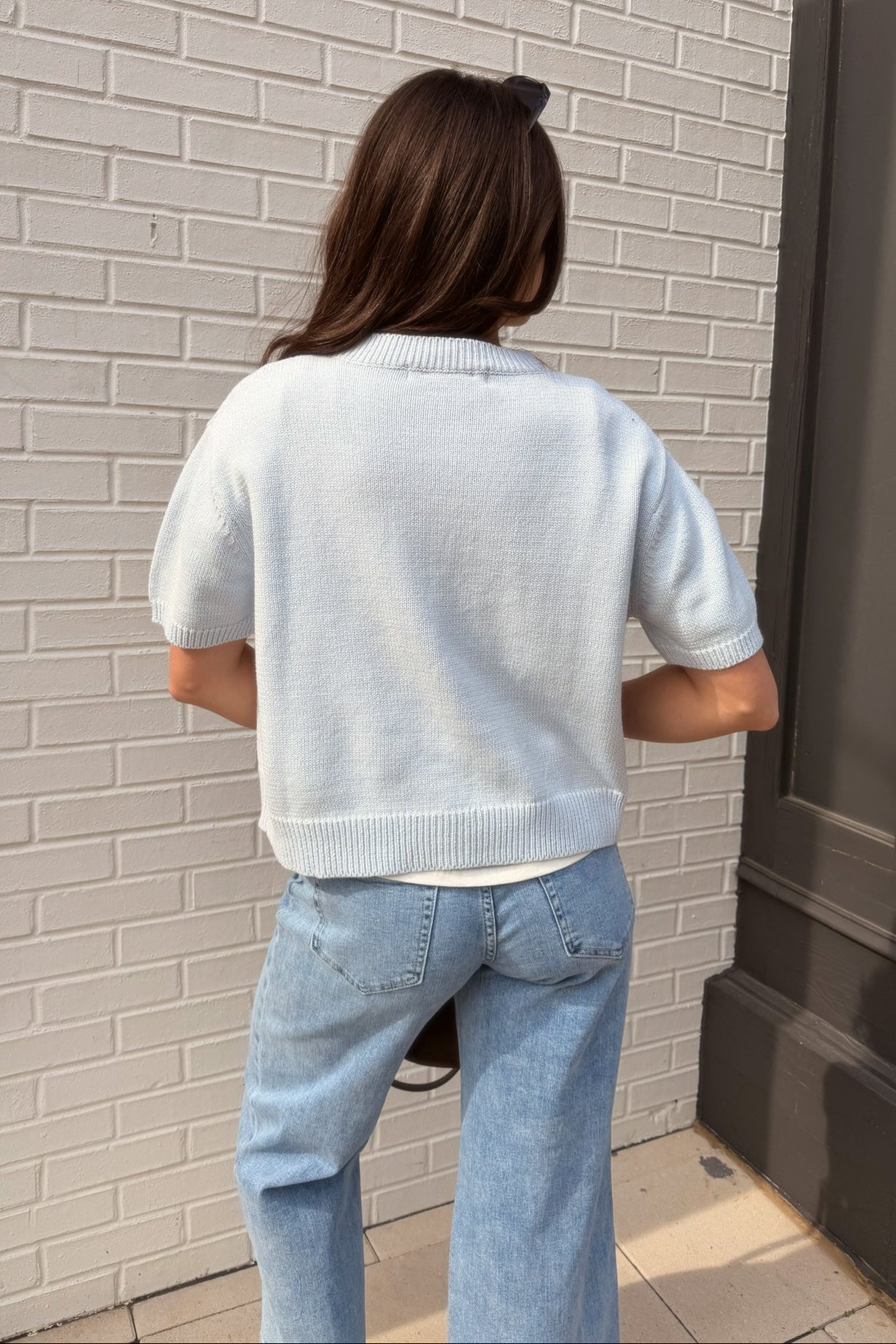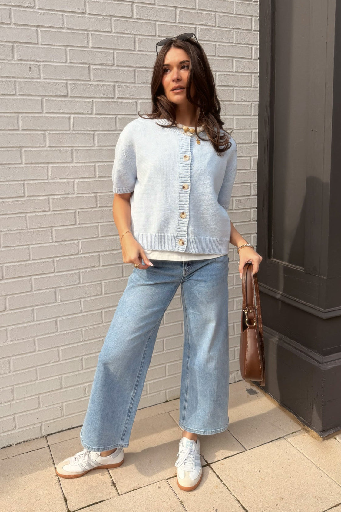 Soft, stylish, and effortlessly versatile, the Melany Light Blue Button-Up Cardigan is a chic addition to any wardrobe. Crafted from light blue knit fabric, this cardigan features a classic round neckline and short puff sleeves for a modern, feminine touch. A ribbed hem adds subtle texture, while the front tortoise button-up closure brings a warm, sophisticated accent. Perfect for layering over dresses, skirts, or high-rise jeans, the Melany Cardigan combines comfort and polished style for a timeless look.