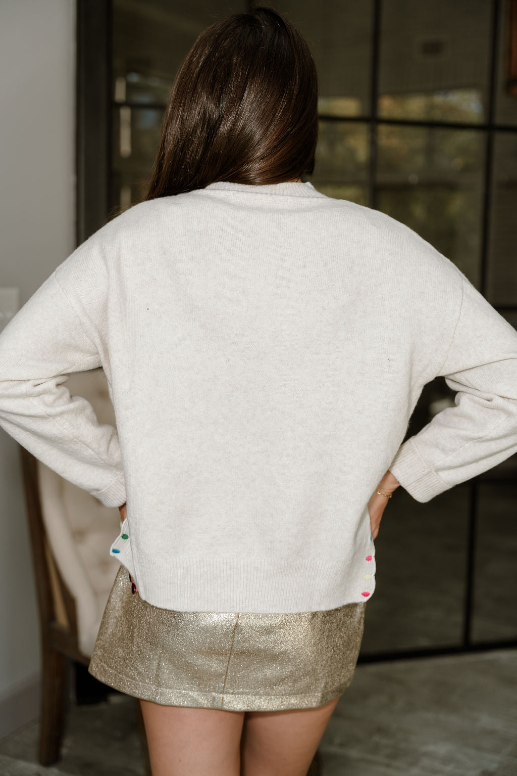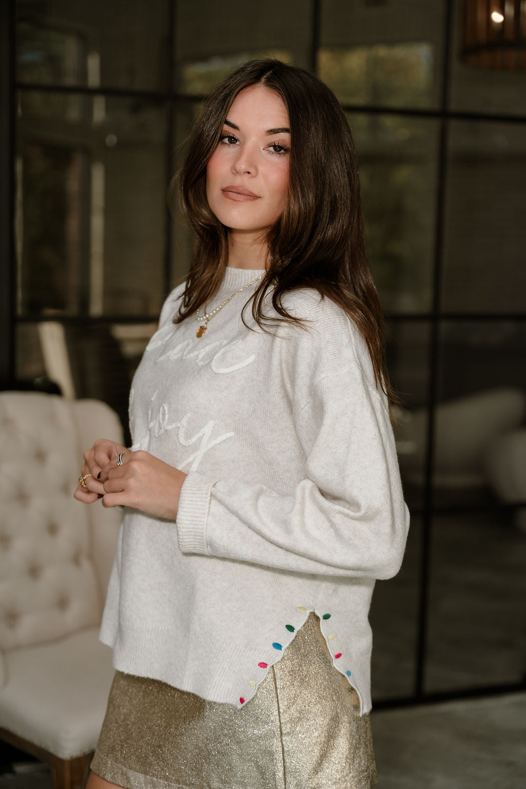 Cozy up in festive charm with the Melody Cream Peace & Joy Knit Sweater. Crafted from soft cream knit fabric, this holiday-ready piece radiates warmth and cheer. The classic silhouette features a high neckline, long sleeves, and a ribbed hem for a comfortable, flattering fit. Delicate scallop details adorned with colorful Christmas lights add a playful touch, while “Peace & Joy” in white cursive writing across the front brings a heartfelt holiday message. Perfect for seasonal gatherings or cozy nights in, the Melody sweater captures the spirit of the season with effortless style and comfort.