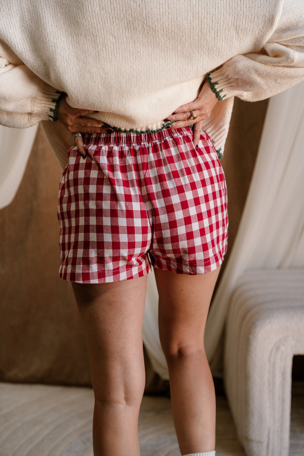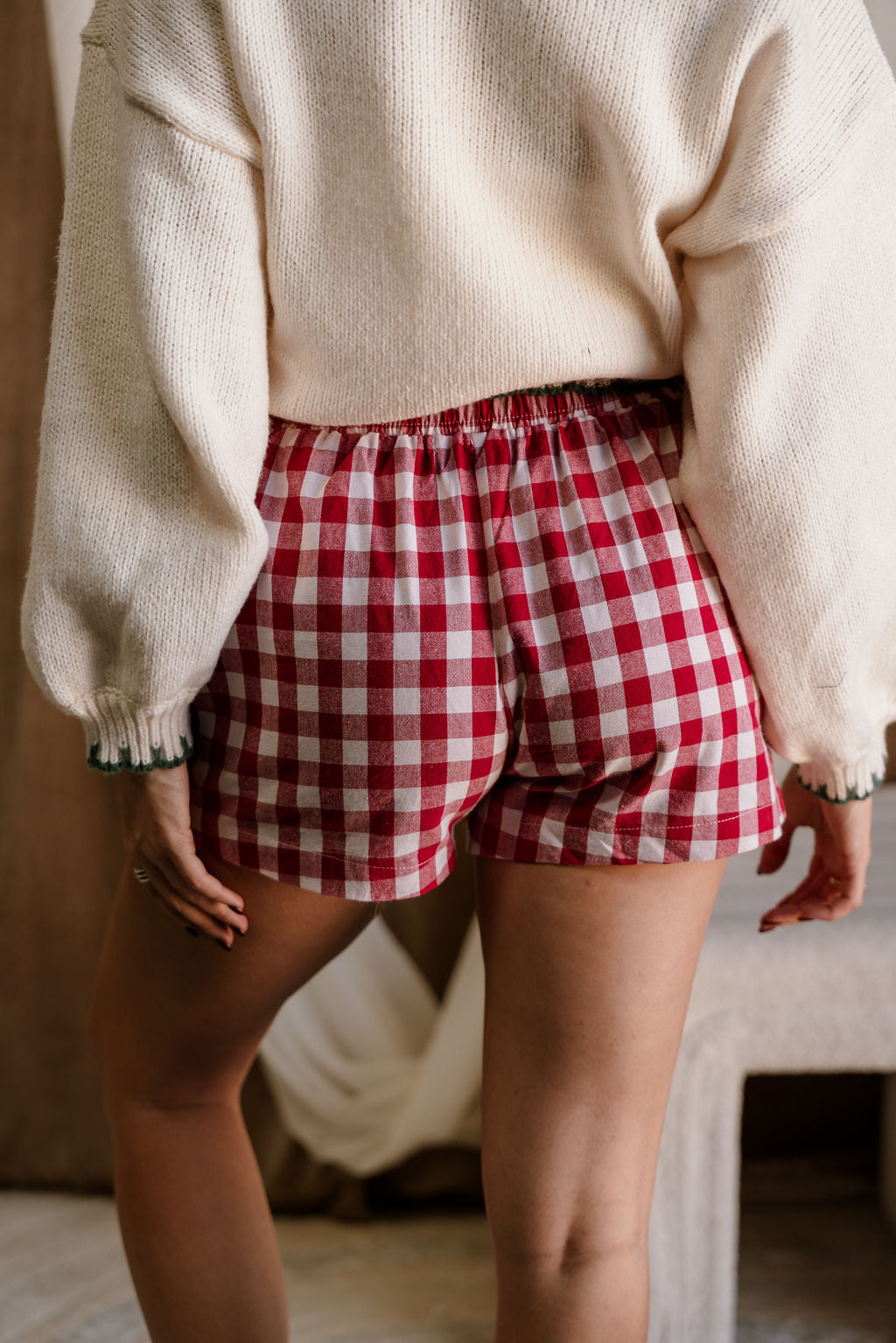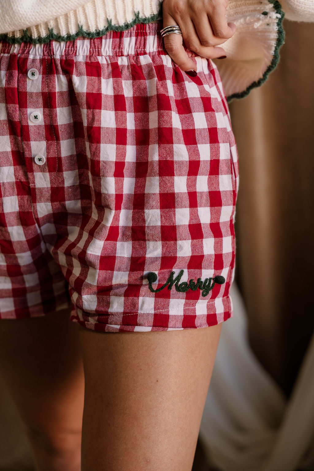 Get into the holiday spirit with the Merry Red & White Plaid Pajama Shorts—your new cozy-cute favorite for festive lounging. Crafted from soft red and white plaid fabric, these comfy shorts offer a relaxed fit perfect for movie nights, slow mornings, and everything in between. The elastic waistband provides all-day comfort, while functional side pockets add a practical touch. A sweet green stitched cursive “Merry” detail brings a playful pop of color, complemented by classic front buttons for that timeless pajama look. Pair them with your coziest tee or matching holiday top for a cheerful, effortless bedtime vibe.