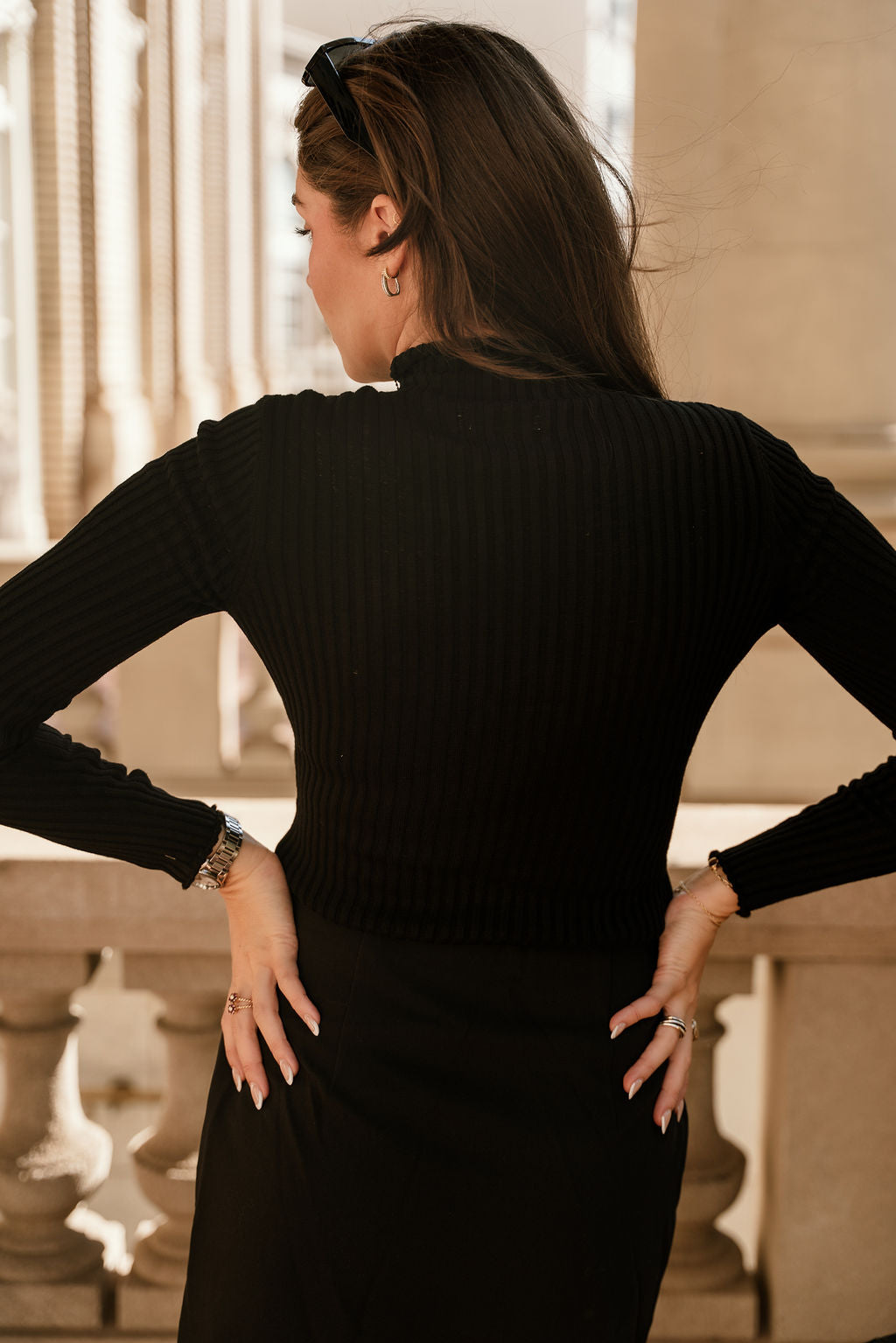 The Mia Black High Neck Knit Top is a sleek and timeless wardrobe staple. Made from soft black ribbed knit fabric, this top offers a flattering, form-fitting silhouette with a touch of stretch for all-day comfort. The high neckline adds an elegant, polished feel, while the long sleeves make it perfect for layering or wearing on its own. Effortlessly versatile, the Mia top pairs beautifully with everything from tailored trousers to casual denim.