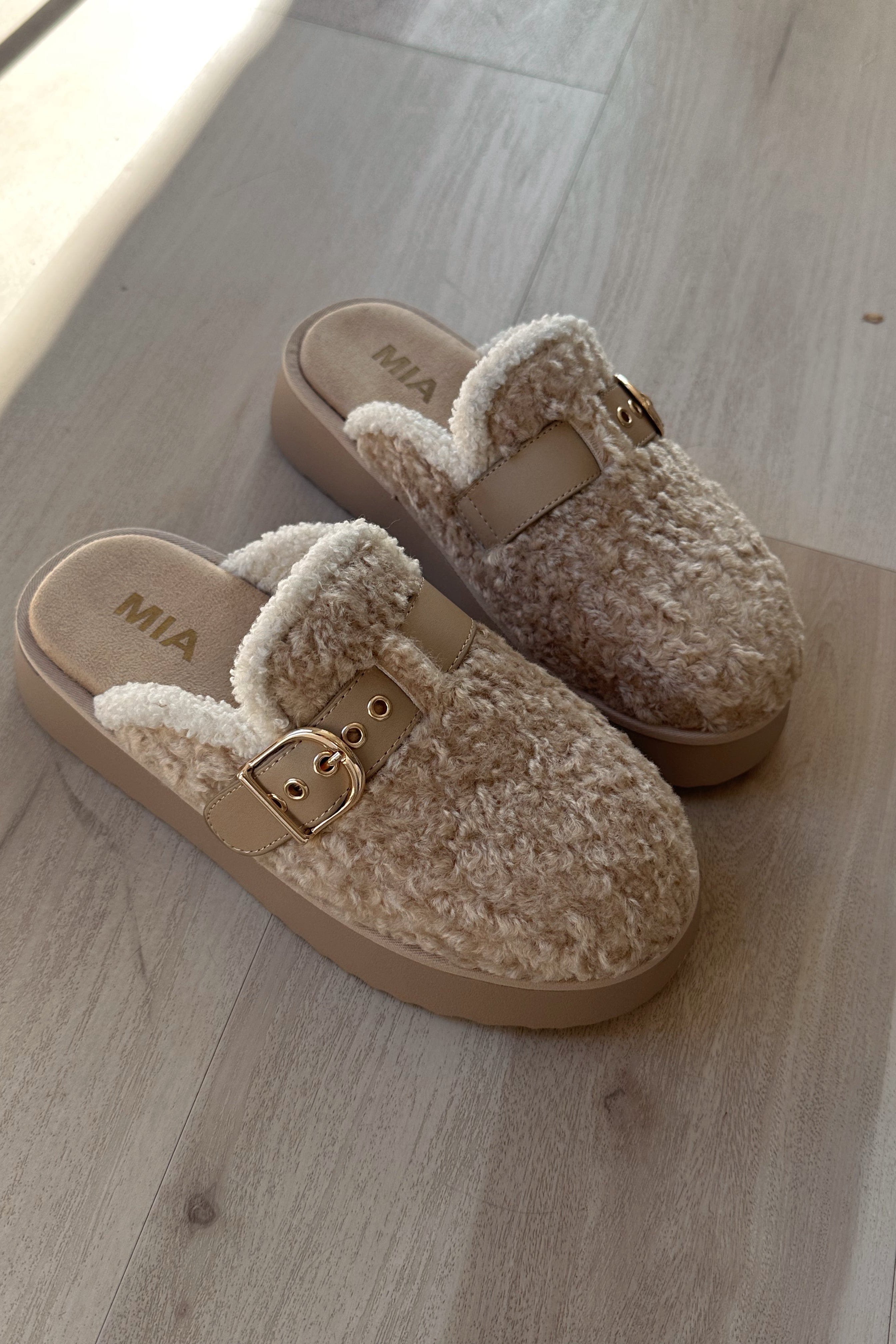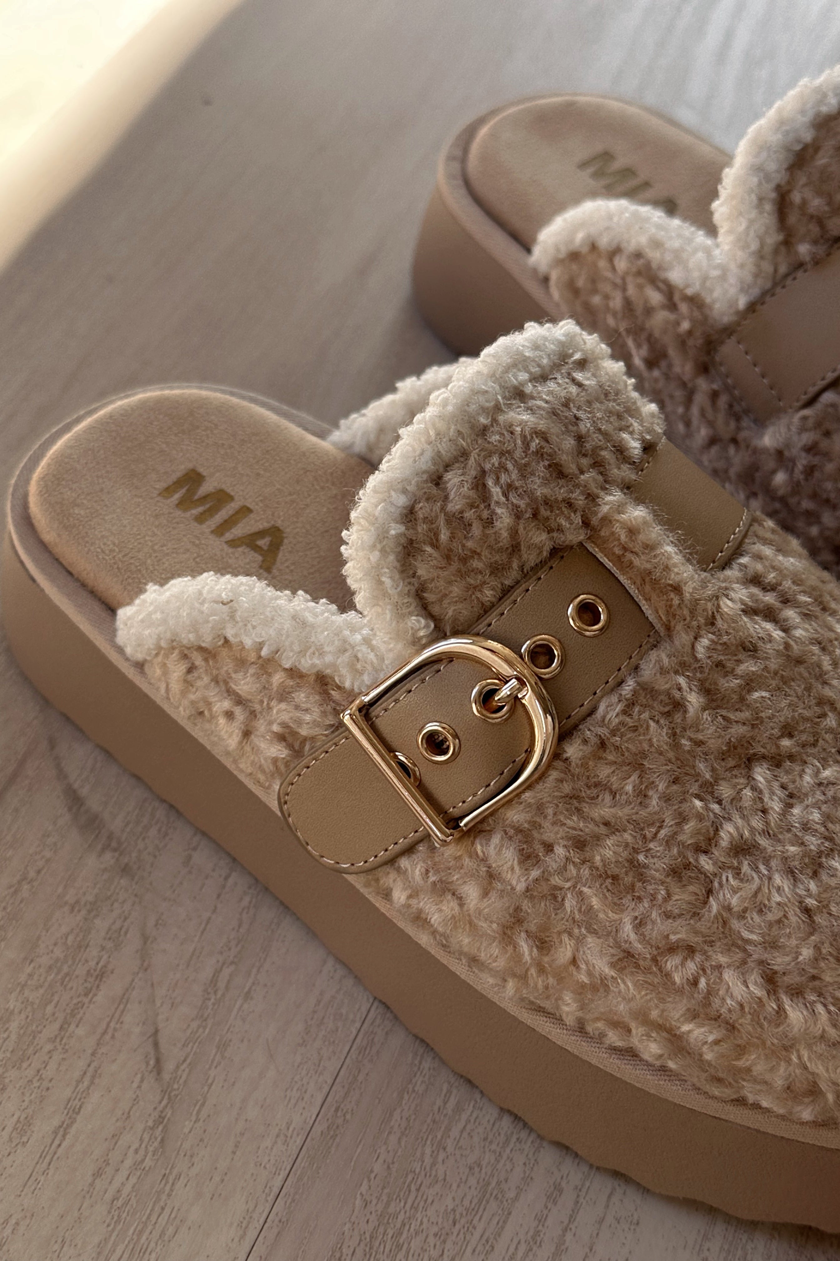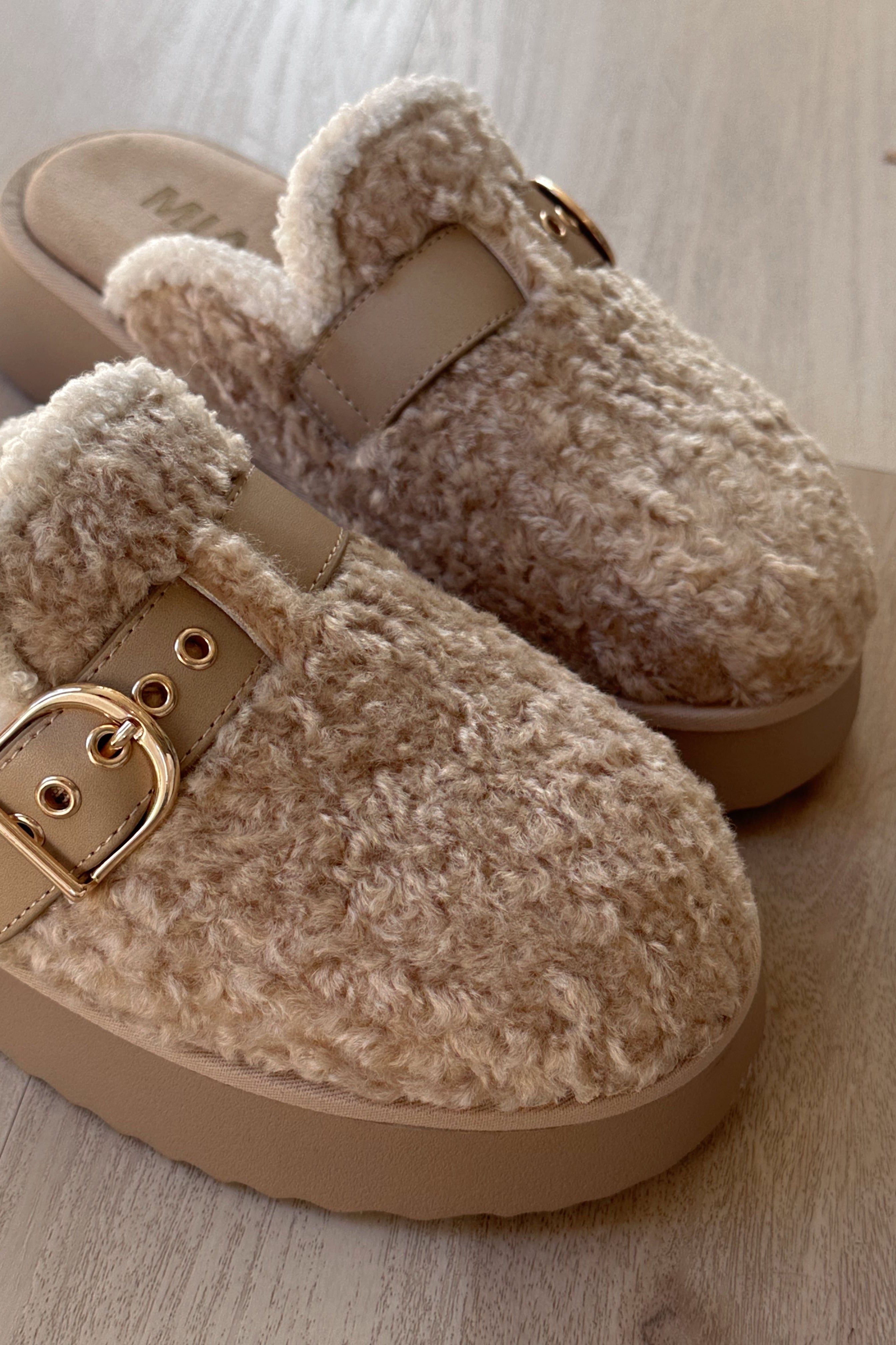 Cozy meets chic in the Mia Sugary Natural Shearling Platform Mule. This slide-on style features a natural faux shearling upper with a soft plush lining for ultimate comfort. A statement gold buckle adds a touch of shine, while the 2.7-inch platform sole provides effortless height and a trendy silhouette—perfect for elevating your everyday look.