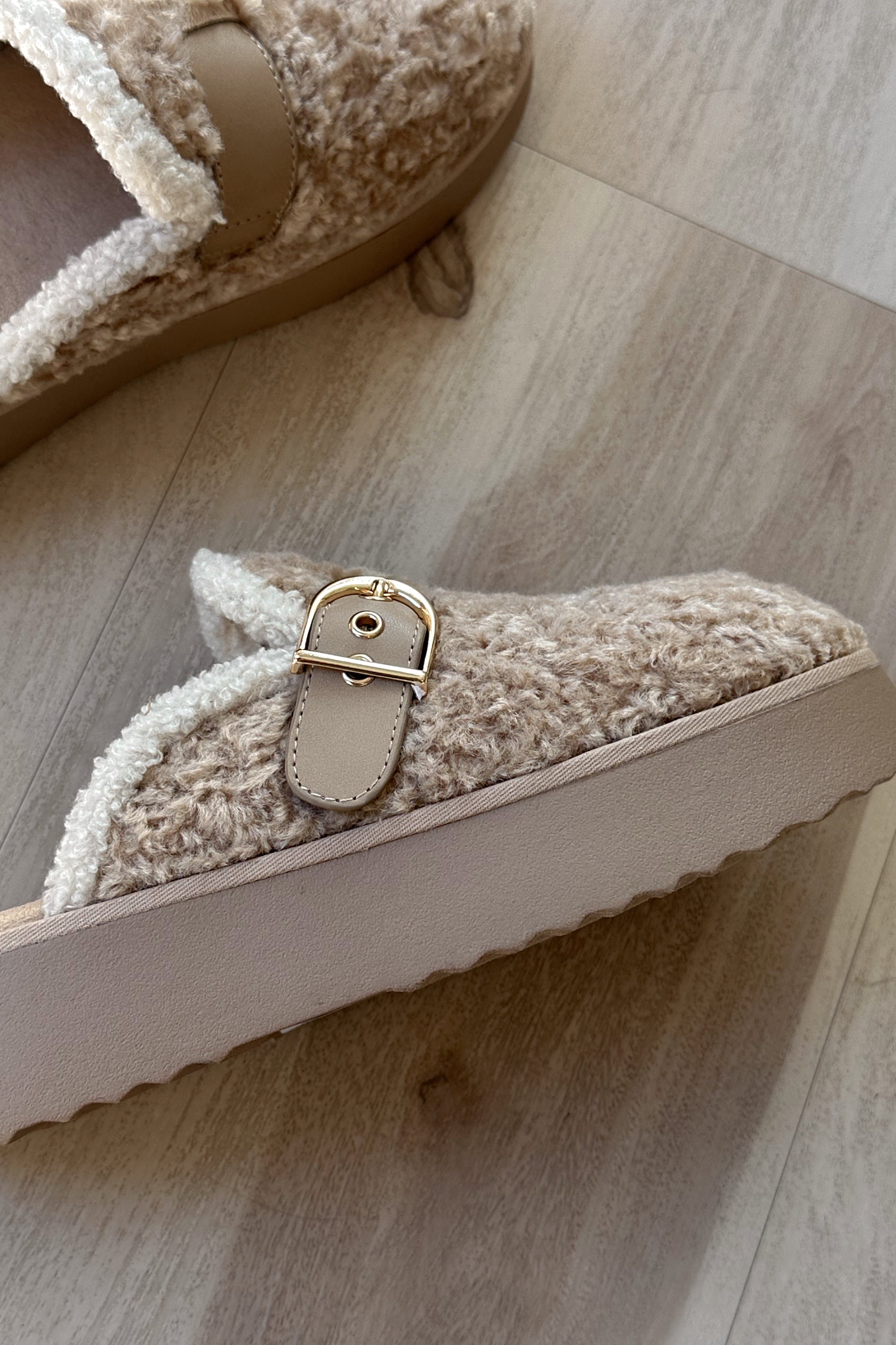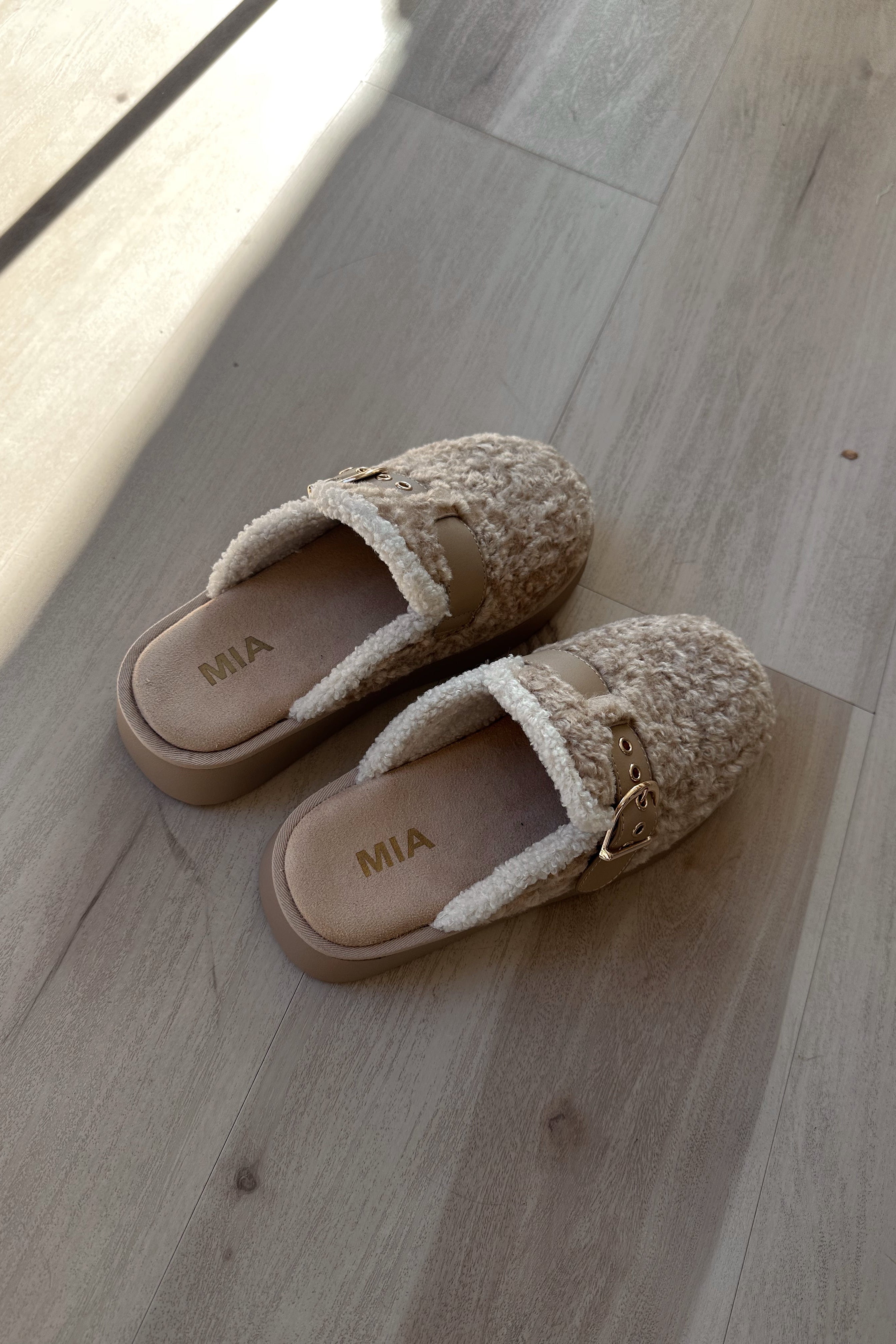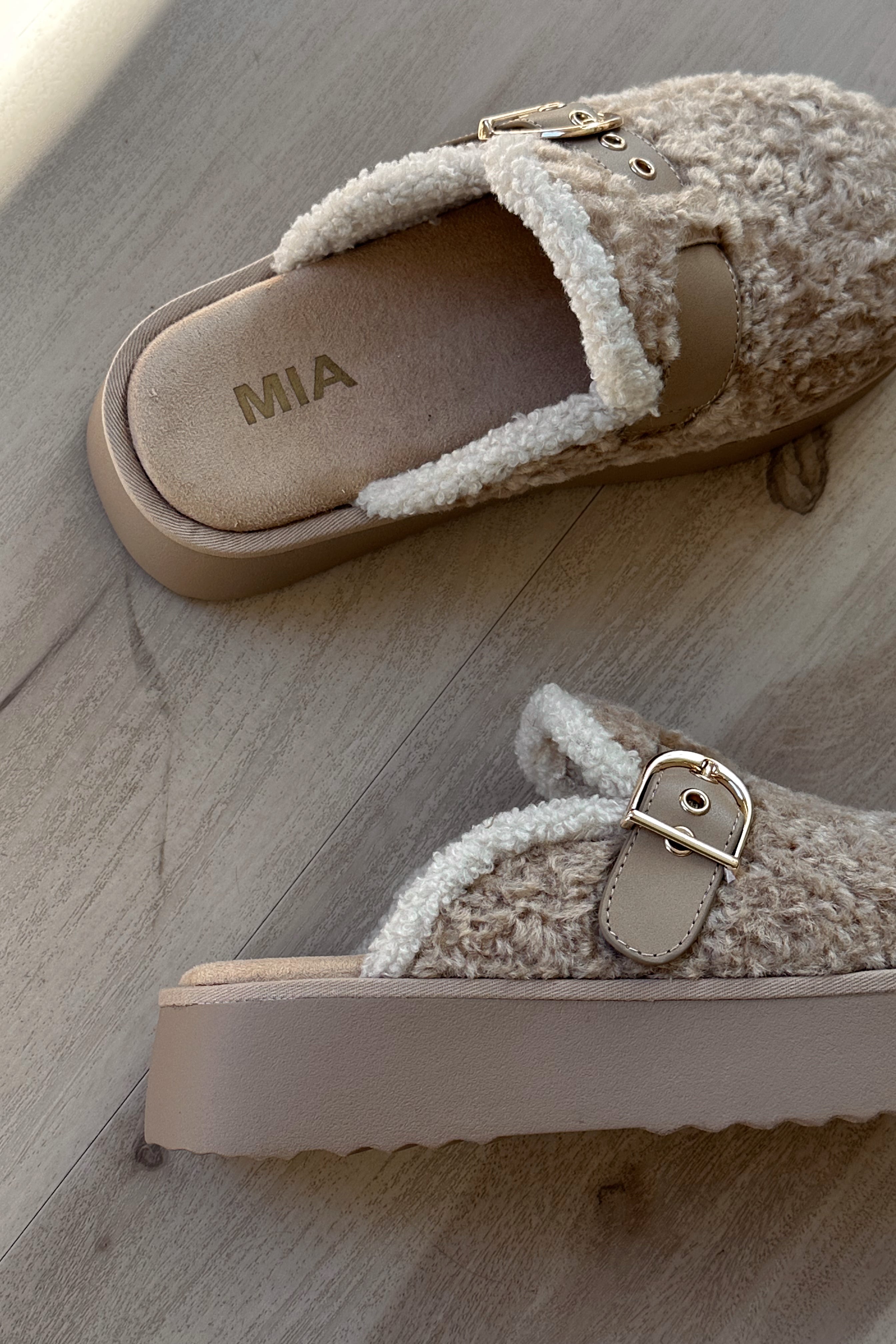 Cozy meets chic in the Mia Sugary Natural Shearling Platform Mule. This slide-on style features a natural faux shearling upper with a soft plush lining for ultimate comfort. A statement gold buckle adds a touch of shine, while the 2.7-inch platform sole provides effortless height and a trendy silhouette—perfect for elevating your everyday look.