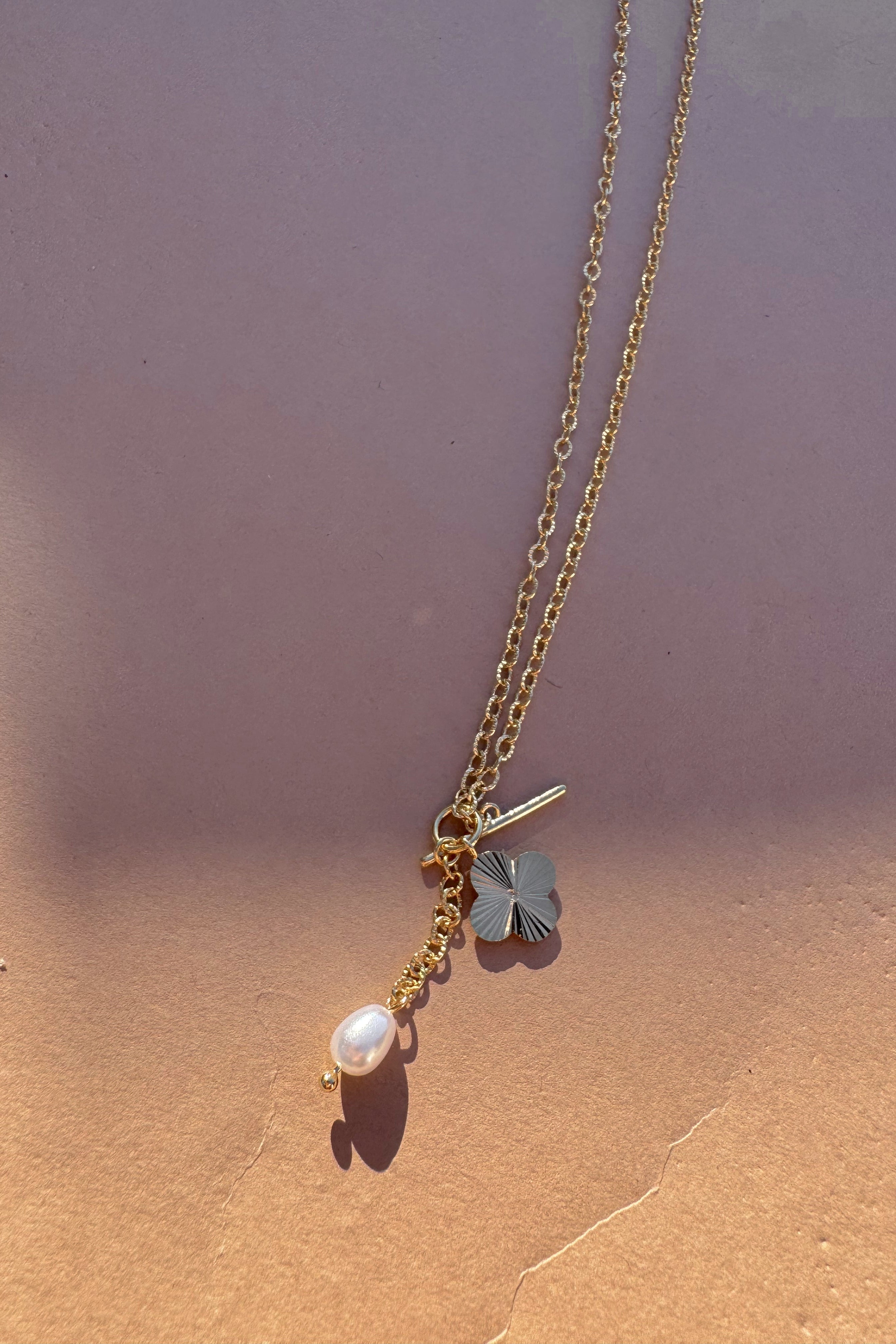 Romantic and refined, the Mila Gold Flower & Pearl Lariat Necklace adds an elegant touch to any look. Featuring a delicate gold chain with a graceful flower lariat drop and a pearl medallion accent, this necklace creates a soft, feminine silhouette. Perfect for layering or wearing on its own, Mila brings timeless charm and effortless sophistication.