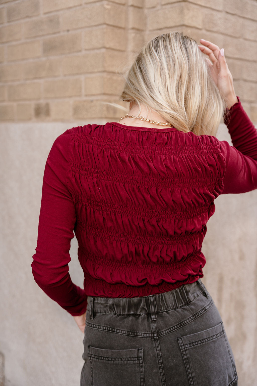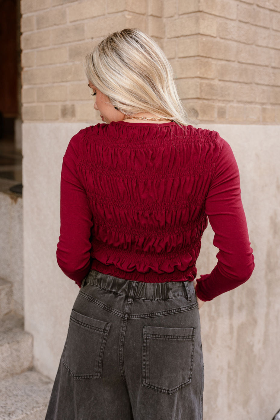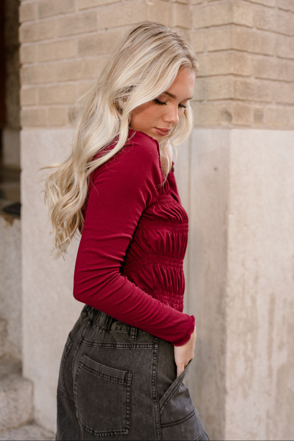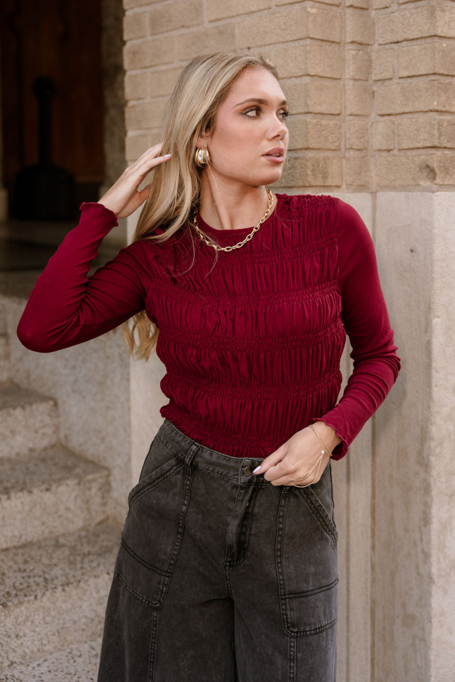 The Milani Burgundy Smocked Top is a feminine and flattering wardrobe staple. Crafted from lightweight burgundy fabric, it features a smocked upper that provides a comfortable, form-fitting silhouette. The round neckline and long sleeves add classic elegance, while the ruffle hem brings a playful, flirty touch. Perfect for pairing with jeans, skirts, or tailored pants, the Milani top effortlessly combines comfort and chic style.