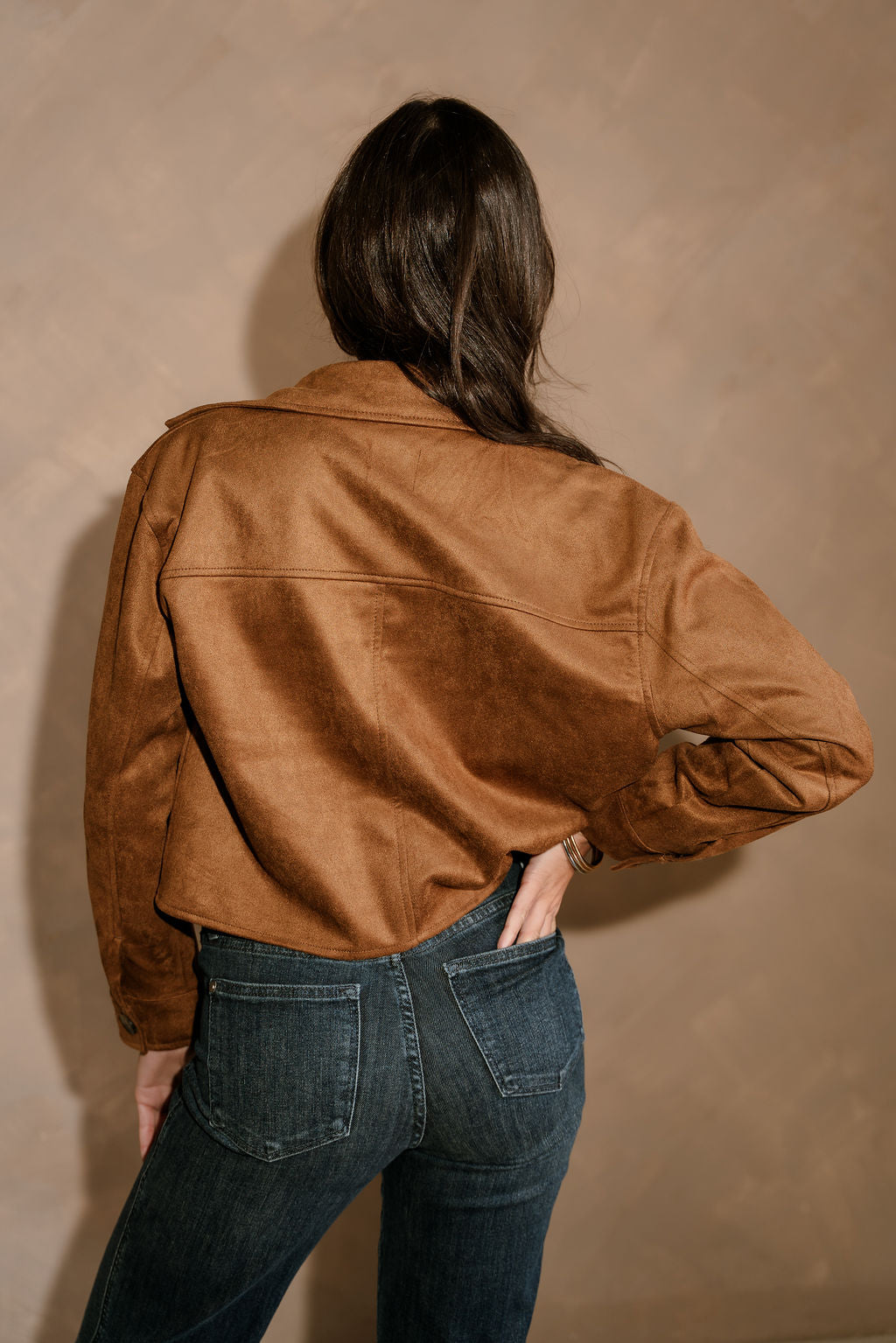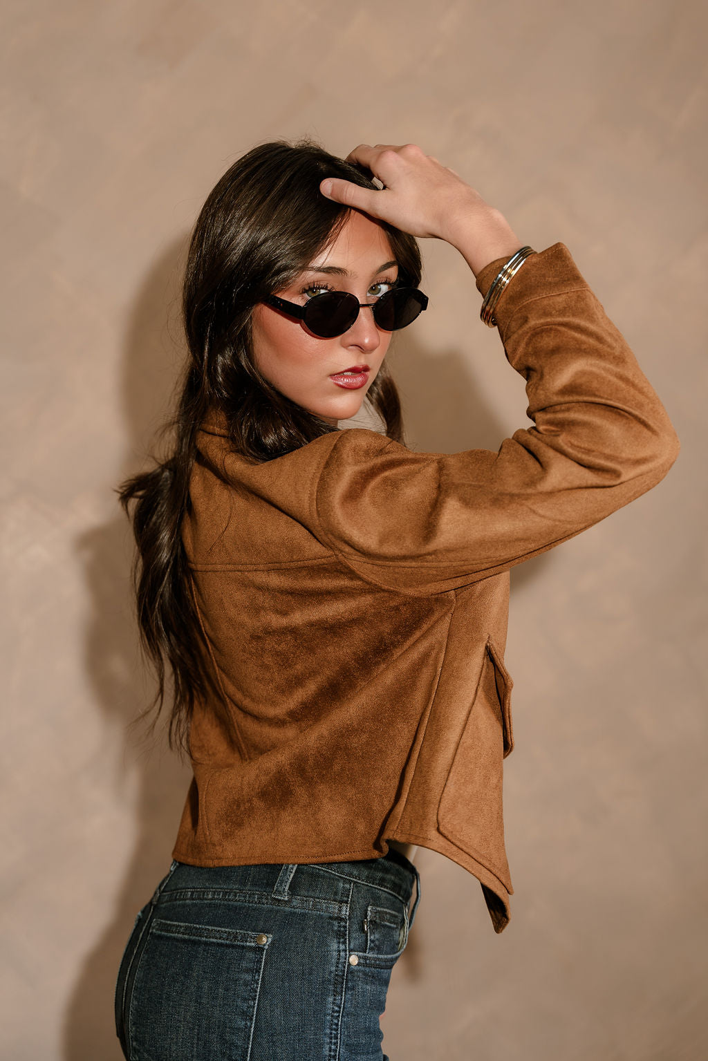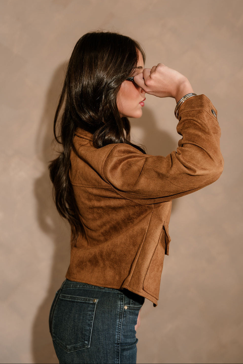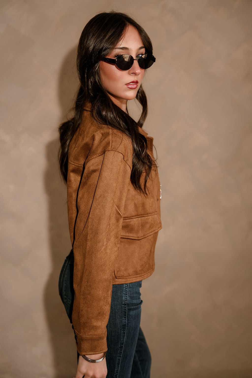 The Monroe Camel Suede Cropped Jacket is a versatile wardrobe staple that combines classic tailoring with modern flair. Crafted from soft camel brown suede fabric, this jacket features a structured collar neckline and front button-up closure for a polished look. The cropped waist adds a contemporary touch, making it perfect for pairing with high-waisted jeans, skirts, or trousers.