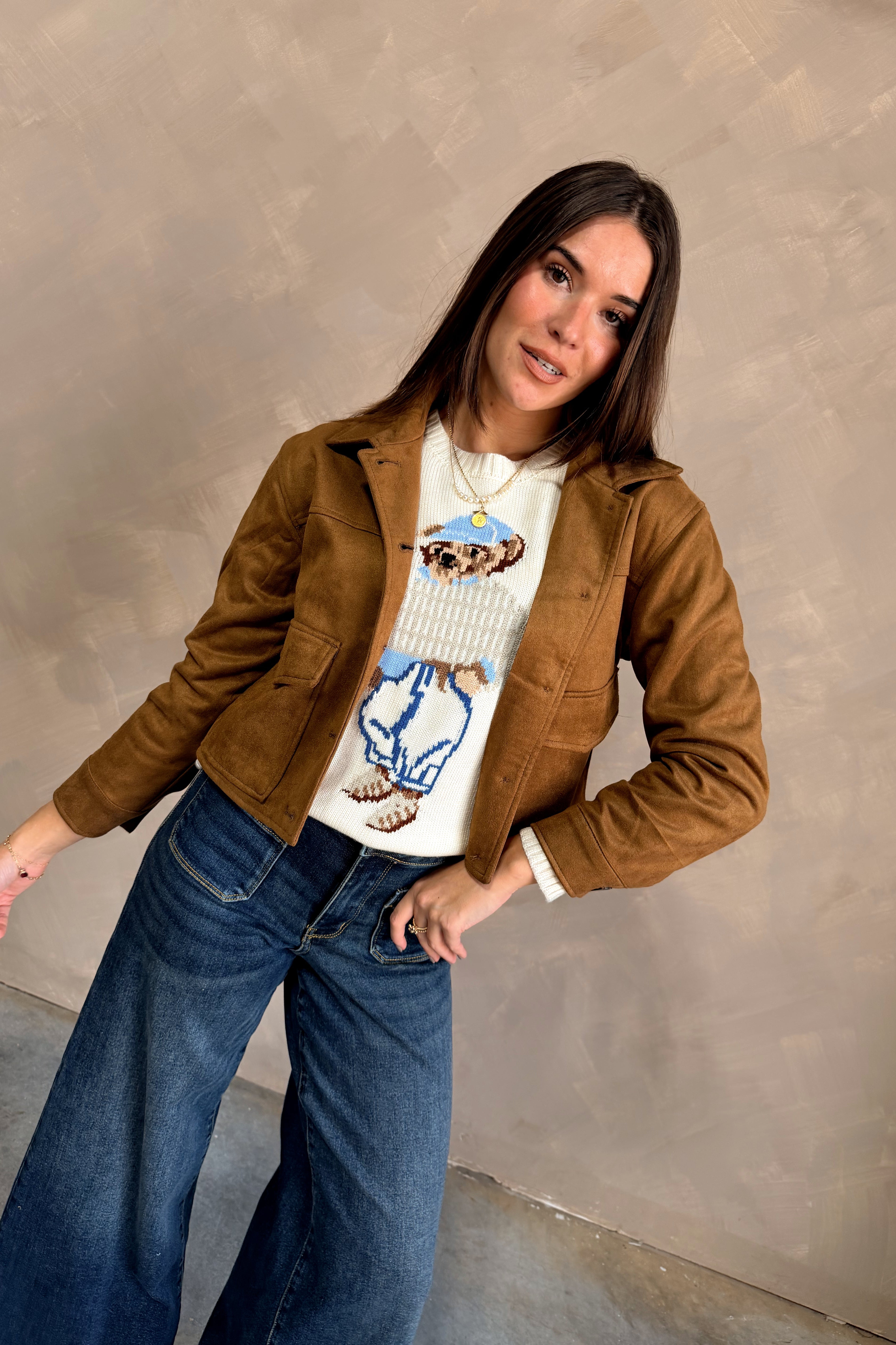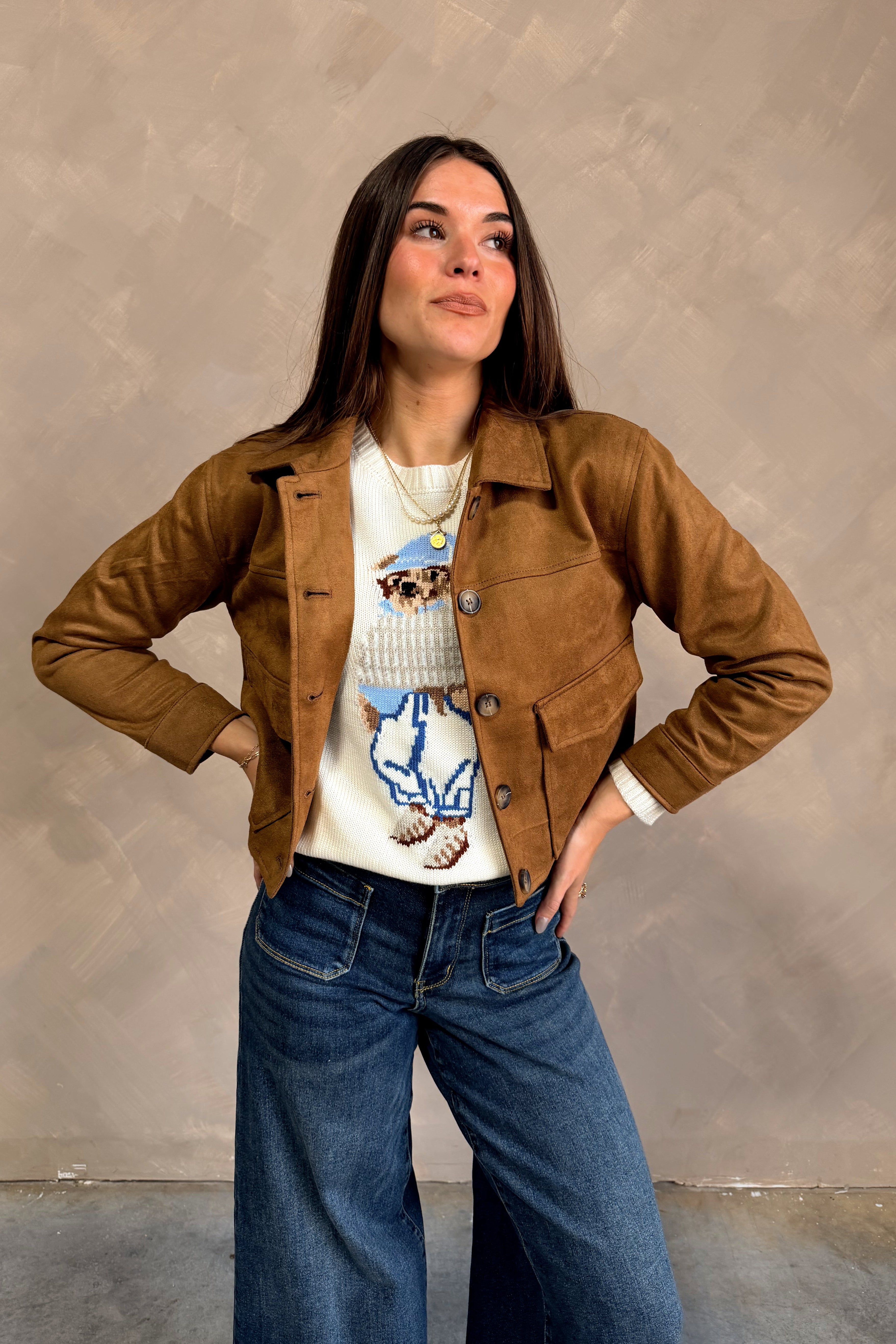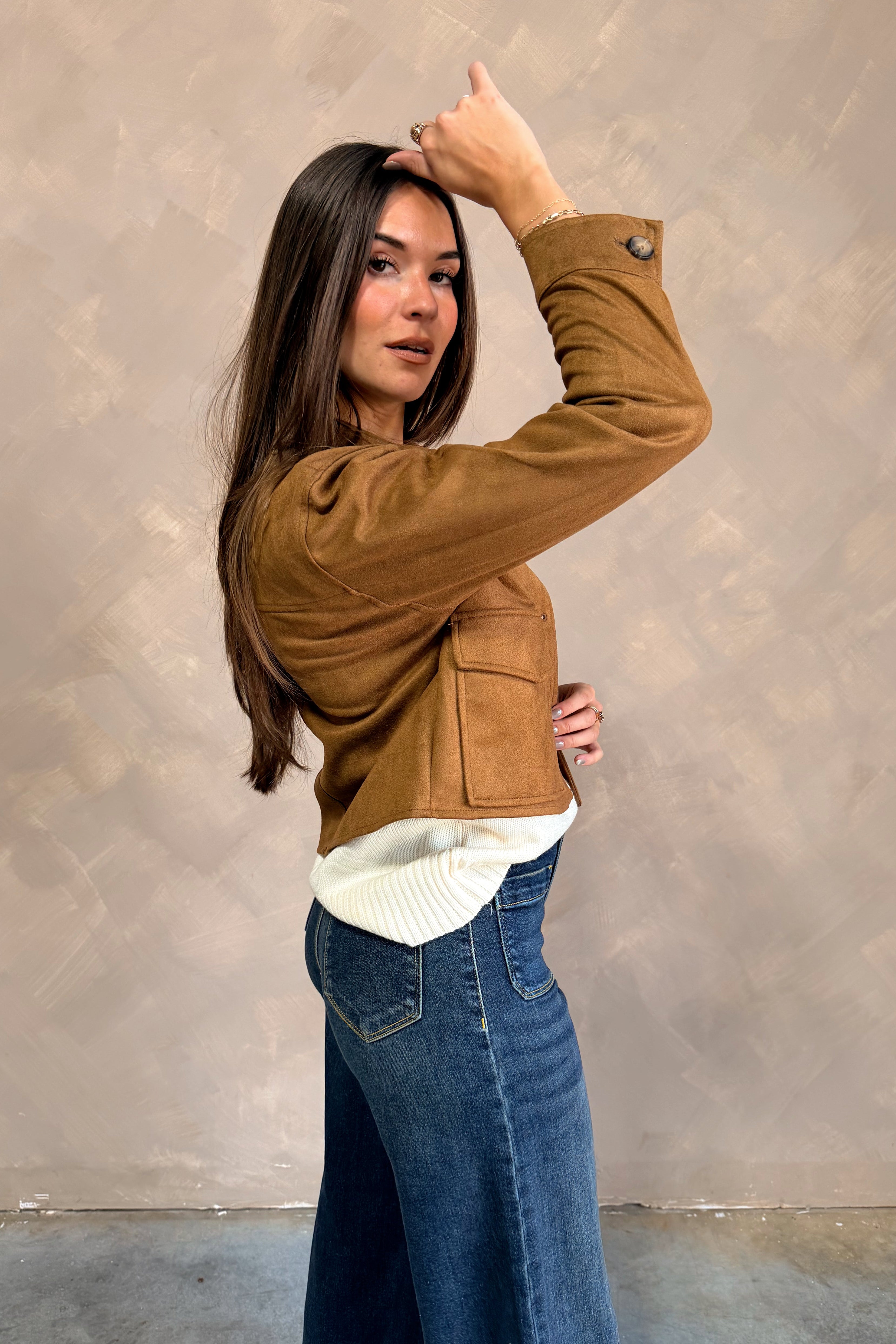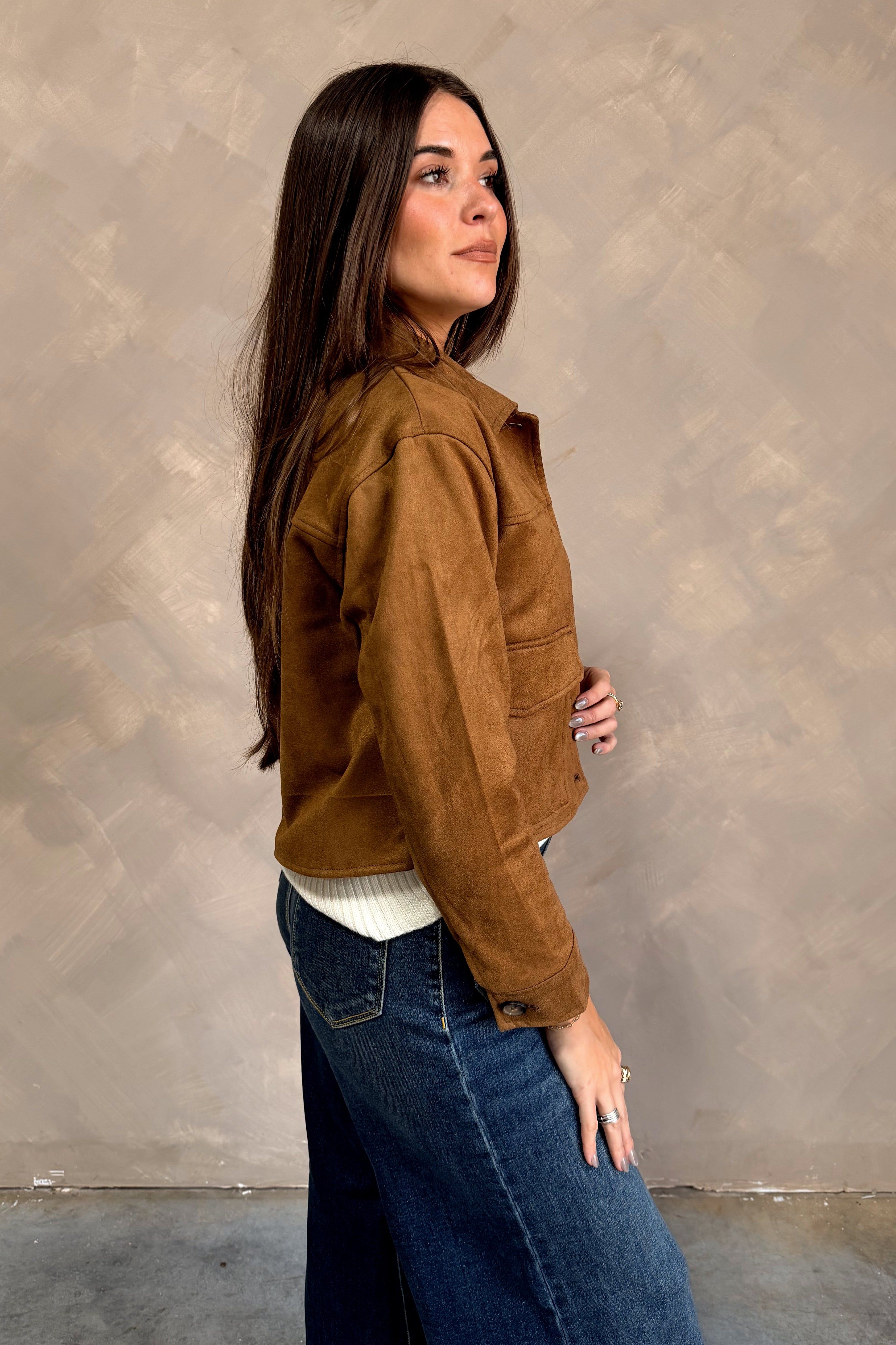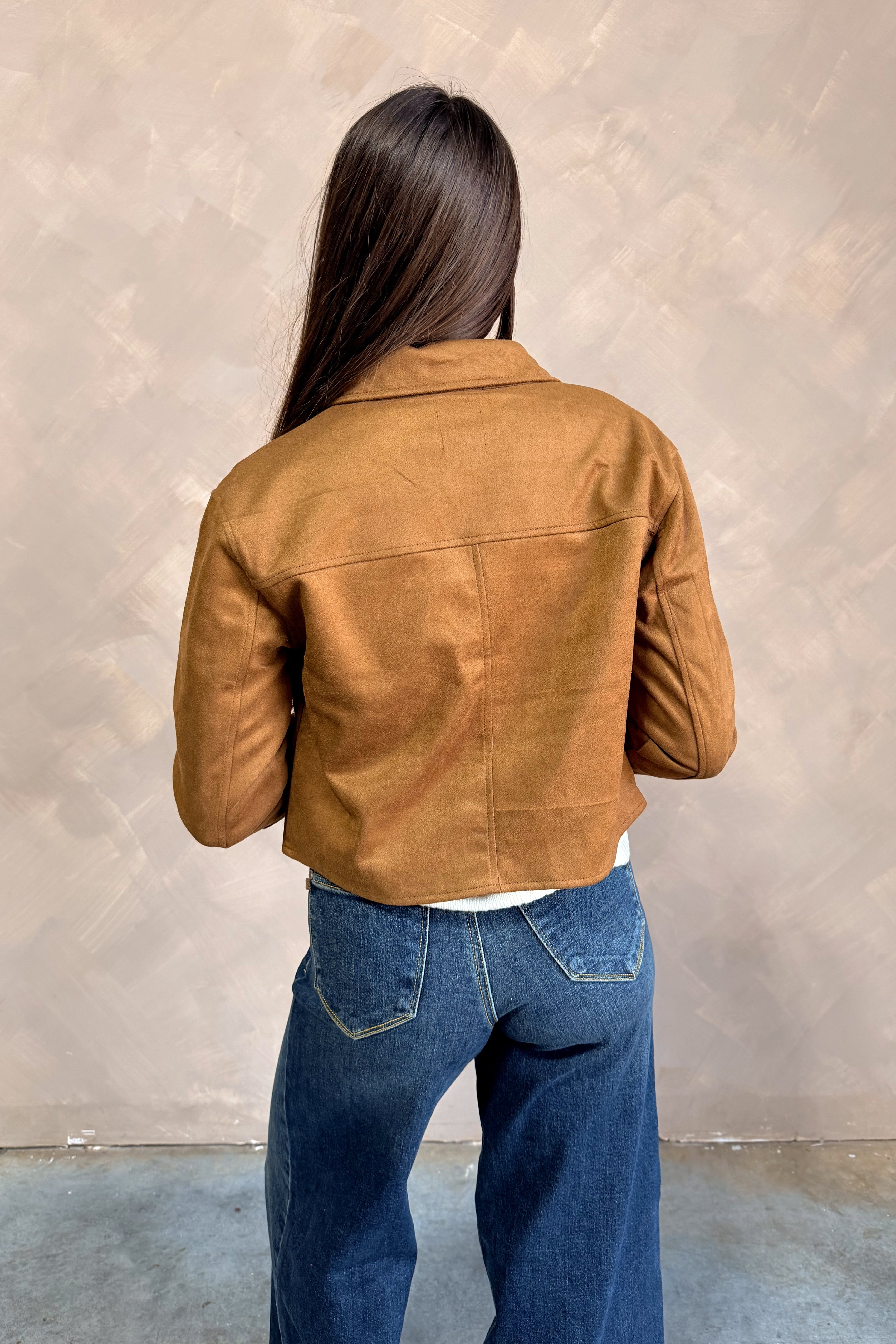 The Monroe Camel Suede Cropped Jacket is a versatile wardrobe staple that combines classic tailoring with modern flair. Crafted from soft camel brown suede fabric, this jacket features a structured collar neckline and front button-up closure for a polished look. The cropped waist adds a contemporary touch, making it perfect for pairing with high-waisted jeans, skirts, or trousers.