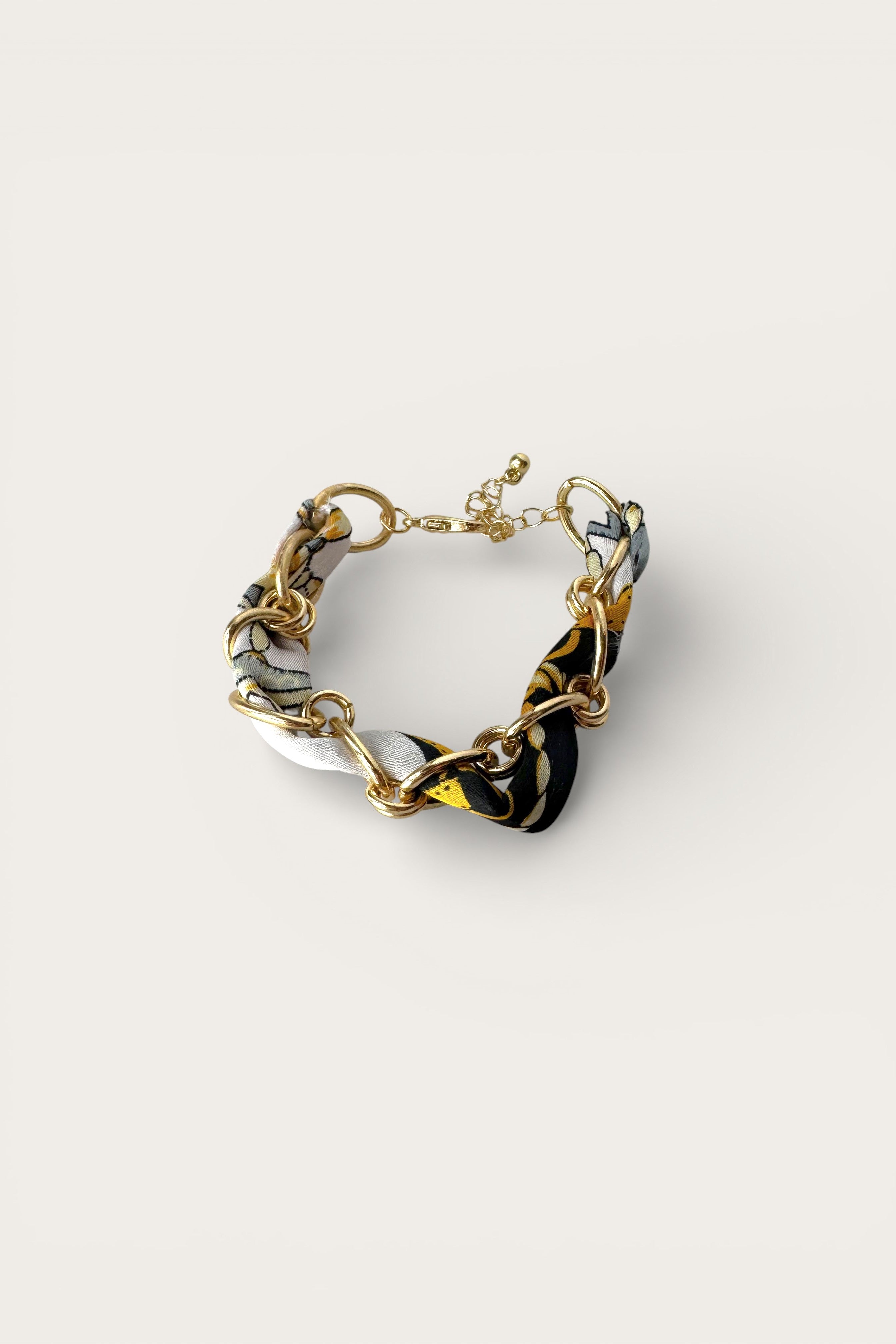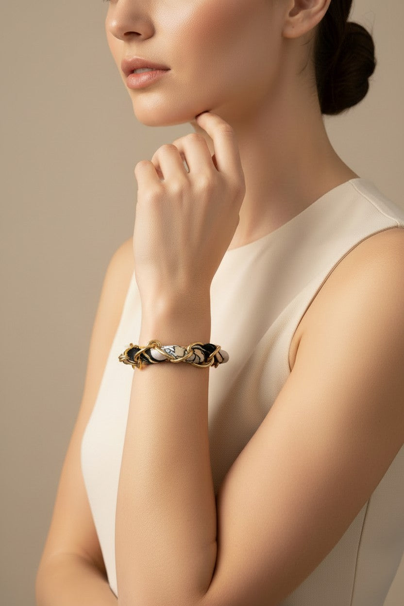 Bold and fashion-forward, the Nova Black Multi Scarf Chain Bracelet is a standout accessory with modern edge. Featuring a gold chain bracelet woven with a black multi-print scarf, this piece blends texture and style effortlessly. Finished with an adjustable clasp for the perfect fit, Nova adds a chic, statement touch to both casual and elevated looks.
