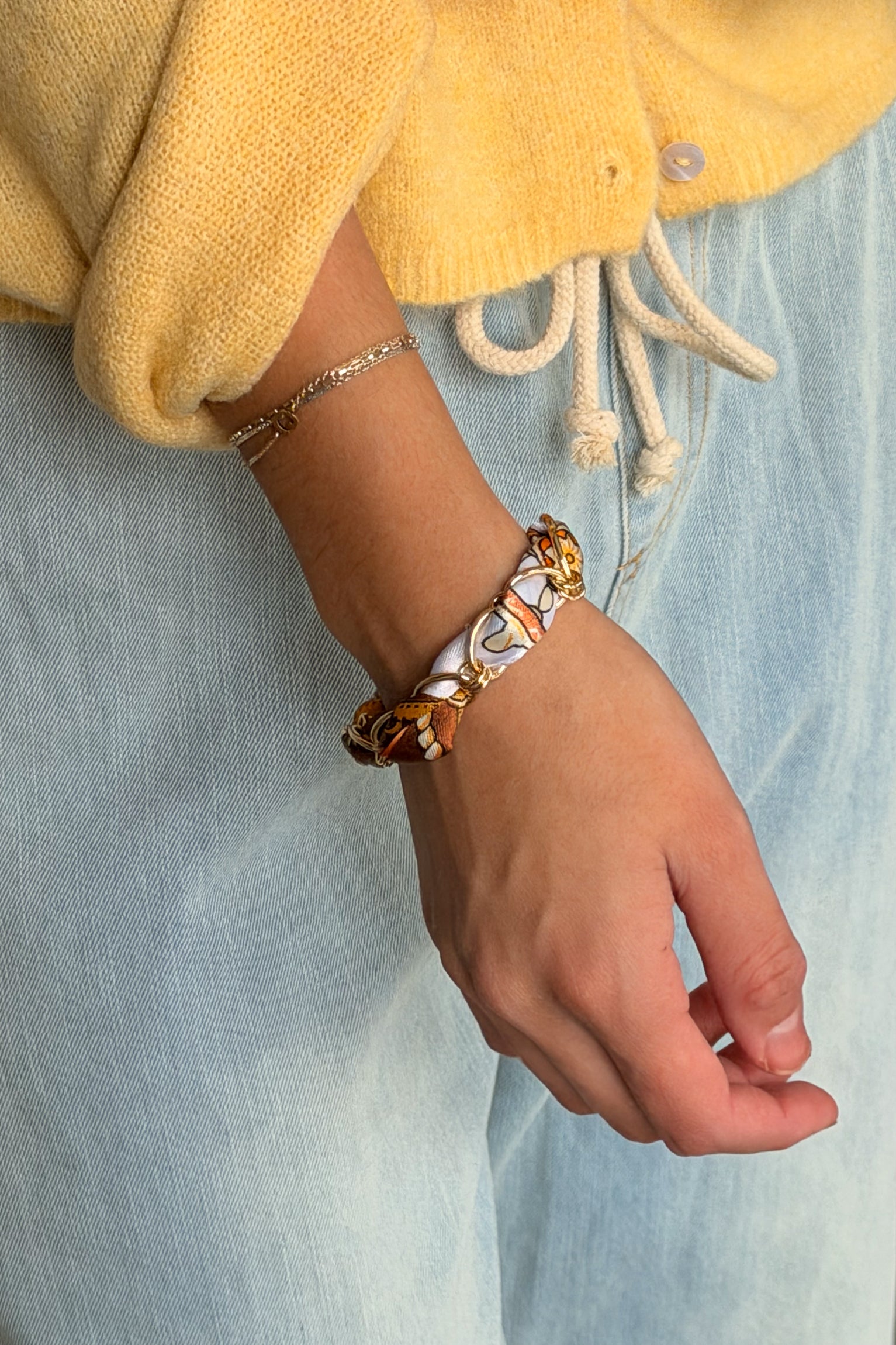 Warm and stylish, the Nova Brown & Orange Scarf Chain Bracelet is a versatile accessory with a playful twist. Featuring a gold chain bracelet woven with a brown multi-printed scarf and finished with an adjustable clasp, this bracelet adds texture, color, and effortless charm to any look. Perfect for layering or wearing solo, Nova brings a chic, statement touch to your jewelry collection.