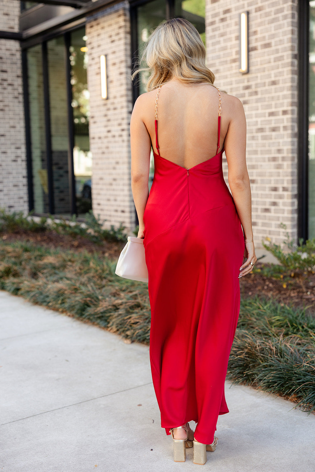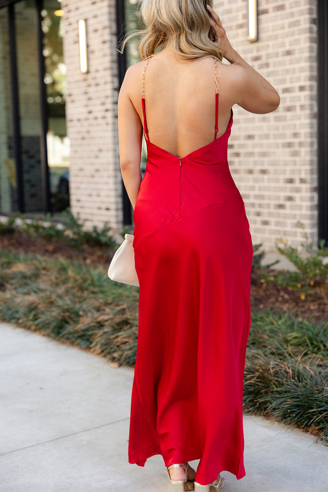 Nyla Gold Chain Halter & Red Satin Dress