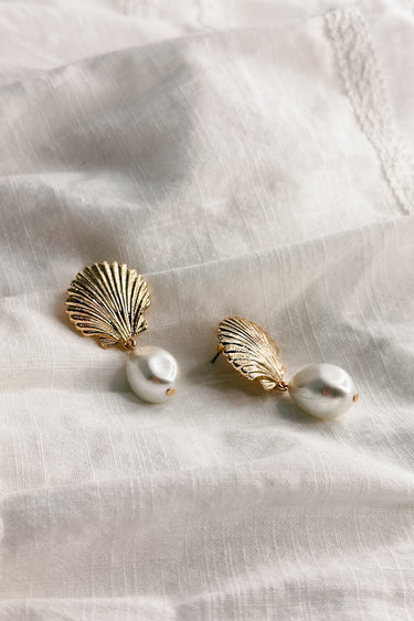 Each earring features exquisite gold seashell-shaped studs, evoking the serene beauty of the ocean. Linked with delicate finesse is a luminous pearl medallion, reminiscent of treasures found along sandy shores.