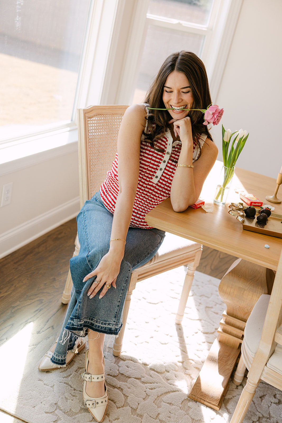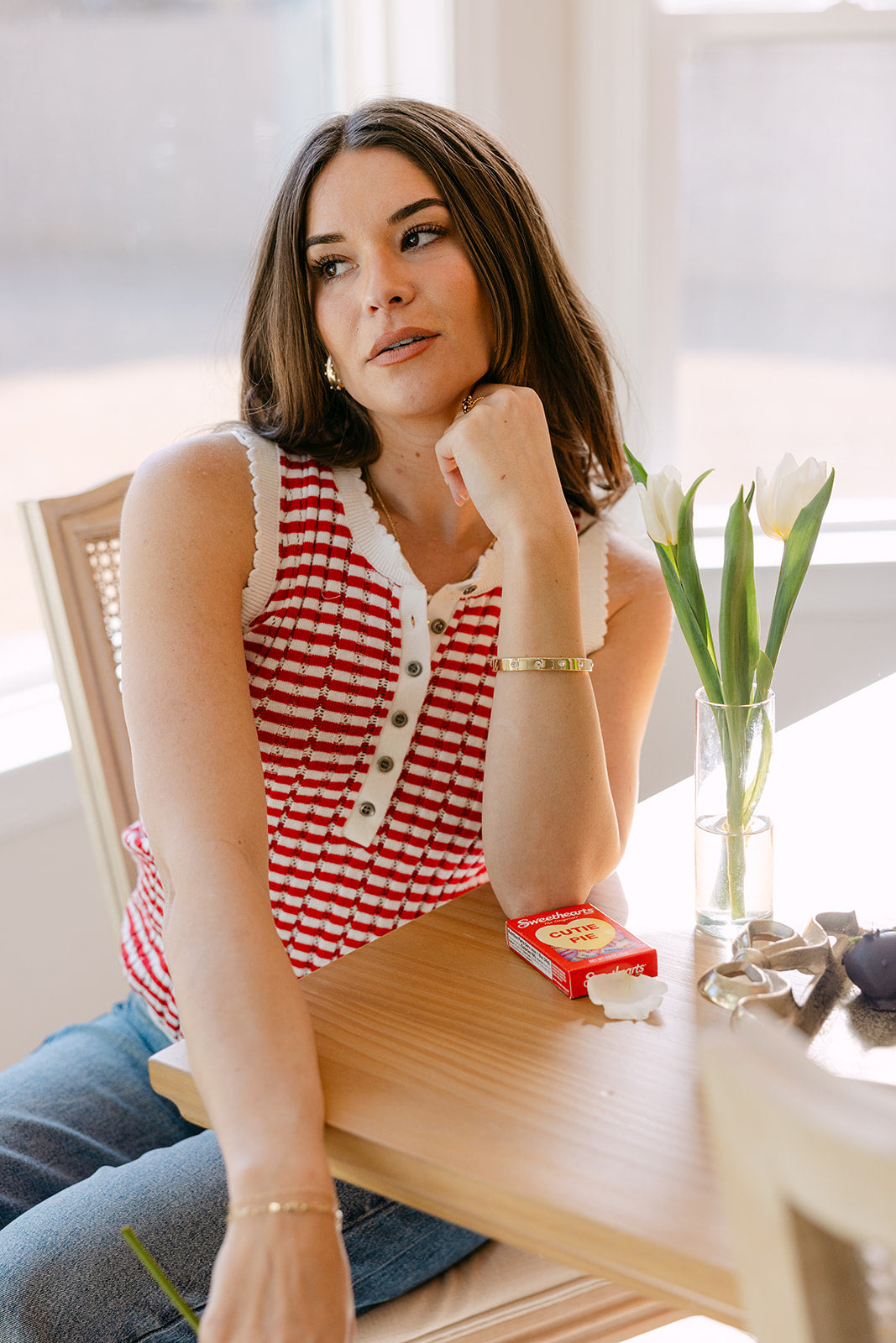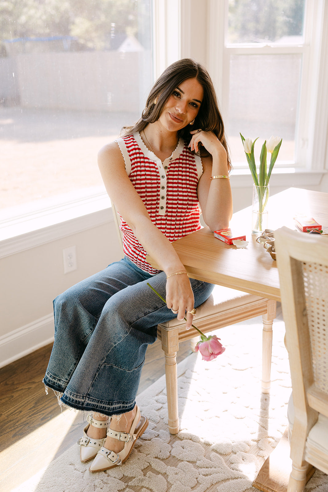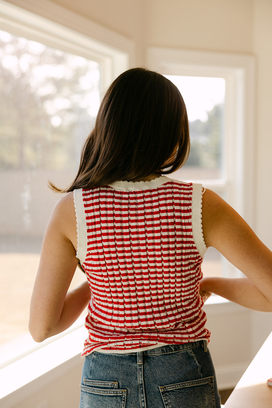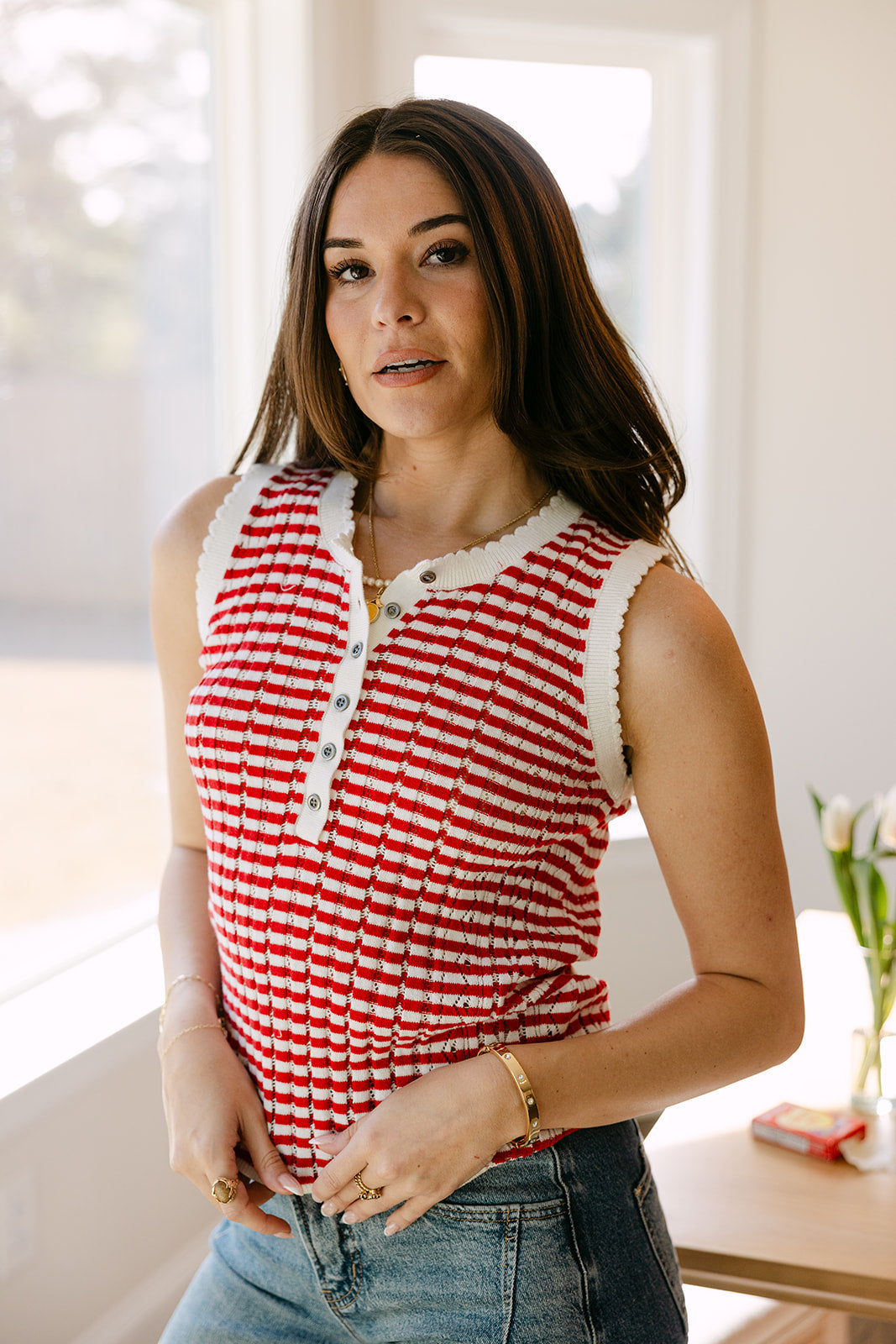 The Poppy Red & White Striped Tank Top is a playful, polished knit perfect for warm days and easy layering. Made from red and white knit fabric, this tank features a classic stripe print with a quarter button-up detail at the neckline for a touch of charm. The round neckline keeps the look timeless, while the scalloped hem adds a feminine finish.
