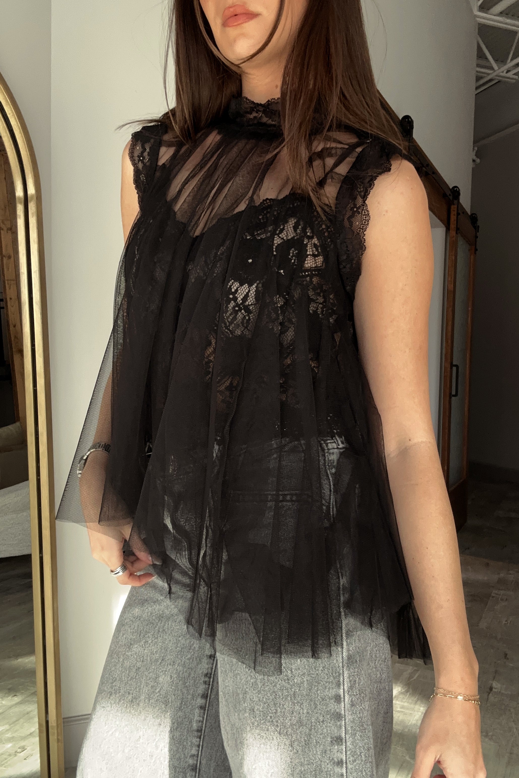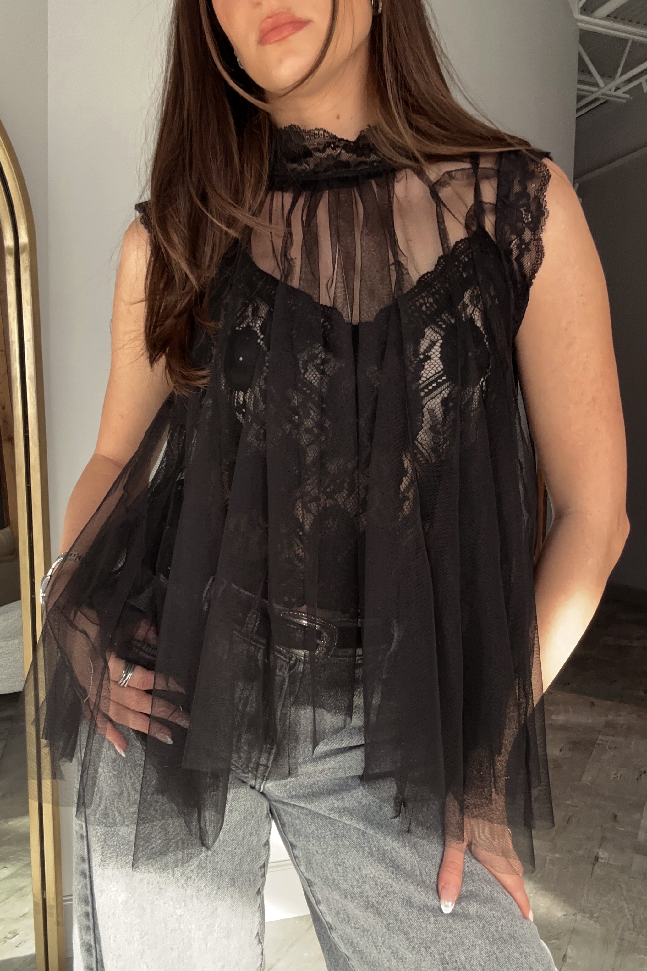 Delicate yet dramatic, the Rachel Black Tulle & Lace Flare Tank is a statement piece designed to elevate any look. Crafted with sheer black tulle, this tank is beautifully layered over a lace-lined interior, creating rich texture and an elegant, romantic feel. The high neckline adds a refined touch, while intricate lace detailing brings feminine charm throughout.