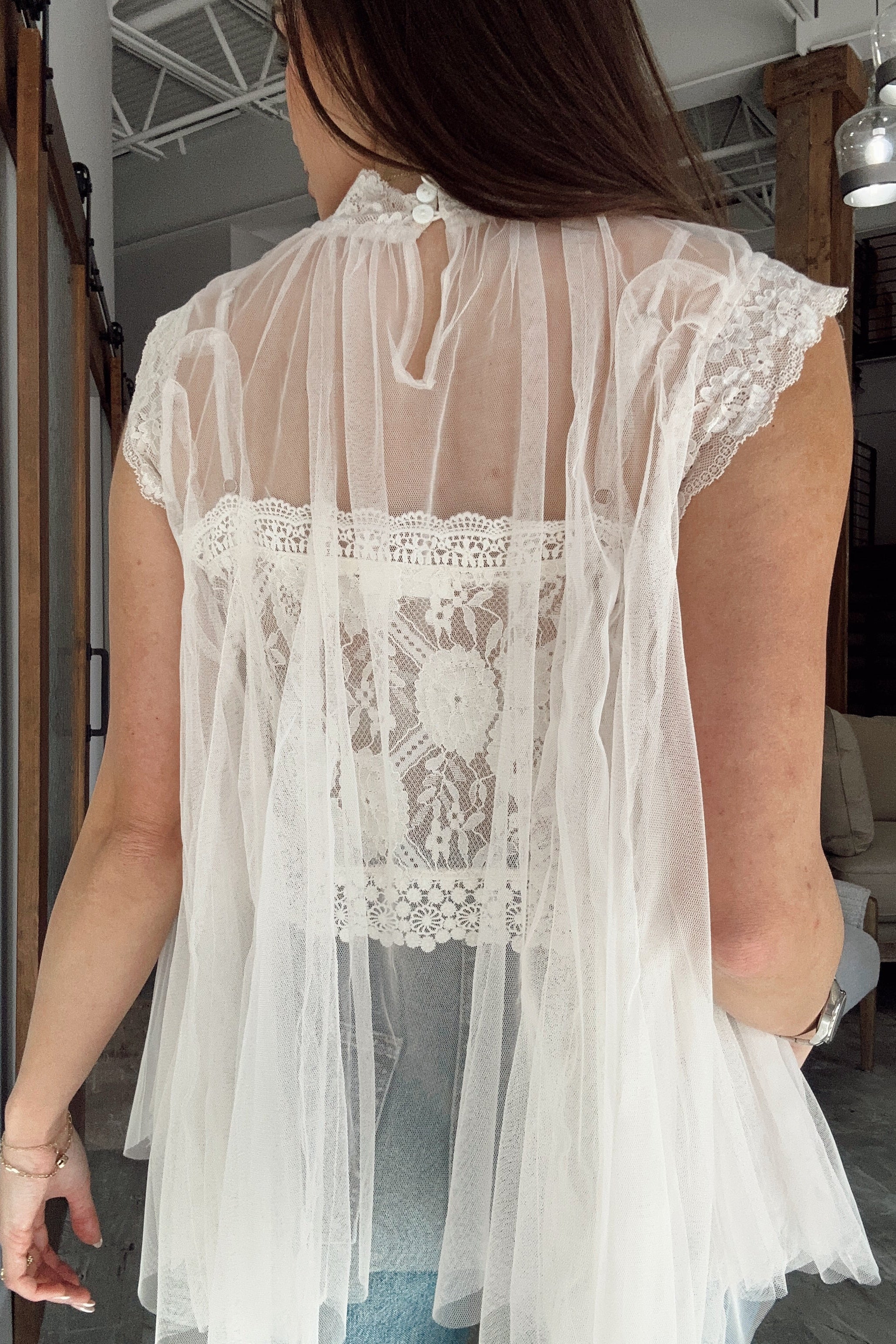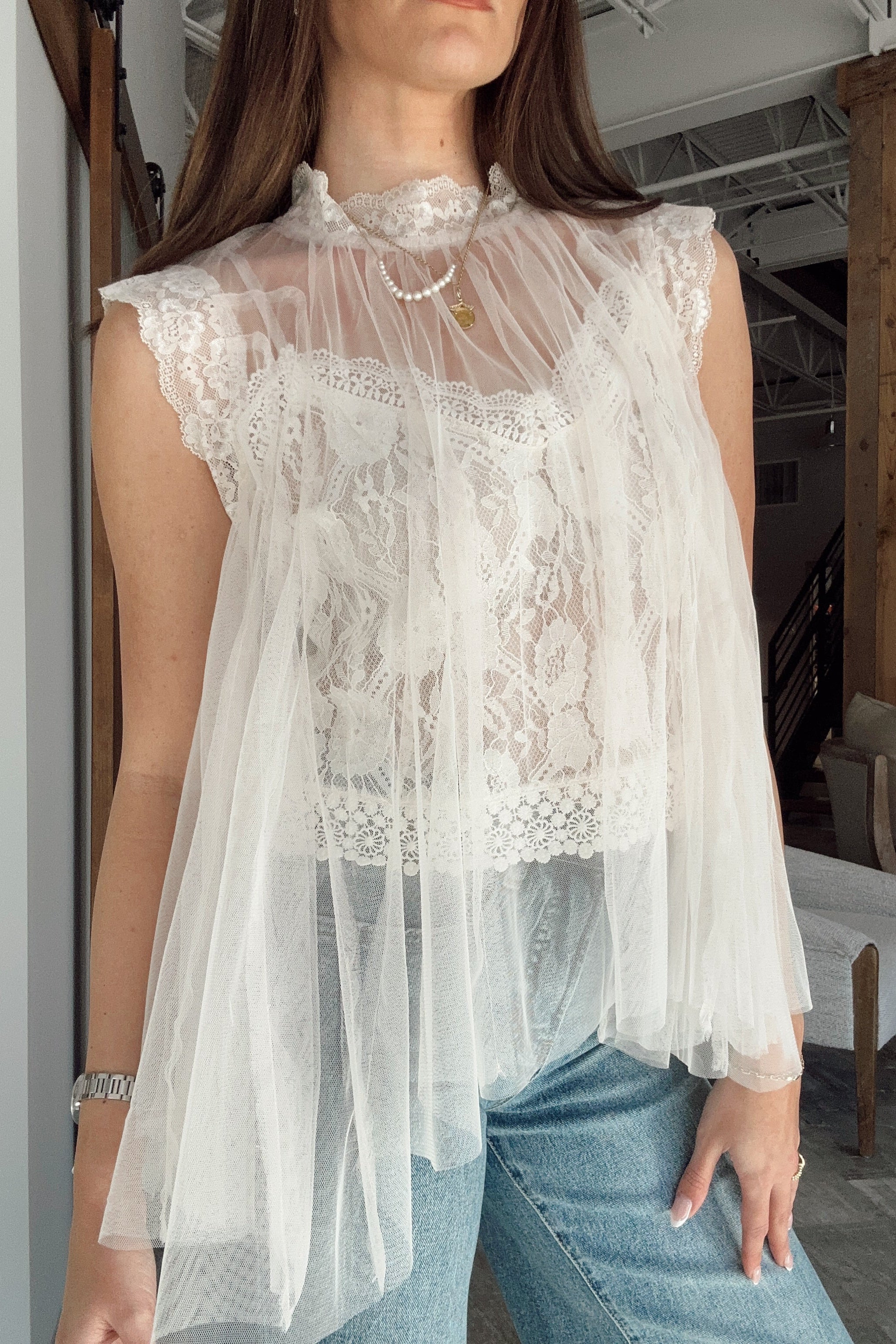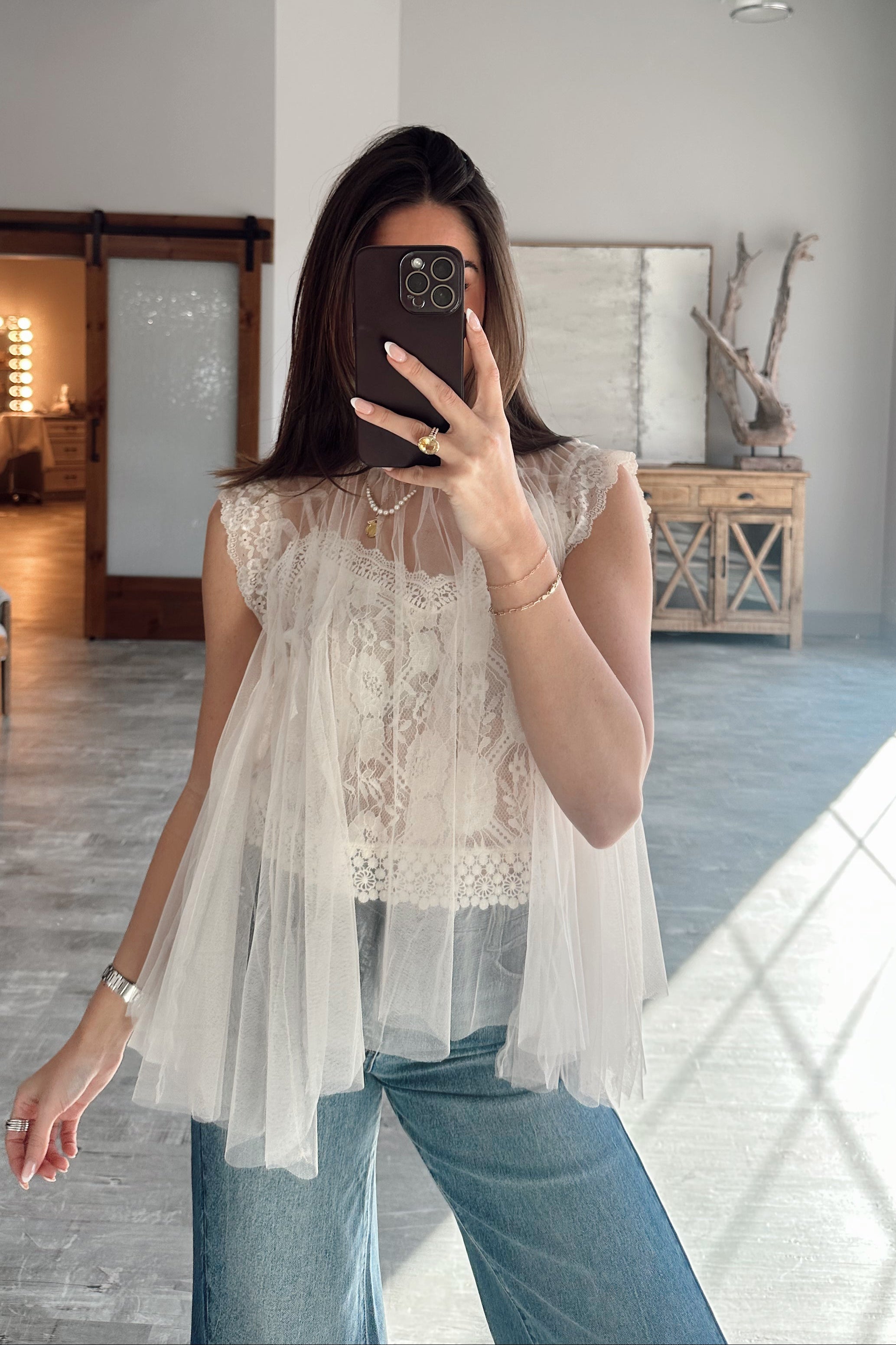 Elegant and romantic, the Rachel Ivory Tulle & Lace Flare Tank is a beautifully refined piece designed to elevate your look. Crafted with airy ivory tulle layered over a delicate lace-lined tank, this top offers soft texture and graceful dimension. The high neckline creates a polished silhouette, while intricate lace details add timeless femininity.