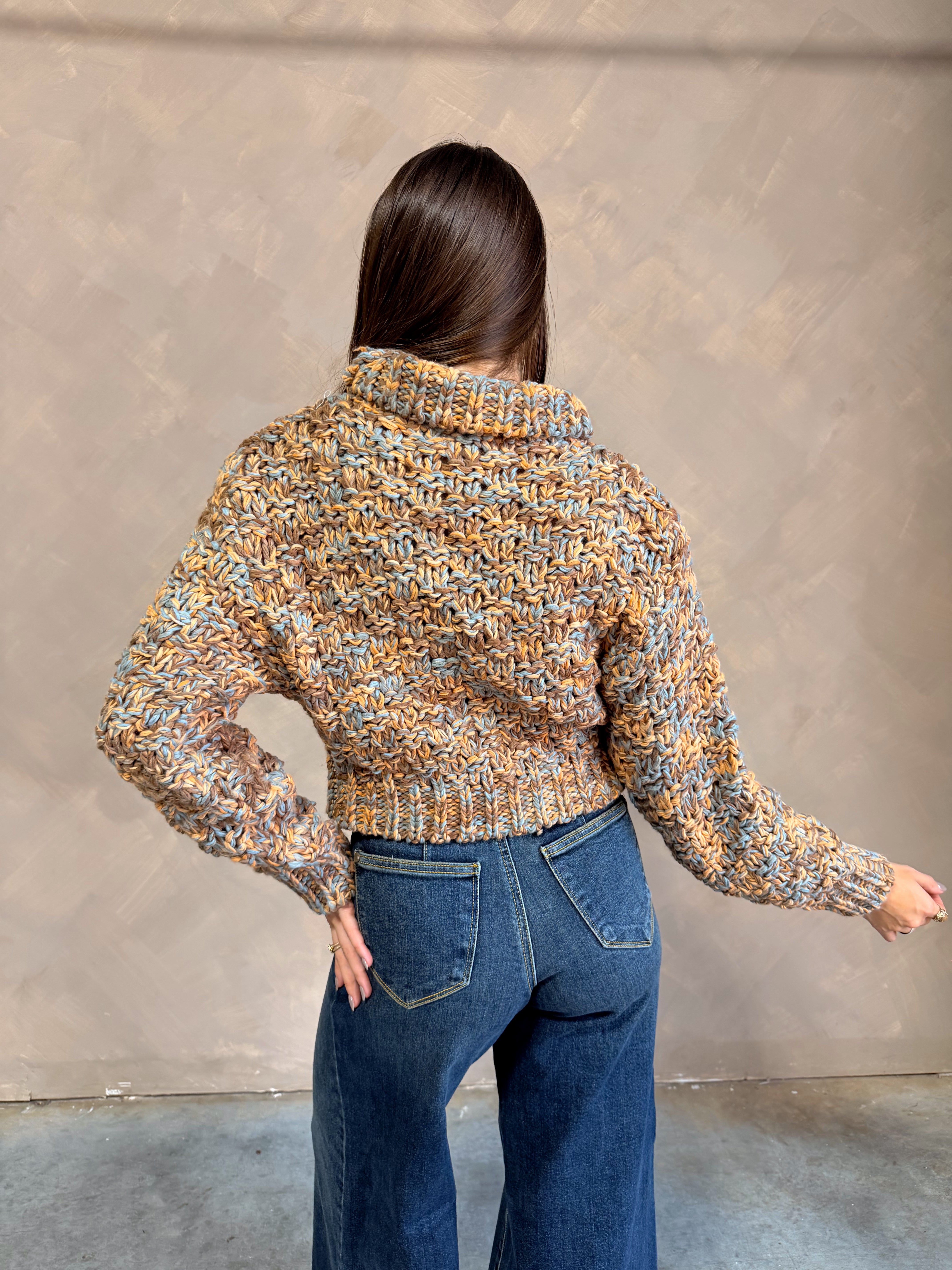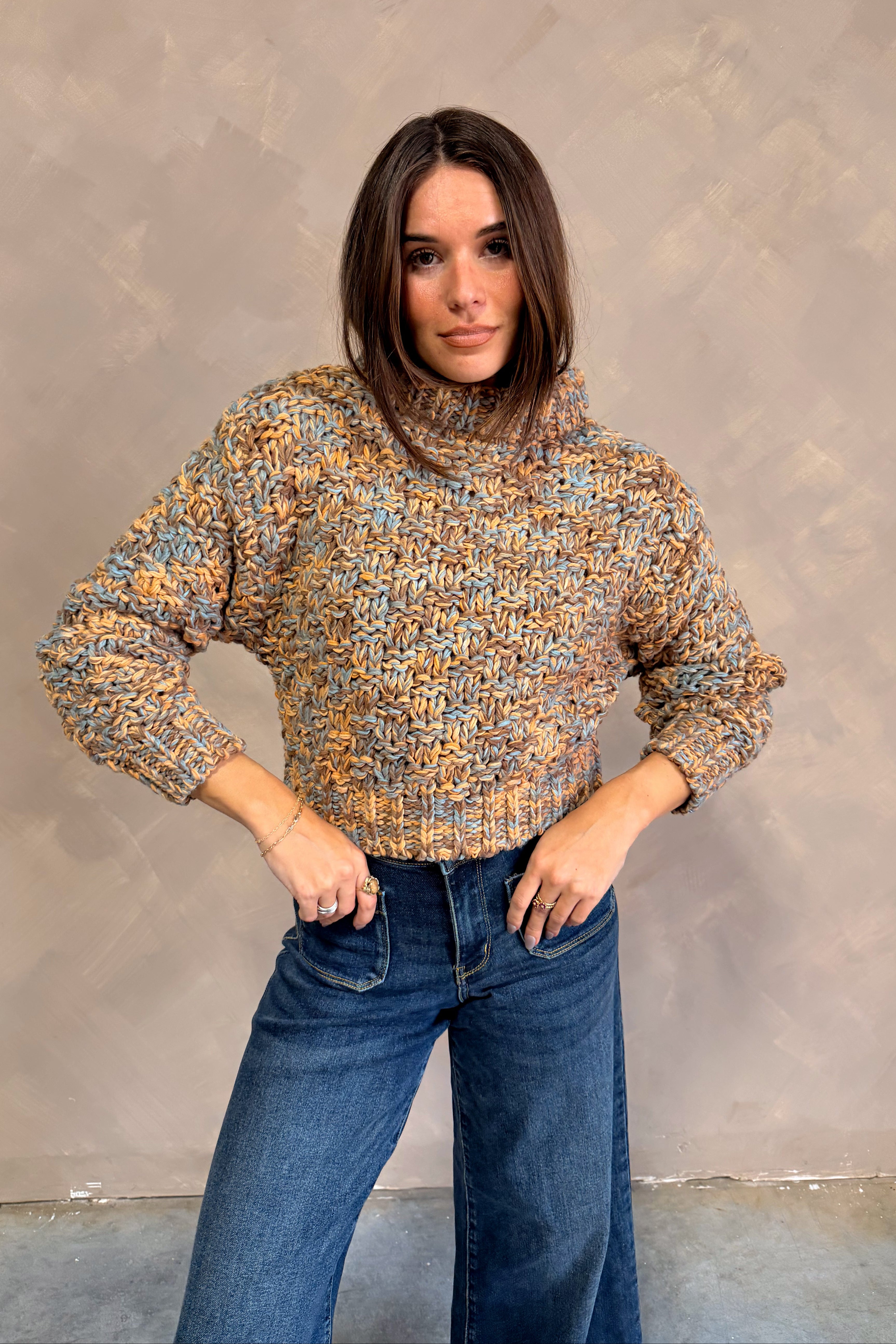 The Rachele Multi Color Mock Neck Sweater brings a fun pop of color and texture to your cool-weather wardrobe. Crafted with blue, orange, and taupe open knit fabric, it blends warm and cool tones for a unique, eye-catching look. The mock neckline adds a cozy touch, making it perfect for pairing with jeans, trousers, or layered under a jacket.