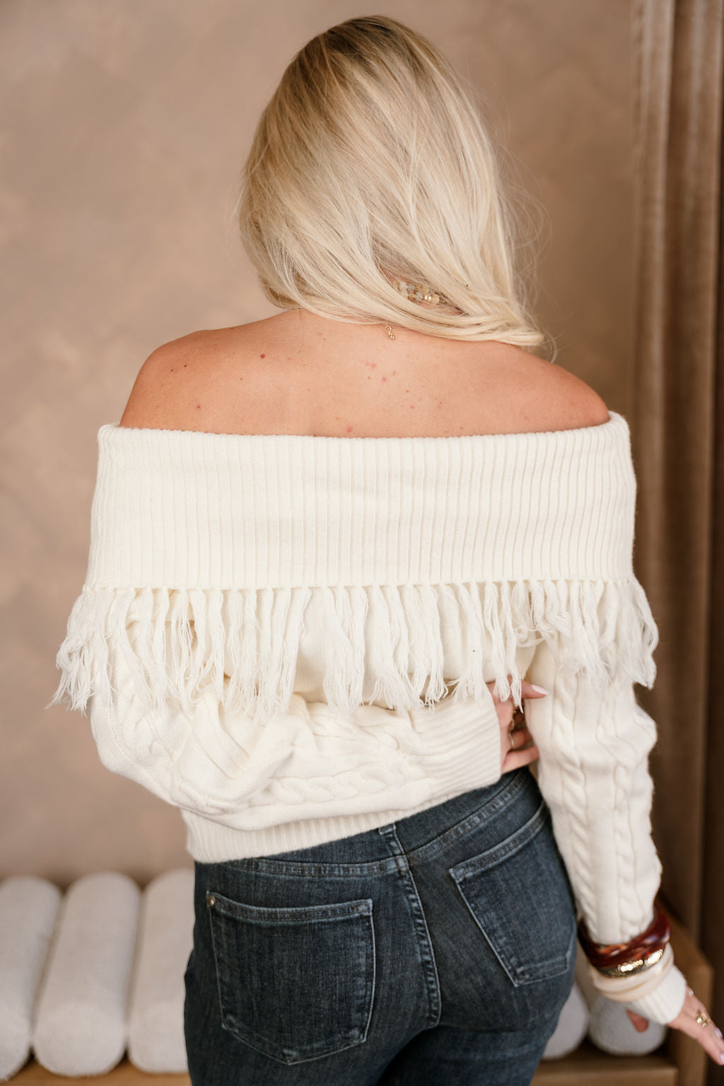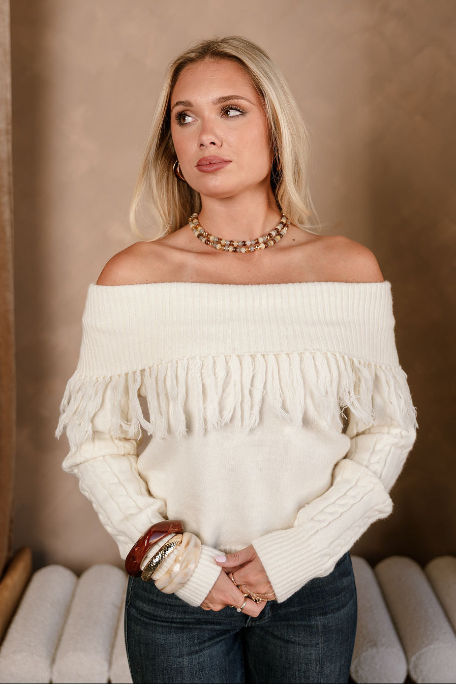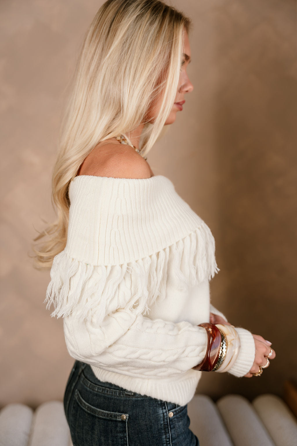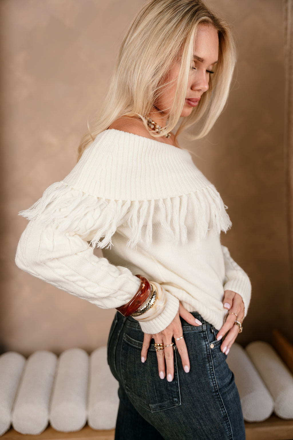 Raya Ivory Fringe Off-The-Shoulder Sweater
