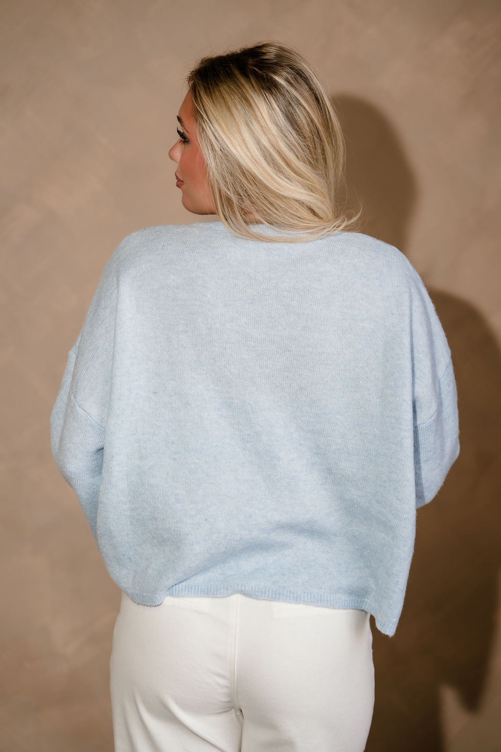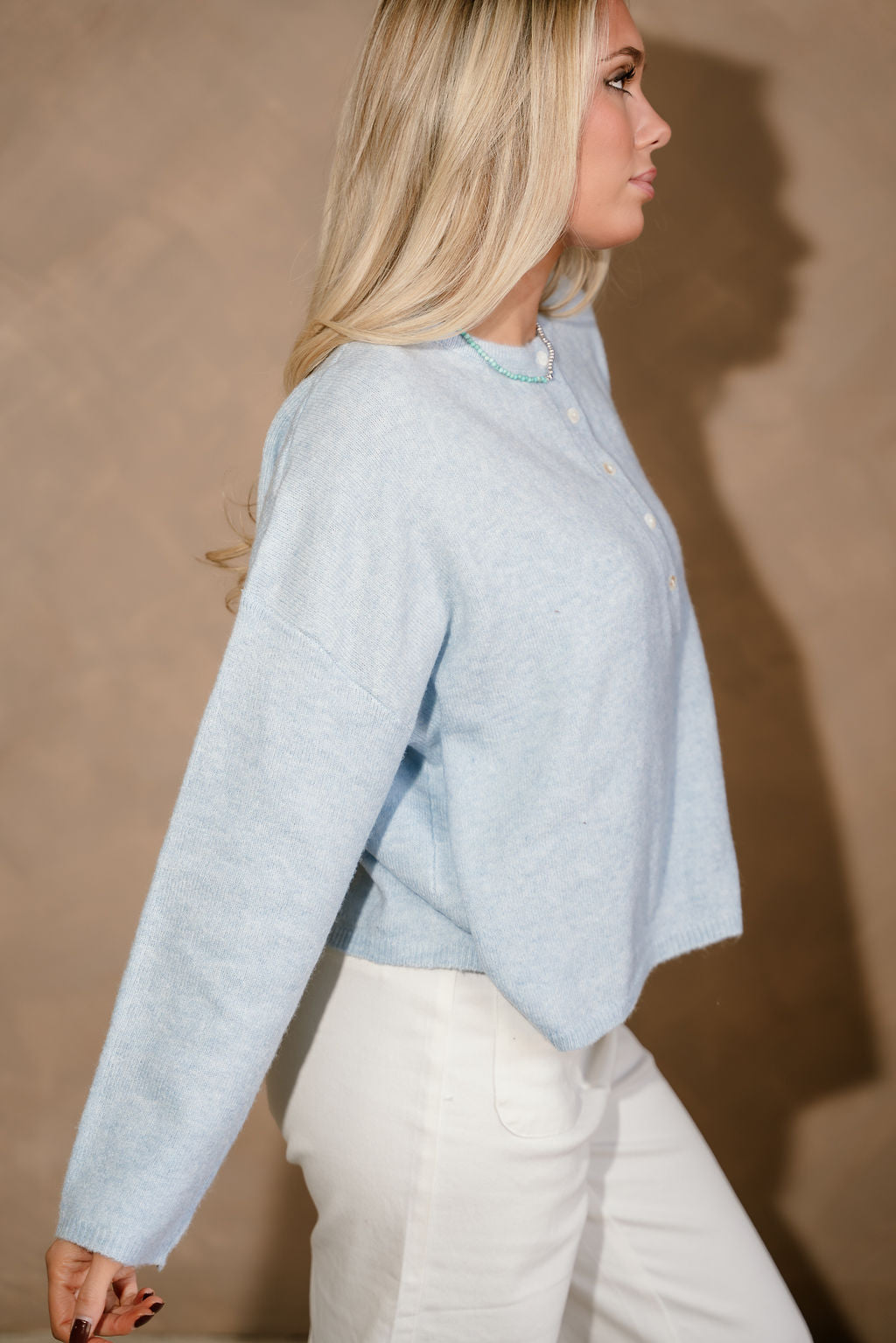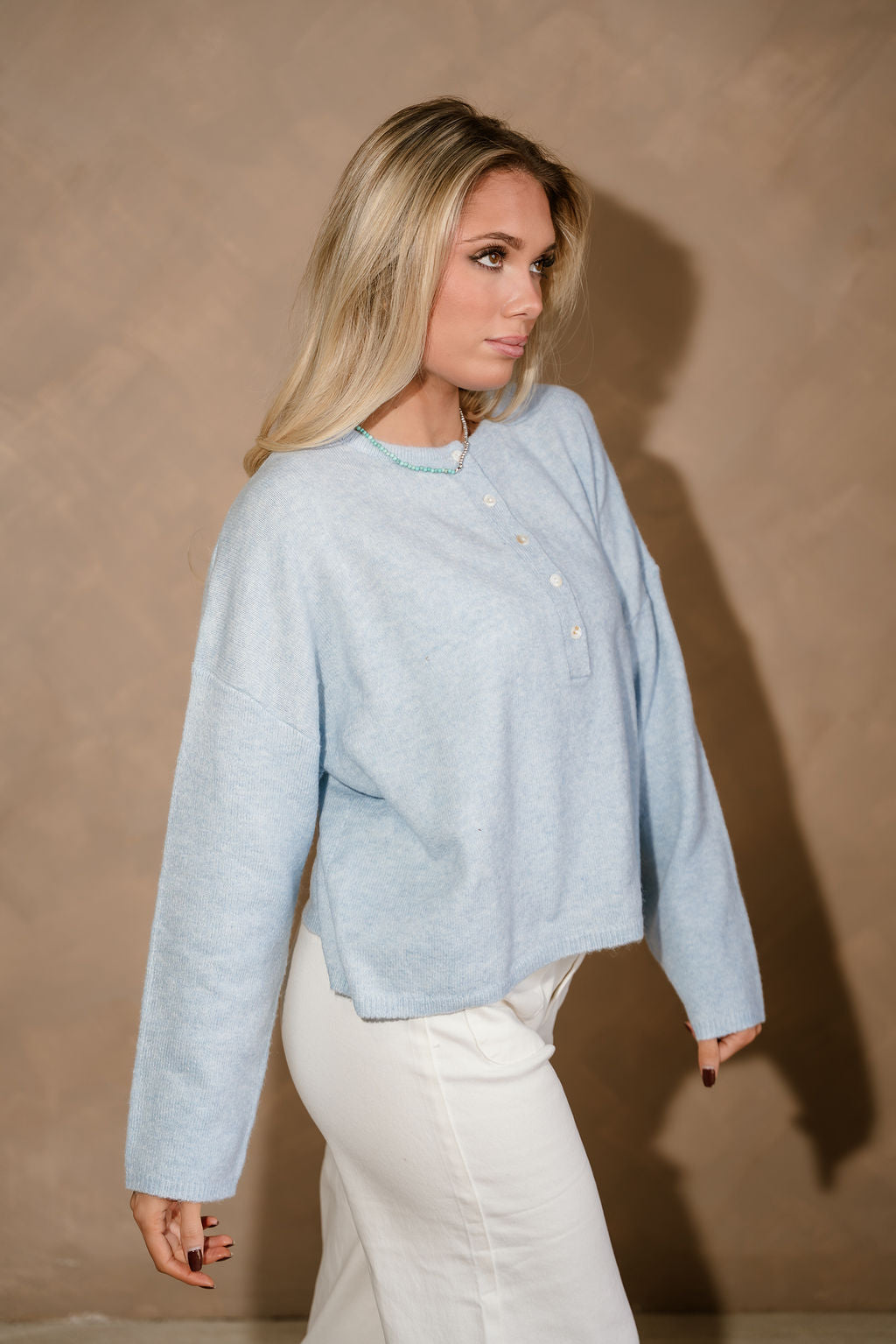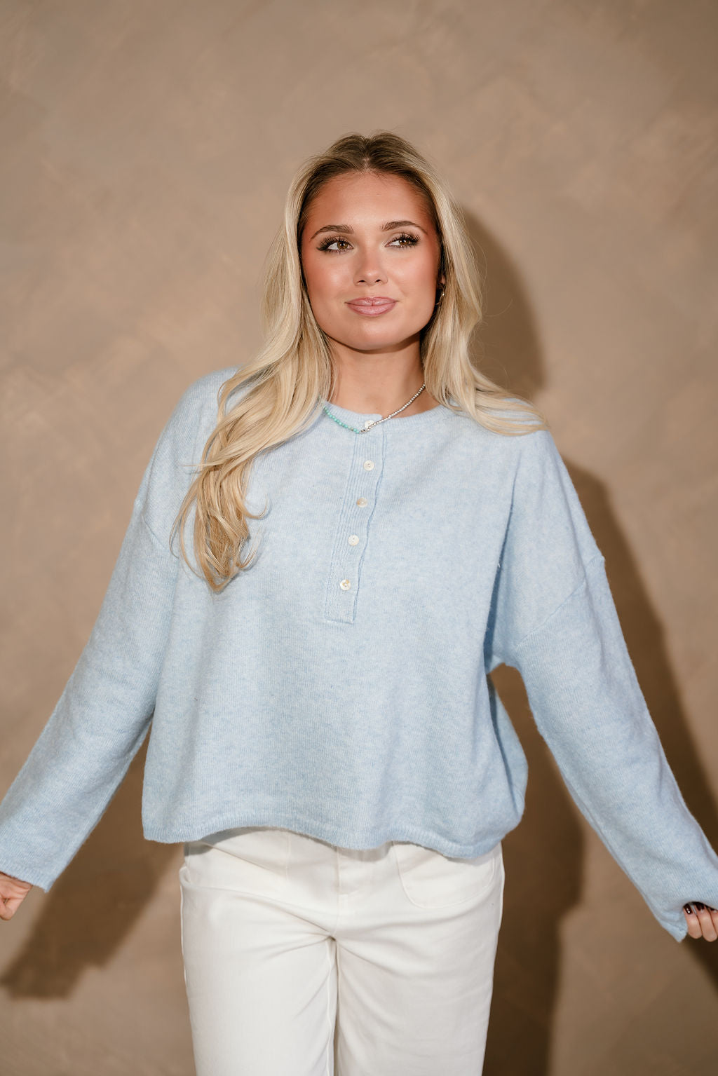 The Reese Light Blue Quarter Button Sweater is a timeless knit essential with a fresh, easygoing feel. Made from soft light blue knit fabric, this sweater features a classic round neckline and a quarter button-up front that adds a subtle, polished detail. The relaxed silhouette makes it perfect for everyday wear while still feeling put together.