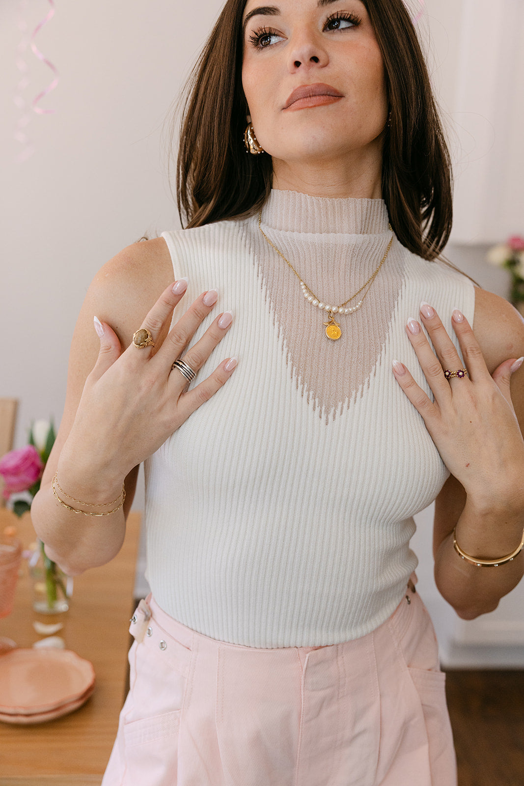 A striking mesh V detail adds a contemporary edge, creating visual interest while maintaining an elegant, minimalist feel. The high neckline enhances its polished look, making it perfect for both casual and elevated outfits. Designed with a sleeveless silhouette, the Rhea tank is ideal for warm-weather wear or layering under jackets and cardigans.