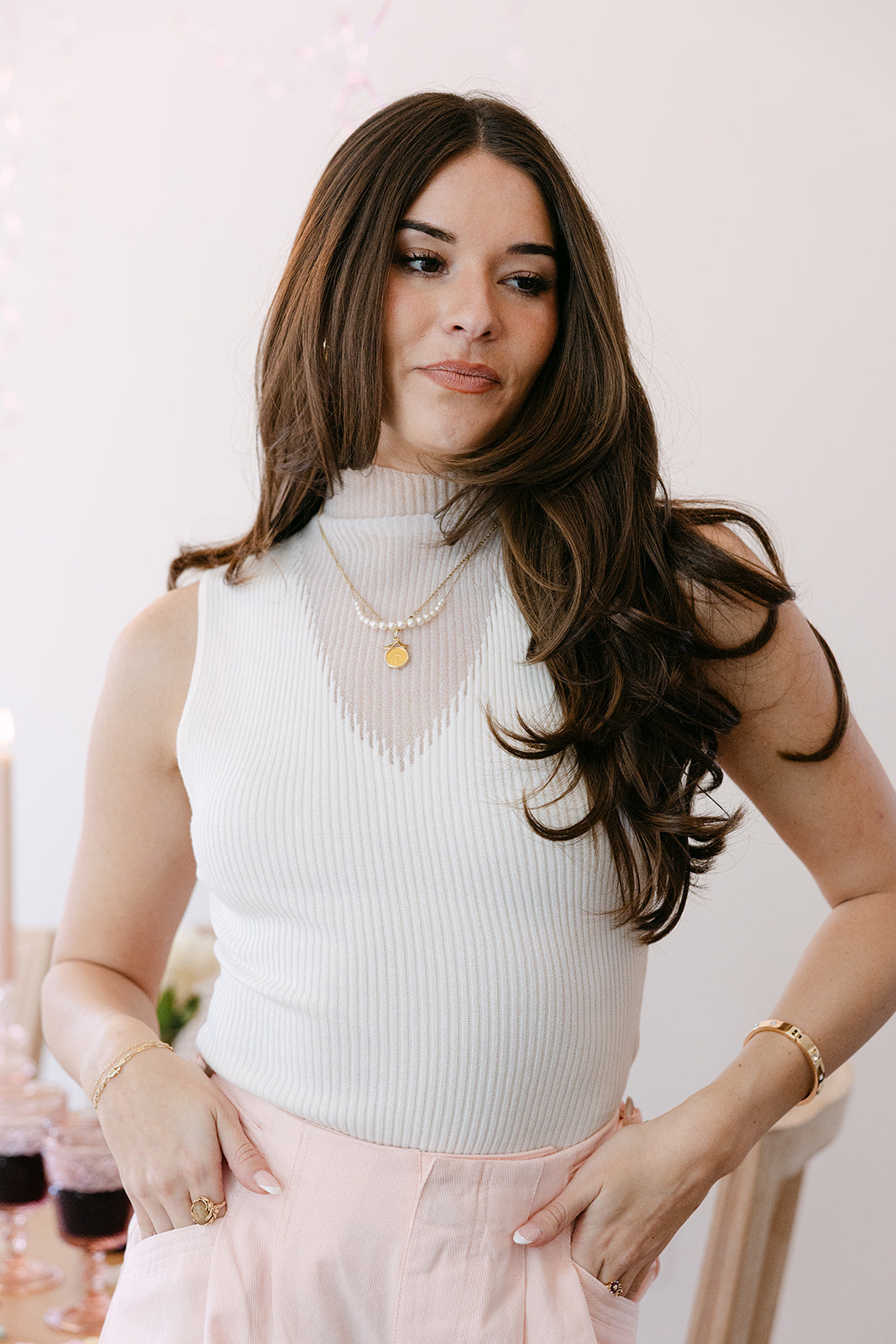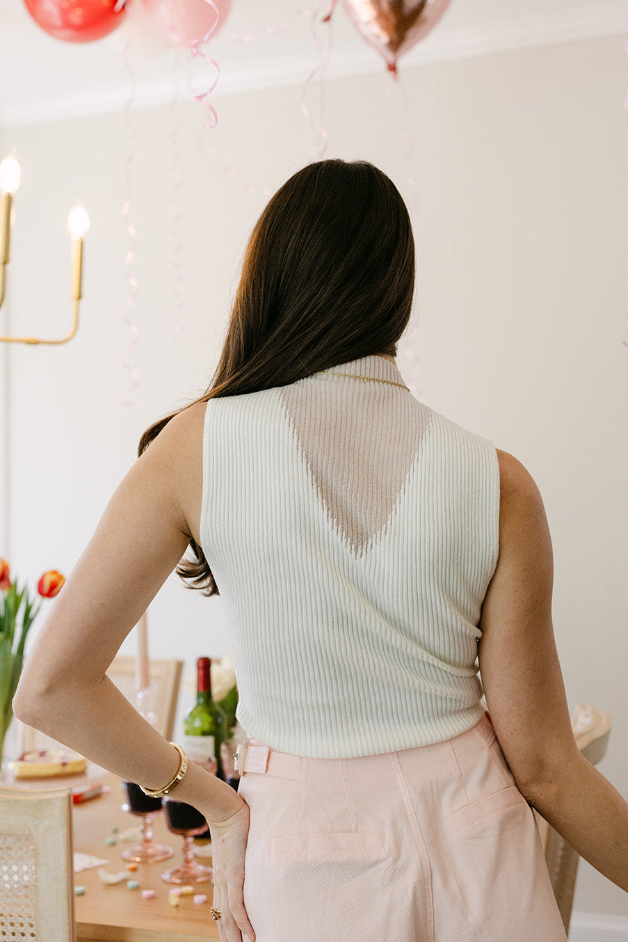 Versatile and timeless, it pairs seamlessly with denim, skirts, or tailored pants. Whether styled on its own or layered for added dimension, the Rhea Cream Ribbed & Mesh Tank delivers modern sophistication with a clean, feminine finish.