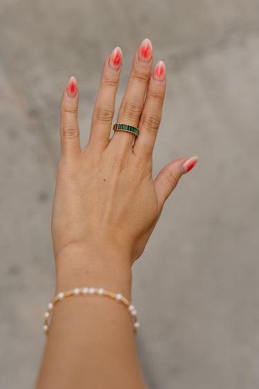 Add a pop of color to your accessory lineup with the Rima Ring. This gold-dipped statement piece features brilliant emerald green stones set in a sleek gold setting. The band is adjustable, making it easy to wear on any finger and ideal for stacking or wearing solo. Whether you’re dressing up a casual look or finishing an evening outfit, the Rima Ring brings a vibrant, luxe touch.