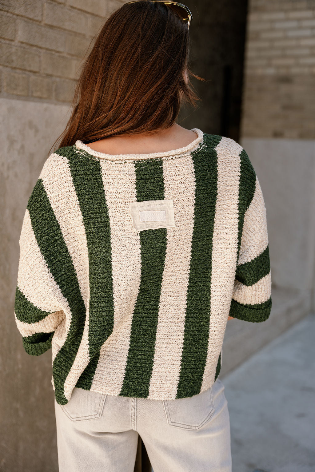 The Rosa Green & White Stripe Knit Sweater is a fresh and stylish addition to your casual wardrobe. Crafted from soft green and cream knit fabric, it features a classic stripe print with subtle side details for added interest. The round neck with a v-neckline overlay adds a modern twist, while short sleeves with folded cuffs create a relaxed, polished silhouette. Perfect for pairing with jeans, skirts, or shorts, the Rosa sweater brings effortless charm to everyday outfits.