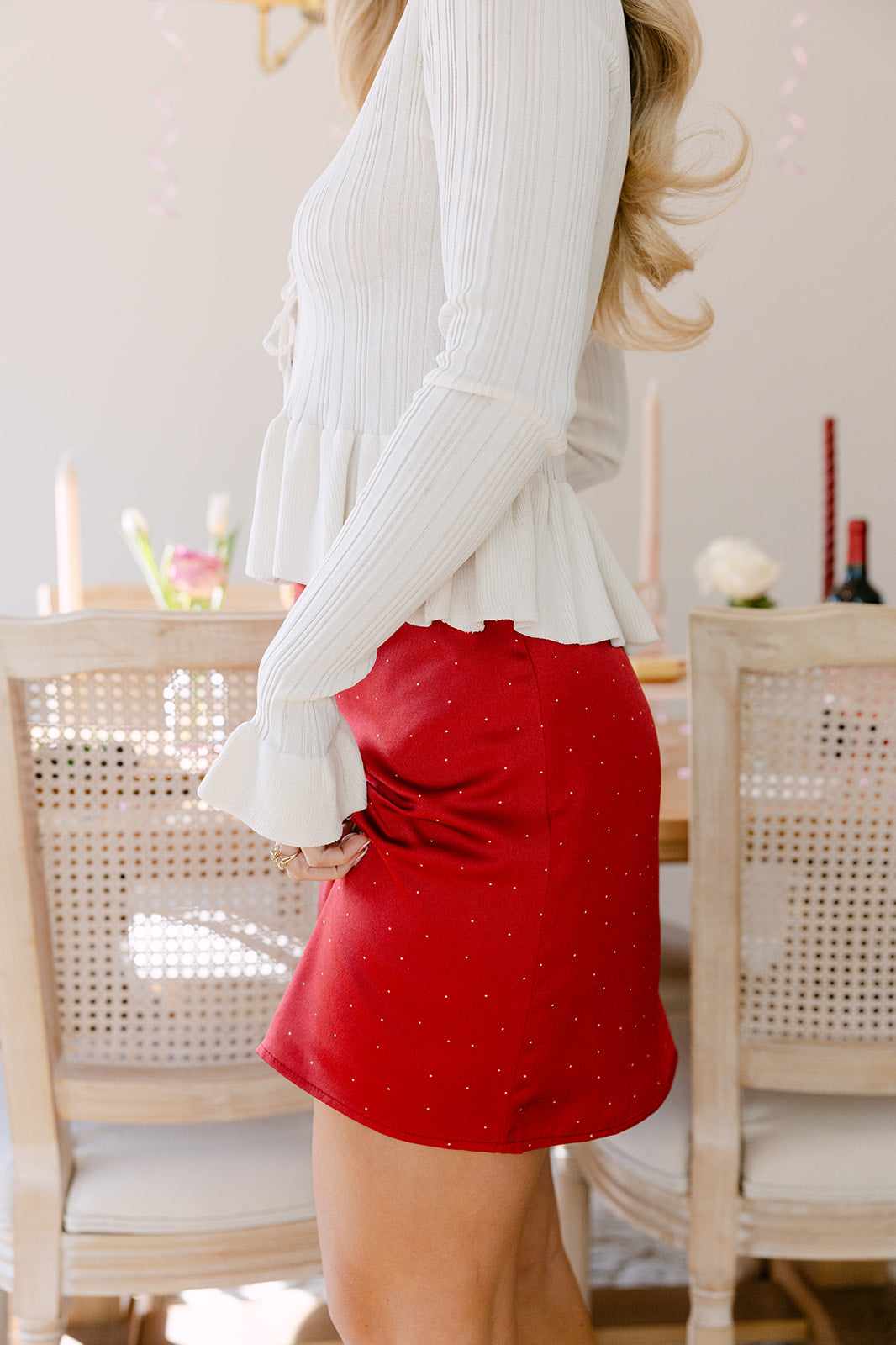 Playful yet polished, the Rosa Red & White Polka Dot Mini Skirt is a standout piece that brings vintage inspired charm to a modern silhouette. Crafted from smooth red satin fabric, this mini skirt features a soft sheen that adds a touch of elegance to its bold, eye catching design.
