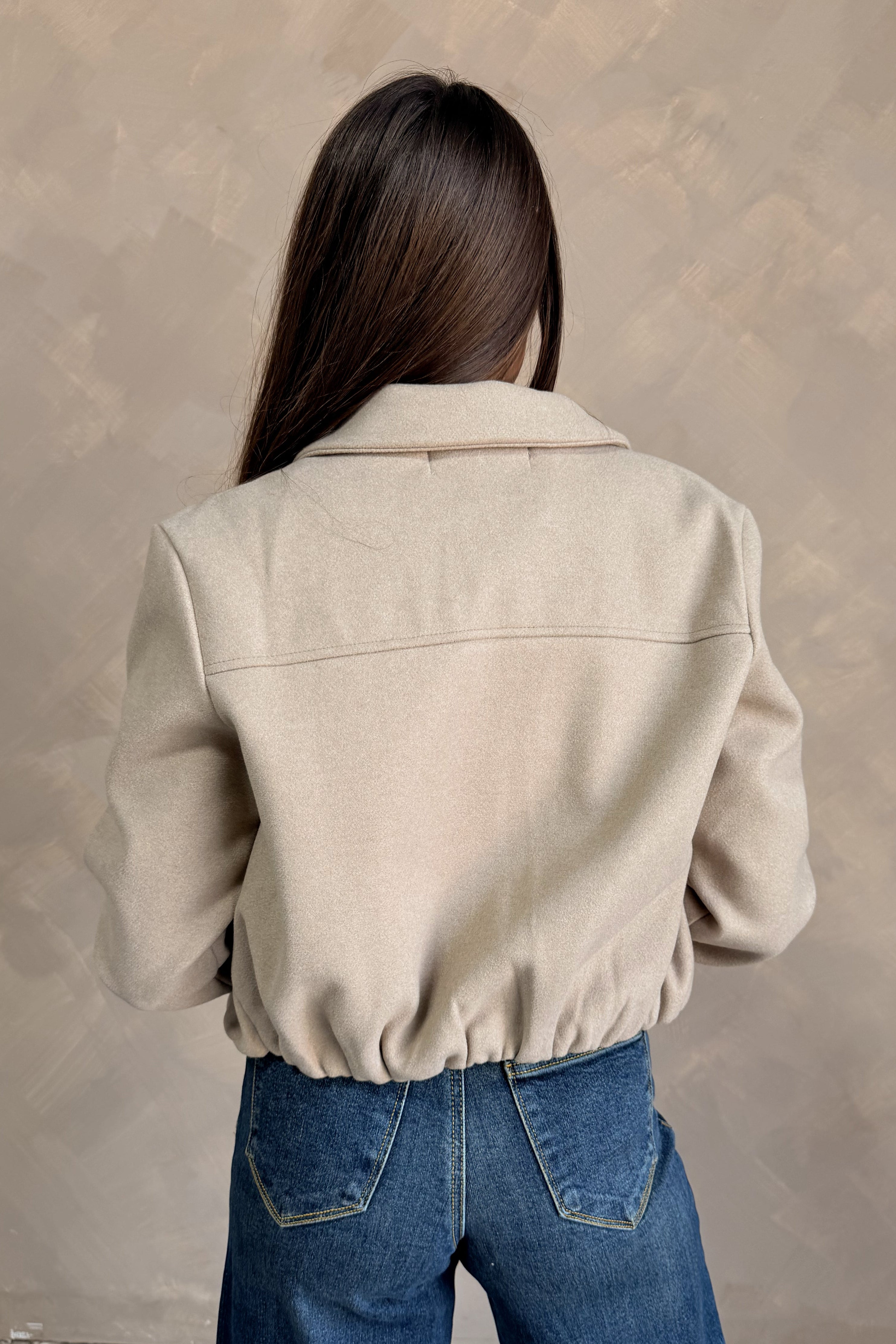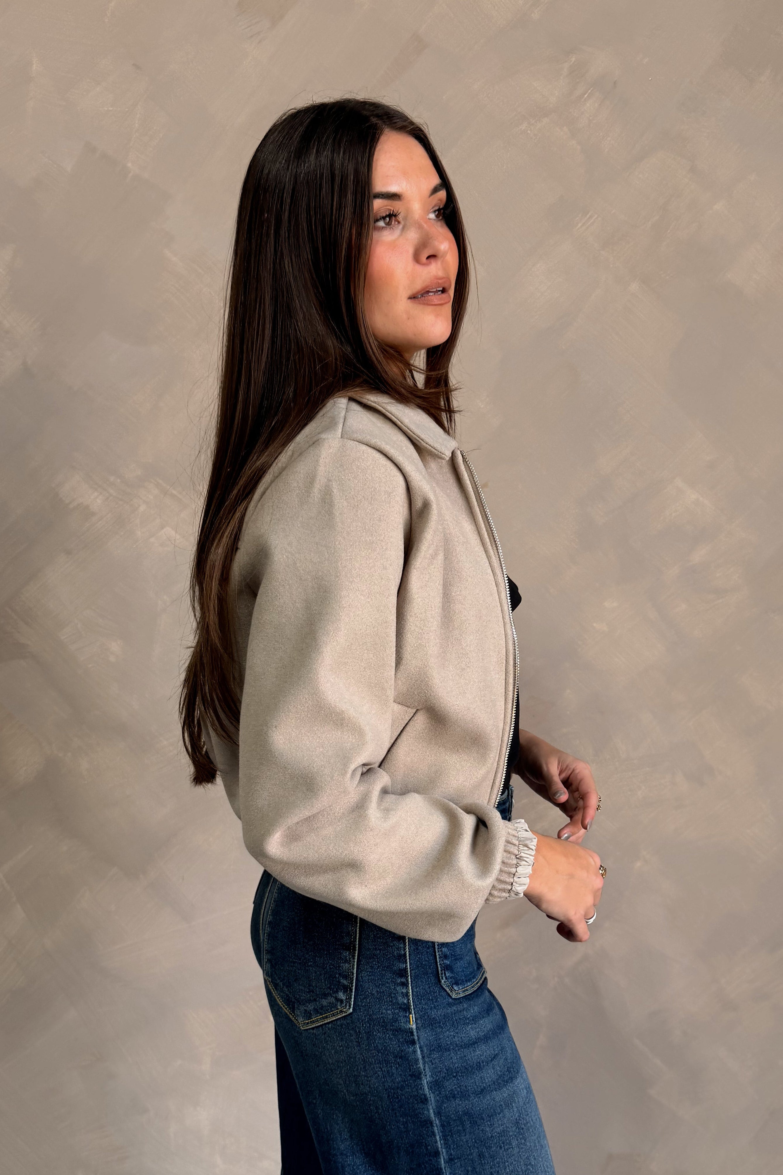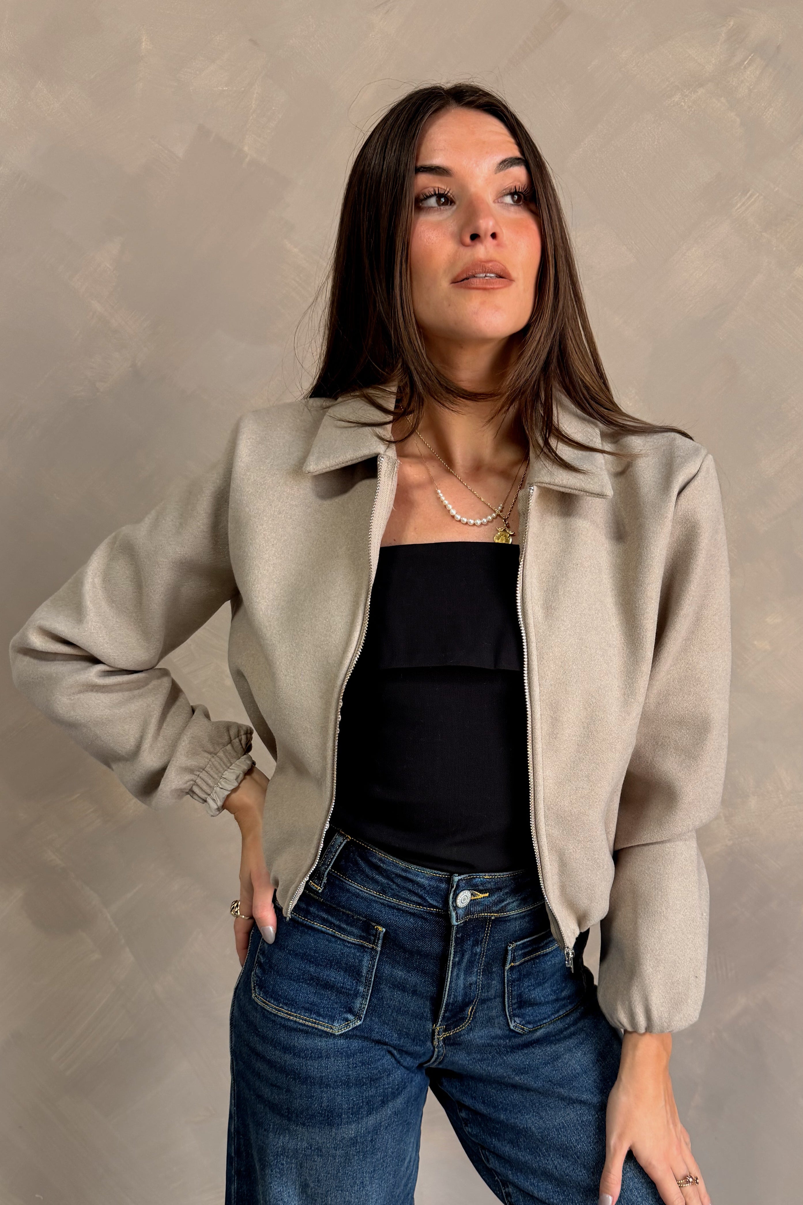 The Rosalind Beige Zip-Up Bomber Jacket is a versatile and stylish layer for transitional weather. Made with soft oatmeal fabric, it features a classic collar neckline and a front zip-up closure for a clean, polished look. The elastic waistband provides a flattering, comfortable fit. While front pockets add practicality for carrying essentials or keeping your hands cozy.