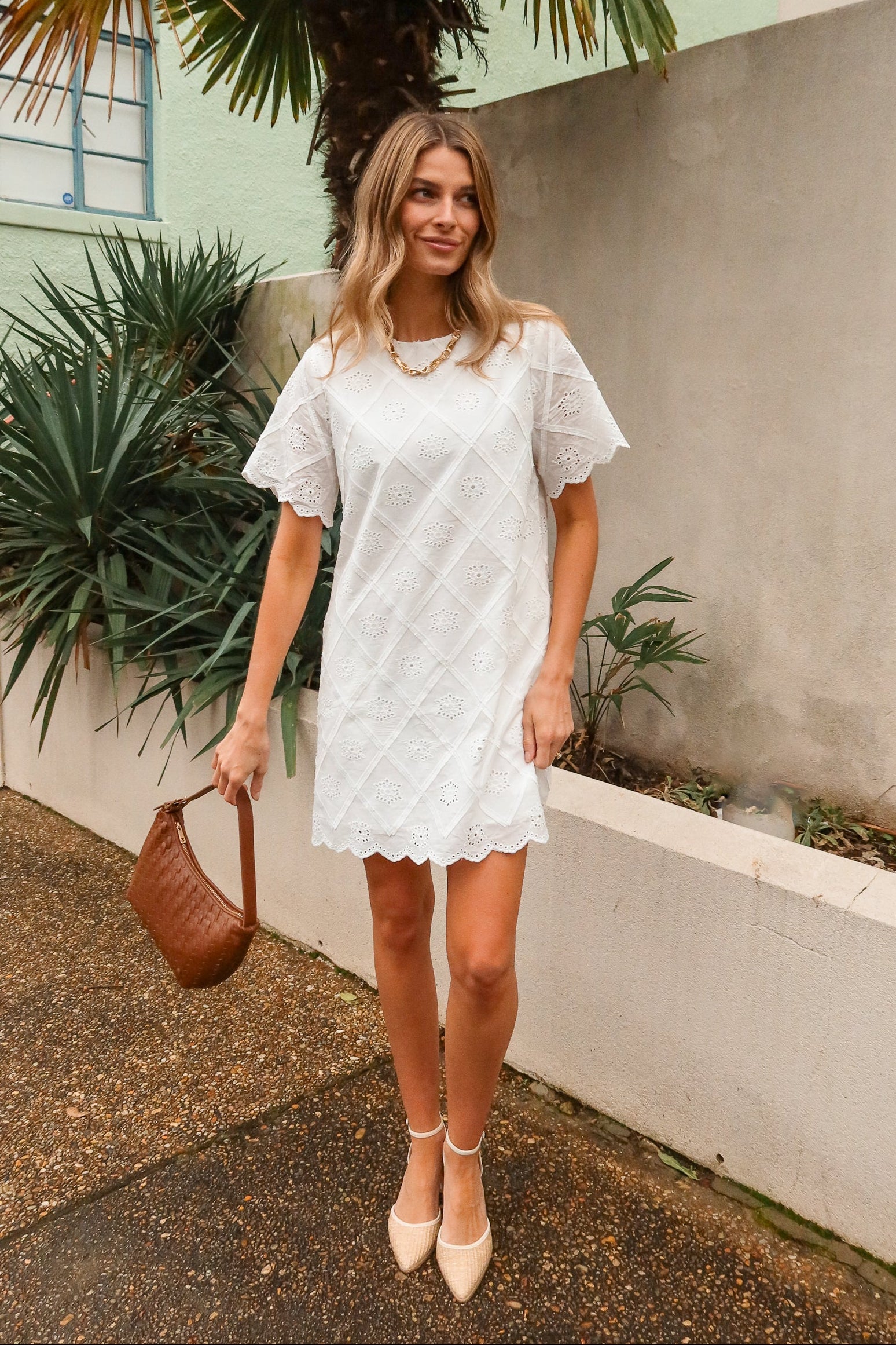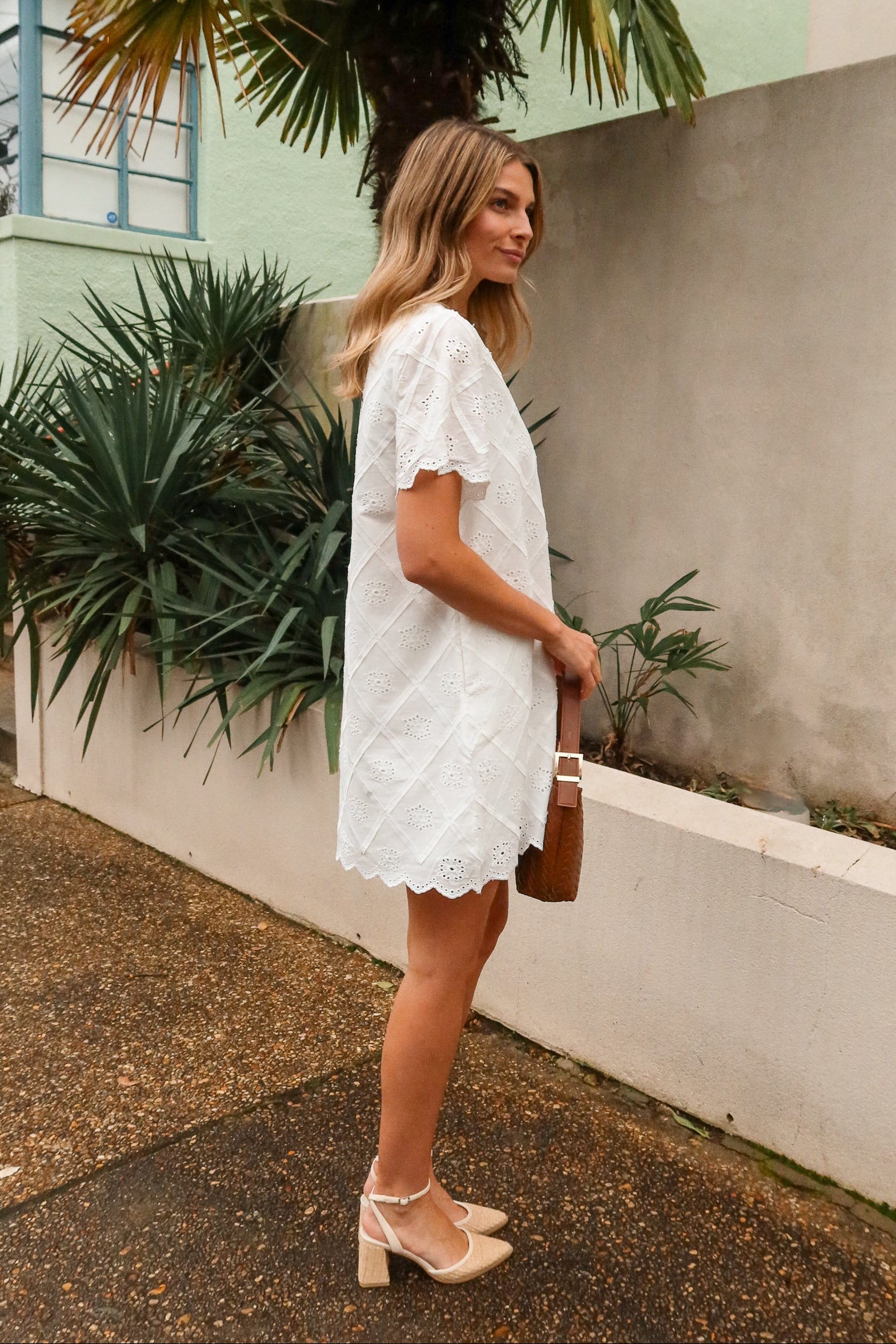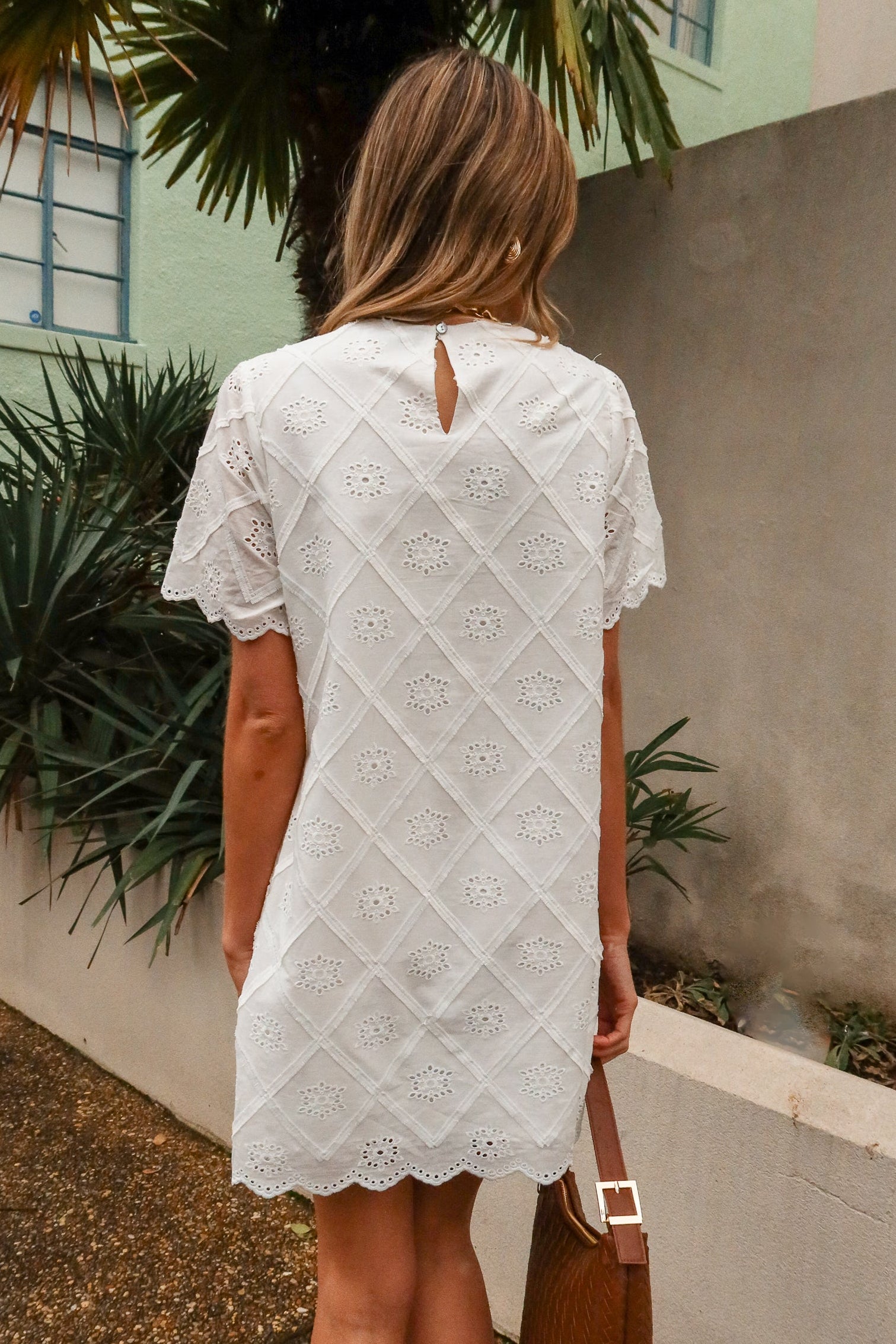 Delicate, playful, and effortlessly chic, the Rosaline White Eyelet Mini Dress is perfect for sunny days and weekend outings. Crafted from off-white eyelet fabric with a stitched diamond texture, this mini dress features a scalloped hem for a soft, feminine finish. Side pockets add practicality without sacrificing style, while the off-white lining ensures comfortable coverage.