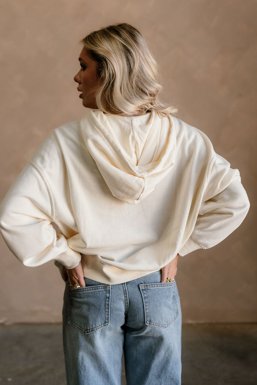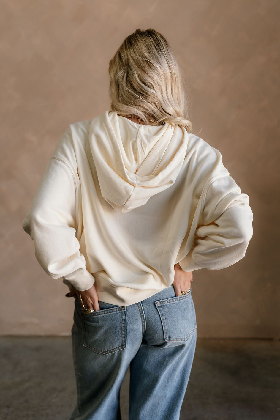 The Rowyn Cream Hoodie Sweatshirt is a soft, easygoing layer made from lightweight cream cotton fabric, giving it that perfect blend of comfort and breathability. It features a high neckline that adds a modern touch, along with an attached hood and drawstrings for those cozy, casual days. Dropped shoulders and long sleeves create a relaxed silhouette that feels effortless and laid-back.