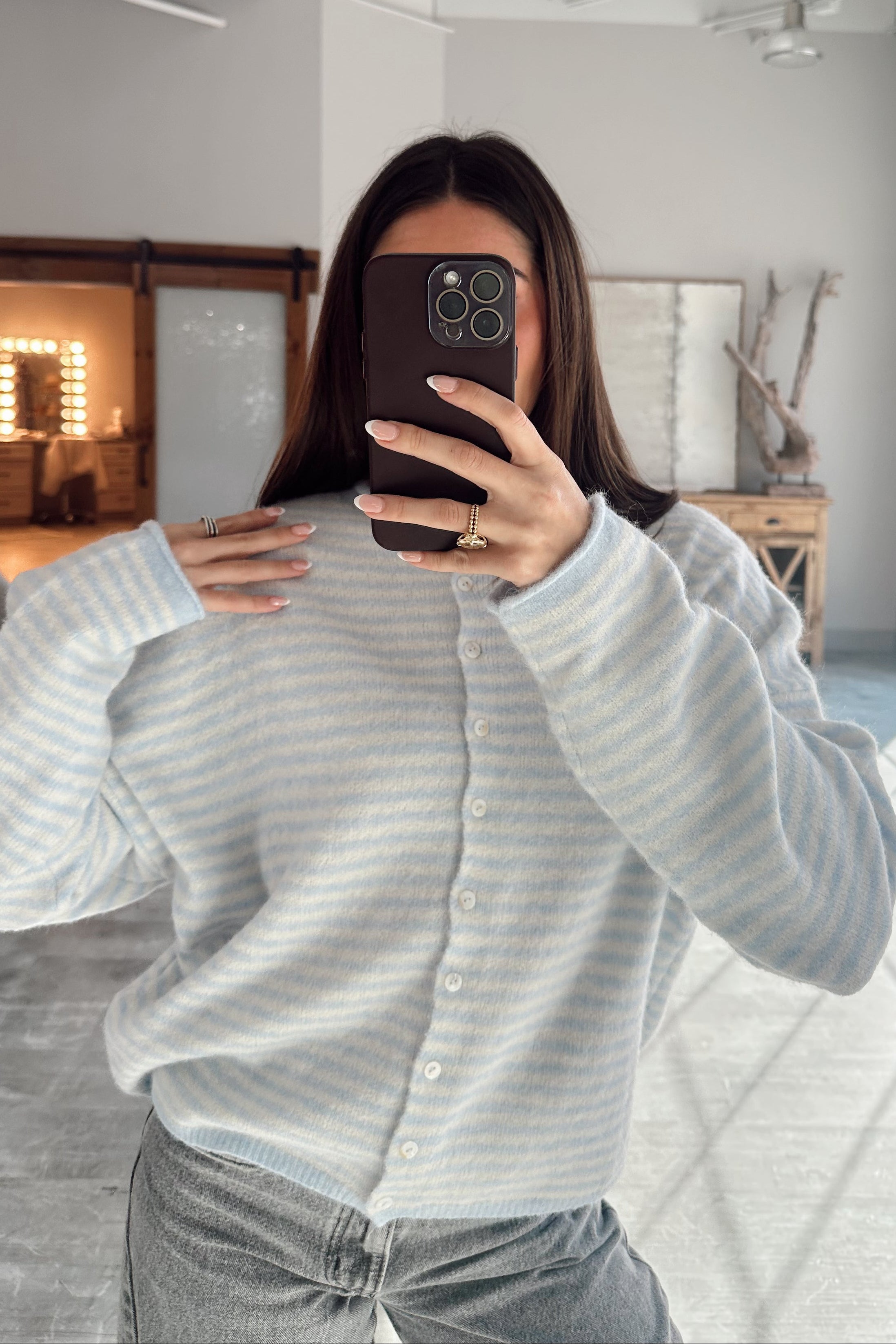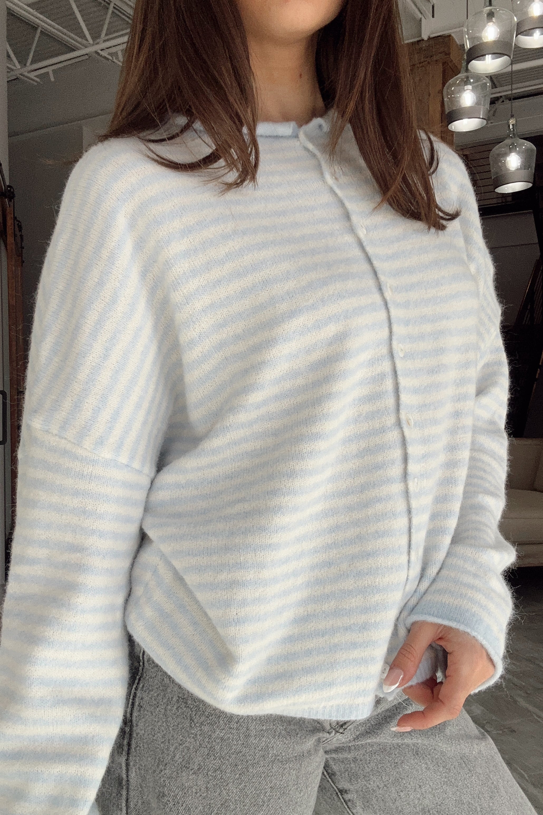 The Rowyn Light Blue & Cream Stripe Cardigan is a classic staple that blends cozy comfort with timeless charm, perfect for updating your everyday wardrobe.