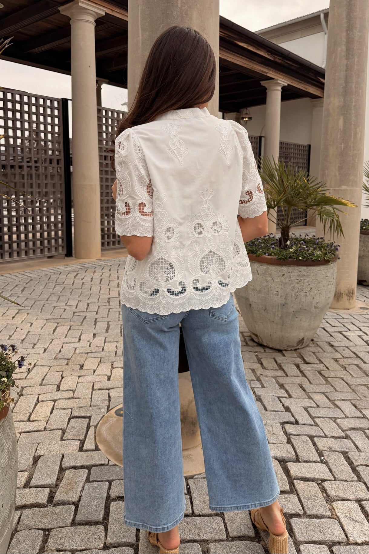 Delicate details meet effortless style in the Rowyn White Eyelet Stitch Scallop Top. Designed in an off-white lightweight fabric, this top features a monochrome eyelet stitch print that adds subtle texture and visual interest. A soft scallop hem brings a feminine finish, while the white lining provides comfortable coverage. The v-cutout round neckline adds a modern touch, balanced by easy short sleeves for everyday wear. Perfect for pairing with denim, skirts, or tailored bottoms, the Rowyn Top is a breezy yet polished piece that transitions seamlessly from casual days to elevated outings.